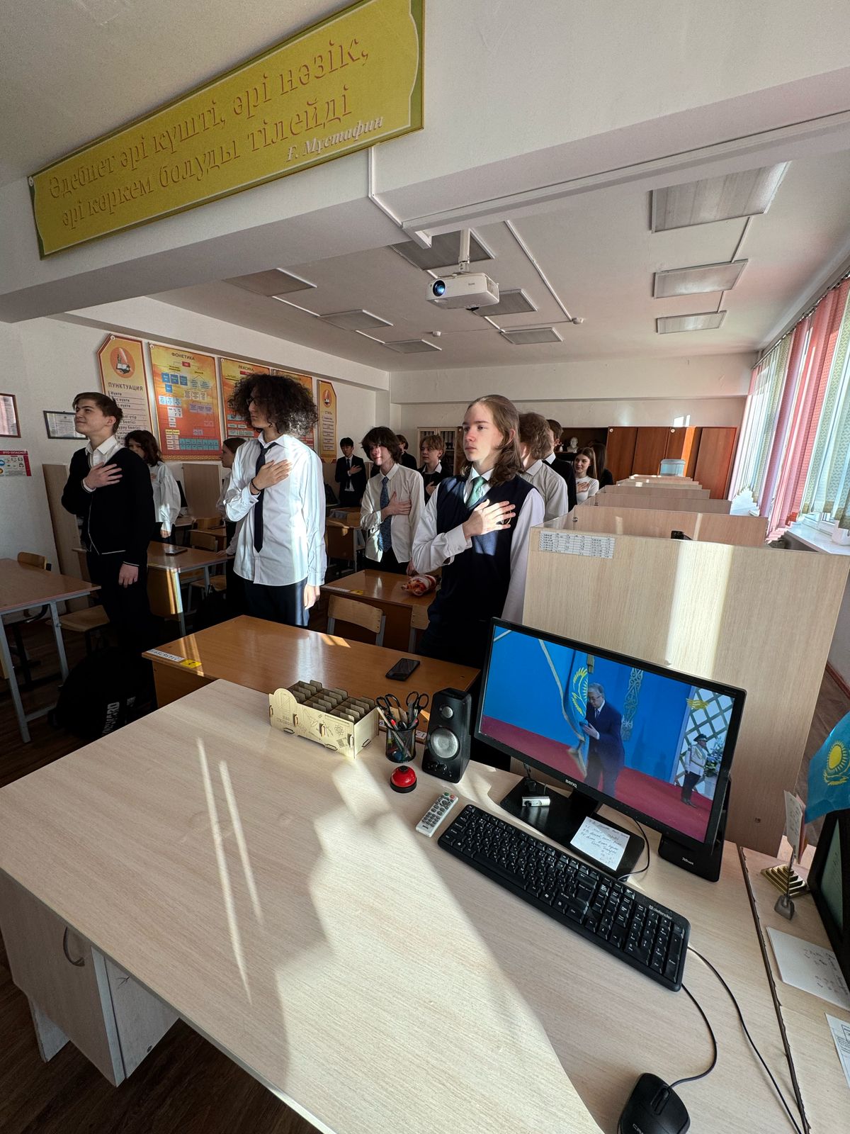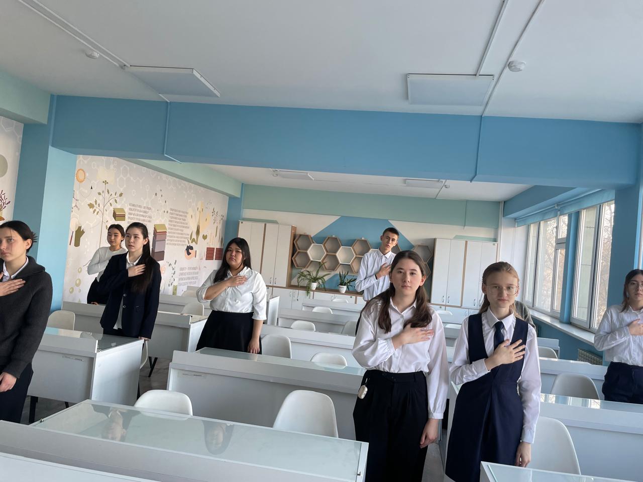 В рамках программы «Біртұтас тәрбие» в КГУ «Школа-лицей №28 им. М.Маметовой» был проведен классный час, в ходе которого был исполнен гимн Казахстана.