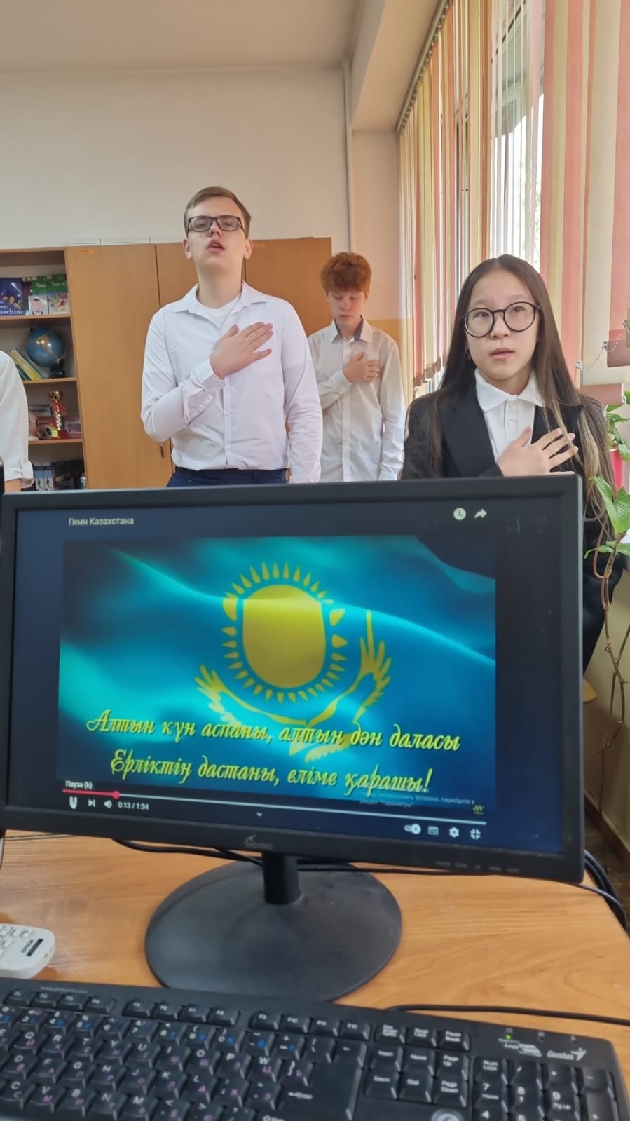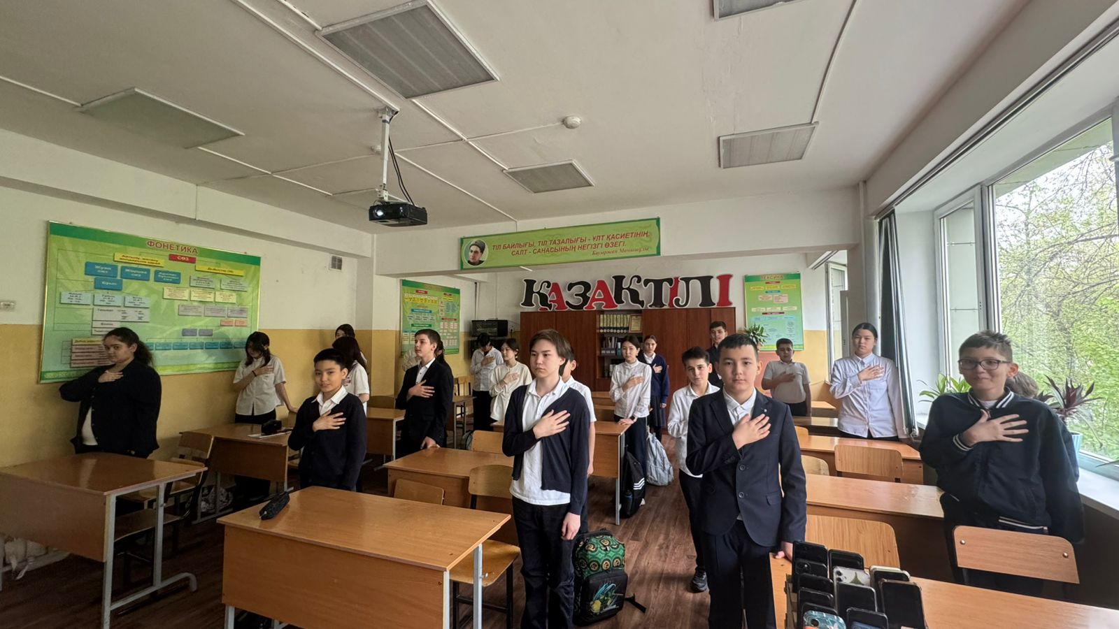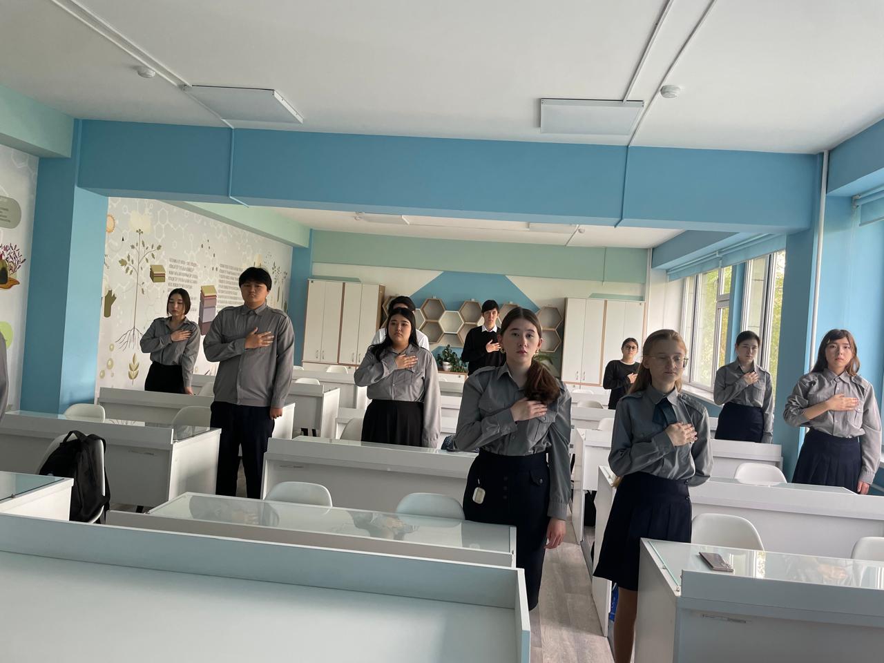 Сынып сағаты Қазақстан Республикасының Әнұранын орындаумен басталды — Отанға деген мақтаныш сезімімен және салтанатты түрде. Бұл маңызды құндылықтар мен жауапкершілік туралы әңгіменің жақсы бастамасы болды.