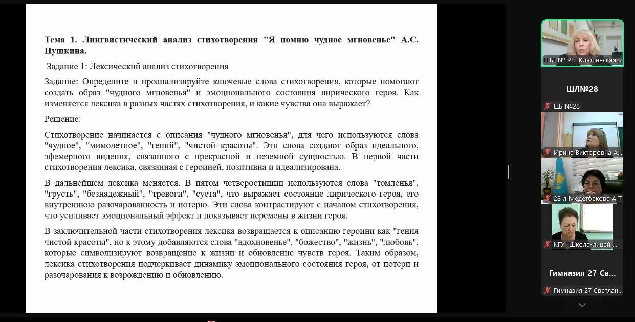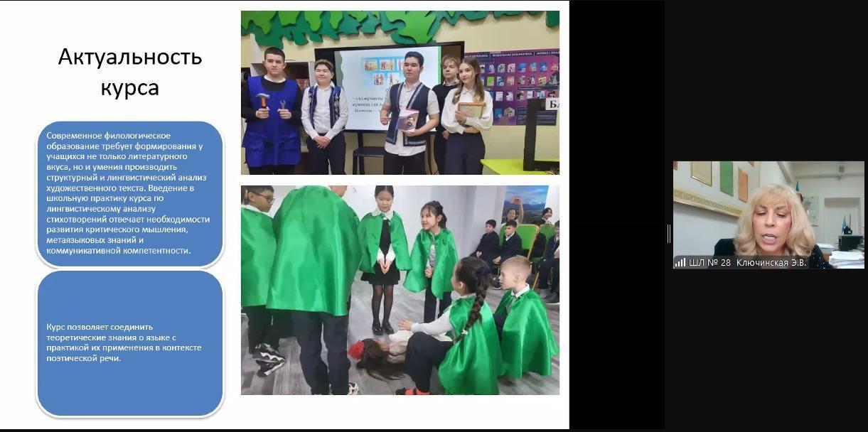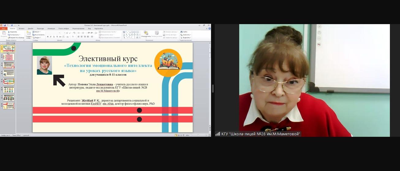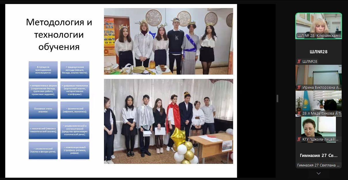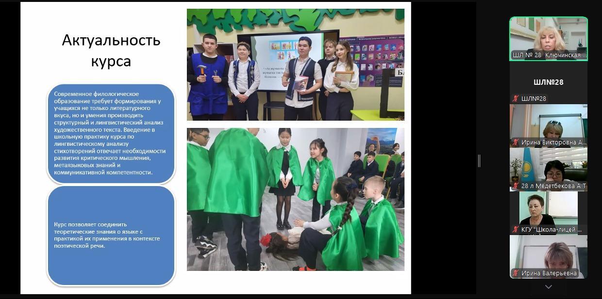 В рамках Правил и условий проведения аттестации педагогов в Республике Казахстан 23 апреля 2025 года состоялась Республиканская он-лайн конференция по трансляции практик на основе авторских программ учителей КГУ «Школа-лицей №28 им.М.Маметовой». Свои программы представили: Медетбекова А.Т. - учитель истории, «История Казахстана в лицах» для учащихся 11 классов; Иванова М.В. учитель географии, «Карта – язык географии» для учащихся 7-9 классов; Ключинская Э.В. - учитель русского языка и литературы «Лингвистический анализ стихотворений» для учащихся 8 классов; Криворучко И.П. - учитель начальных классов «Объединение предметов в начальной школе для повышения интереса к учёбе»; Дубикина И.В. - учитель начальных классов «Технология формирования навыков критического мышления у учащихся начальных классов»; Абросимова И.В. - учитель начальных классов «Анализ ошибок в письменных работах учащихся в начальной школе и методы их коррекции»; Джунь Н.В. - учитель начальных классов «Современный русский язык: онлайн путешествие»; Краузе И.Г. -учитель начальных классов «Технология формирования учебной компетентности младших школьников»; Мингалёва Л.В. - учитель экономики «Основы экономической и финансовой грамотности в школе»; Волгаева Т.А. - учитель русского языка и литературы «Слово-образ-смысл: анализ литературного произведения» для учащихся 8 классов; Попова Э.Л. - учитель русского языка и литературы «Технология эмоционального интеллекта на уроках русского языка». Слушателями он-лайн трансляции были учителя г.Алматы, Костаная (Костанайская область), Кербулакский район, Жетисуйская область. Спасибо коллеги за трансляцию передового педагогического опыта городского уровня. Будем применять на практике Ваши Авторские Программы!