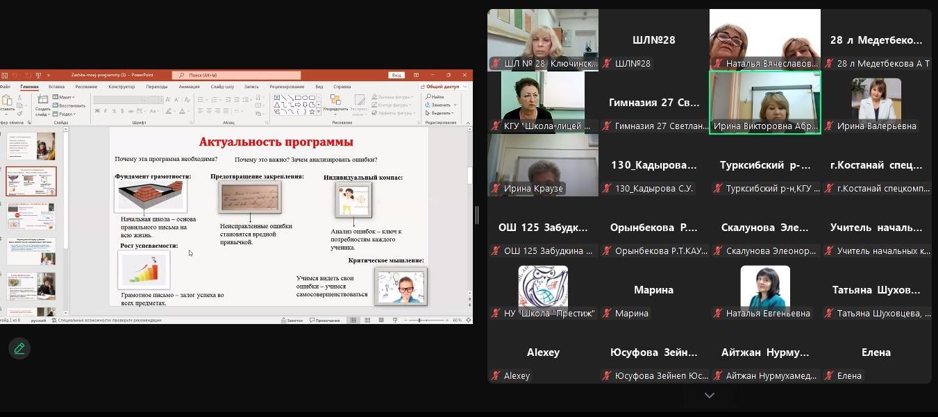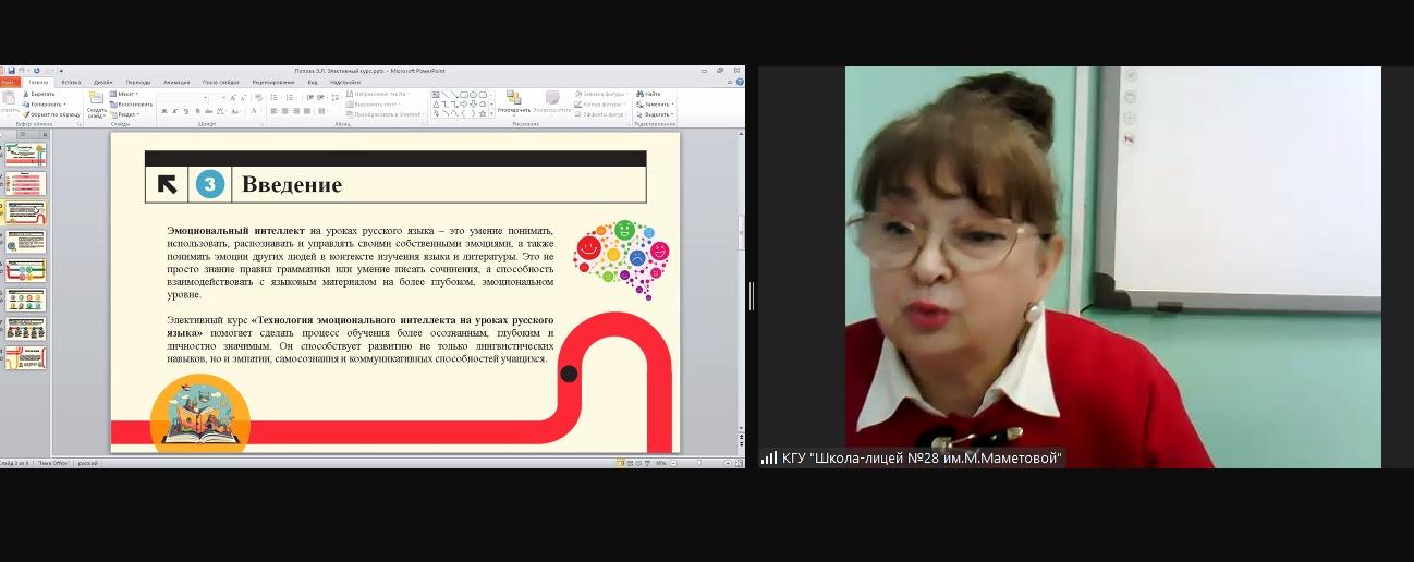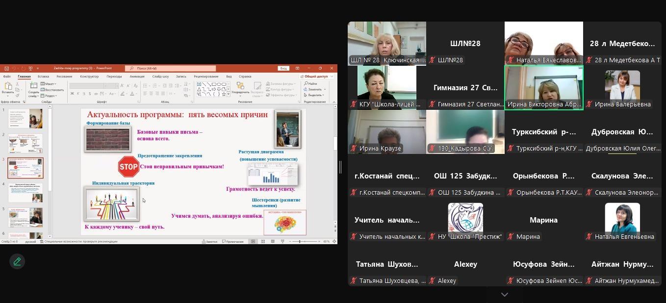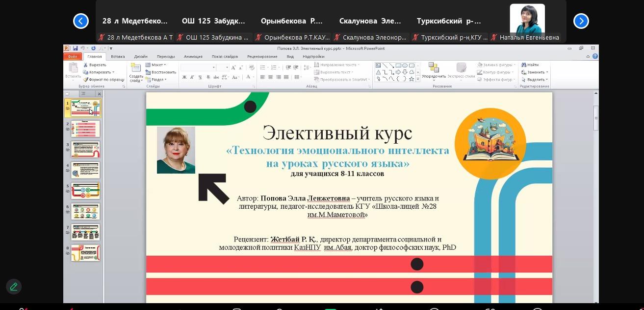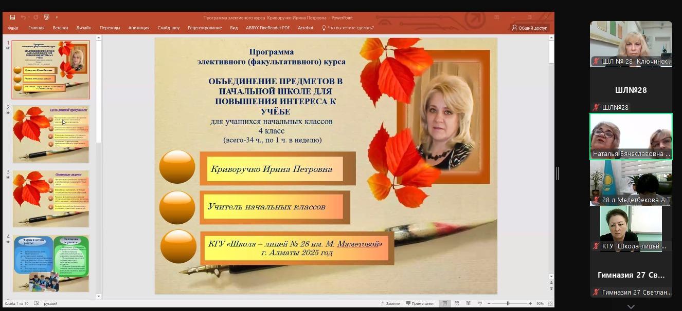 В рамках Правил и условий проведения аттестации педагогов в Республике Казахстан 23 апреля 2025 года состоялась Республиканская он-лайн конференция по трансляции практик на основе авторских программ учителей КГУ «Школа-лицей №28 им.М.Маметовой». Свои программы представили: Медетбекова А.Т. - учитель истории, «История Казахстана в лицах» для учащихся 11 классов; Иванова М.В. учитель географии, «Карта – язык географии» для учащихся 7-9 классов; Ключинская Э.В. - учитель русского языка и литературы «Лингвистический анализ стихотворений» для учащихся 8 классов; Криворучко И.П. - учитель начальных классов «Объединение предметов в начальной школе для повышения интереса к учёбе»; Дубикина И.В. - учитель начальных классов «Технология формирования навыков критического мышления у учащихся начальных классов»; Абросимова И.В. - учитель начальных классов «Анализ ошибок в письменных работах учащихся в начальной школе и методы их коррекции»; Джунь Н.В. - учитель начальных классов «Современный русский язык: онлайн путешествие»; Краузе И.Г. -учитель начальных классов «Технология формирования учебной компетентности младших школьников»; Мингалёва Л.В. - учитель экономики «Основы экономической и финансовой грамотности в школе»; Волгаева Т.А. - учитель русского языка и литературы «Слово-образ-смысл: анализ литературного произведения» для учащихся 8 классов; Попова Э.Л. - учитель русского языка и литературы «Технология эмоционального интеллекта на уроках русского языка». Слушателями он-лайн трансляции были учителя г.Алматы, Костаная (Костанайская область), Кербулакский район, Жетисуйская область. Спасибо коллеги за трансляцию передового педагогического опыта городского уровня. Будем применять на практике Ваши Авторские Программы!