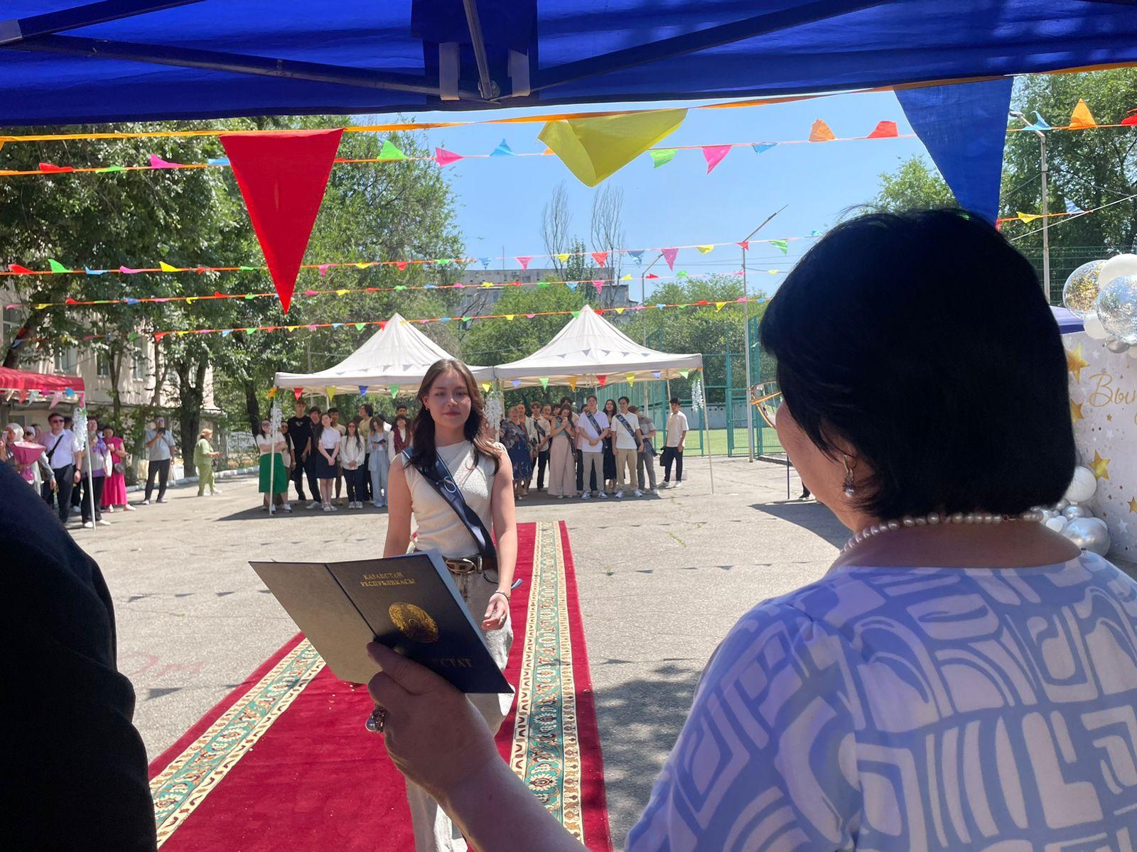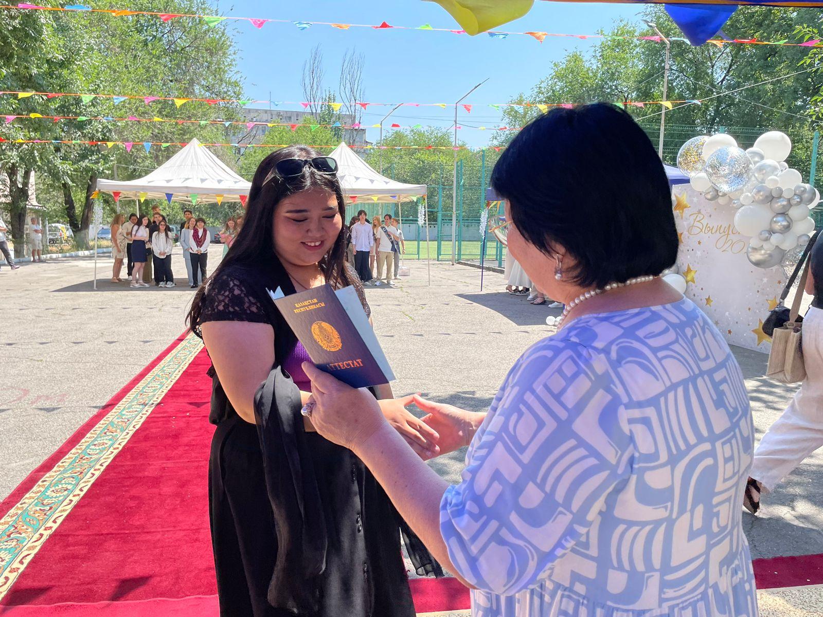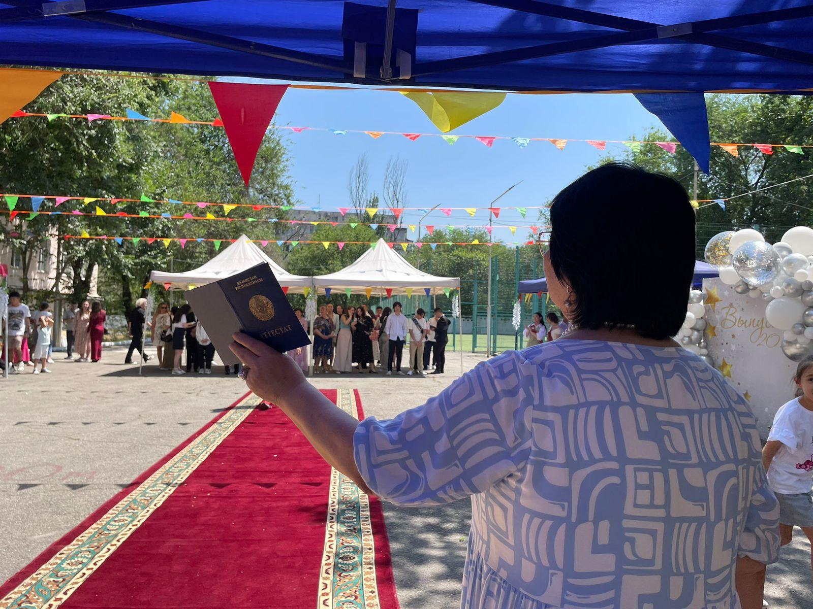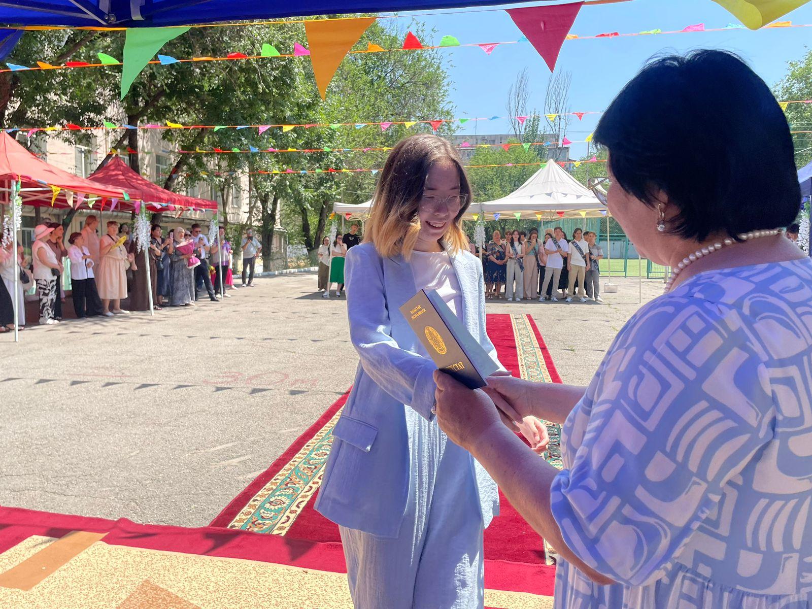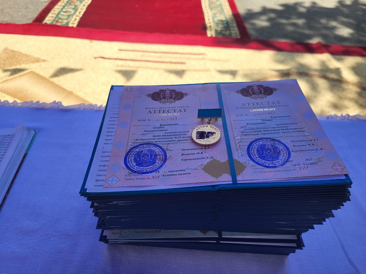 19 июня 2025 года в КГУ «Школа-лицей №28 им.М.Маметовой» состоялось торжественное мероприятие, посвящённое вручению аттестатов выпускникам 2025 года. Этот день – итог огромного пути, наполненного знаниями, трудами, победами и открытиями. Мы с гордостью провожаем наших учеников в новую, взрослую жизнь. Позади школьные годы, впереди – большие мечты, университеты, профессии и новые горизонты! С поздравительным словом к выпускникам обратилась директор Медетбекова А.Т.: «Құрметті мектеп бітіруші түлектер, қадірлі ата-аналар, ұстаздар, қонақтар! Бүгін ерекше салтанатты күн! Сіздерді үлкен өмірге шығарып салғалы отырмыз. Сегодня – особенный день, торжественный и волнительный. Мы провожаем в большую, самостоятельную жизнь наших выпускников – сильных, умных, талантливых и уже таких взрослых. Этот день – не просто итог ещё одного учебного года. Это завершение важного этапа в жизни каждого из вас, дорогие выпускники. За плечами — годы, наполненные трудами, открытиями, победами и, конечно, поддержкой близких. Мы вместе с вами проходили через трудности и радовались успехам. И сегодня вы стоите здесь — уверенные, с горящими глазами, готовые к новому пути. Позади осталась школьная пора – время, когда вы учились не только математике, физике и литературе, но и дружбе, взаимопомощи, ответственности.