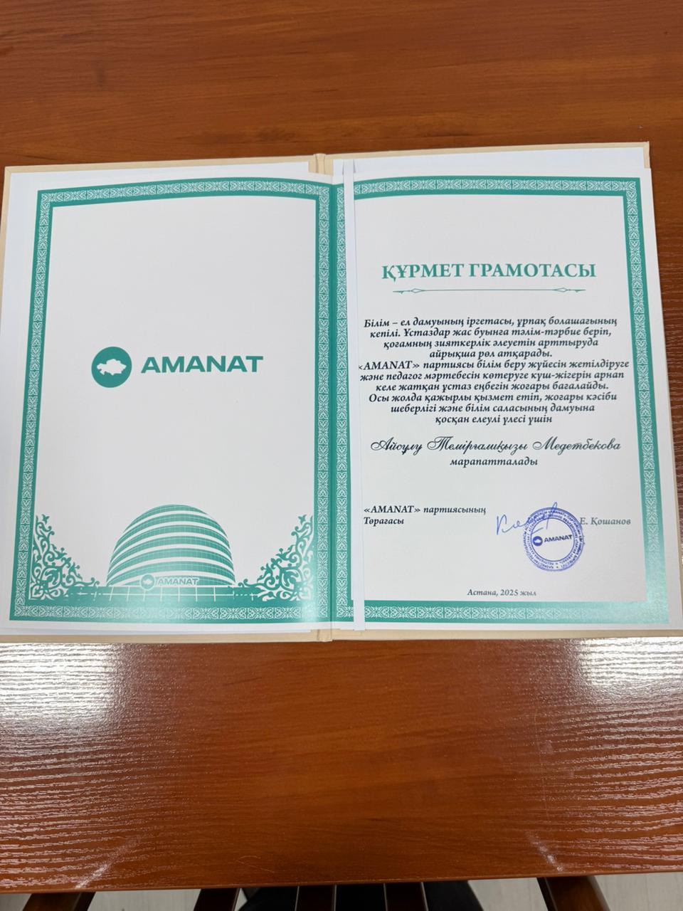 Марапатталғандардың қатарында – М.Маметова атындағы №28 мектеп-лицейінің директоры, Медетбекова Айсулу Темірғалиевна бар. Ол «AMANAT» партиясының Орталық аппараты тарапынан партия Төрағасы Ерлан Қошановтың қолы қойылған Құрмет грамотасымен, сондай-ақ партияның қалалық филиалы атынан Алғыс хатпен марапатталды.