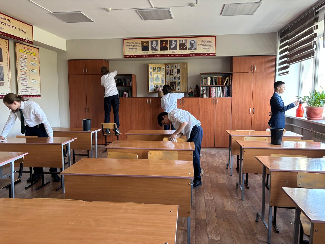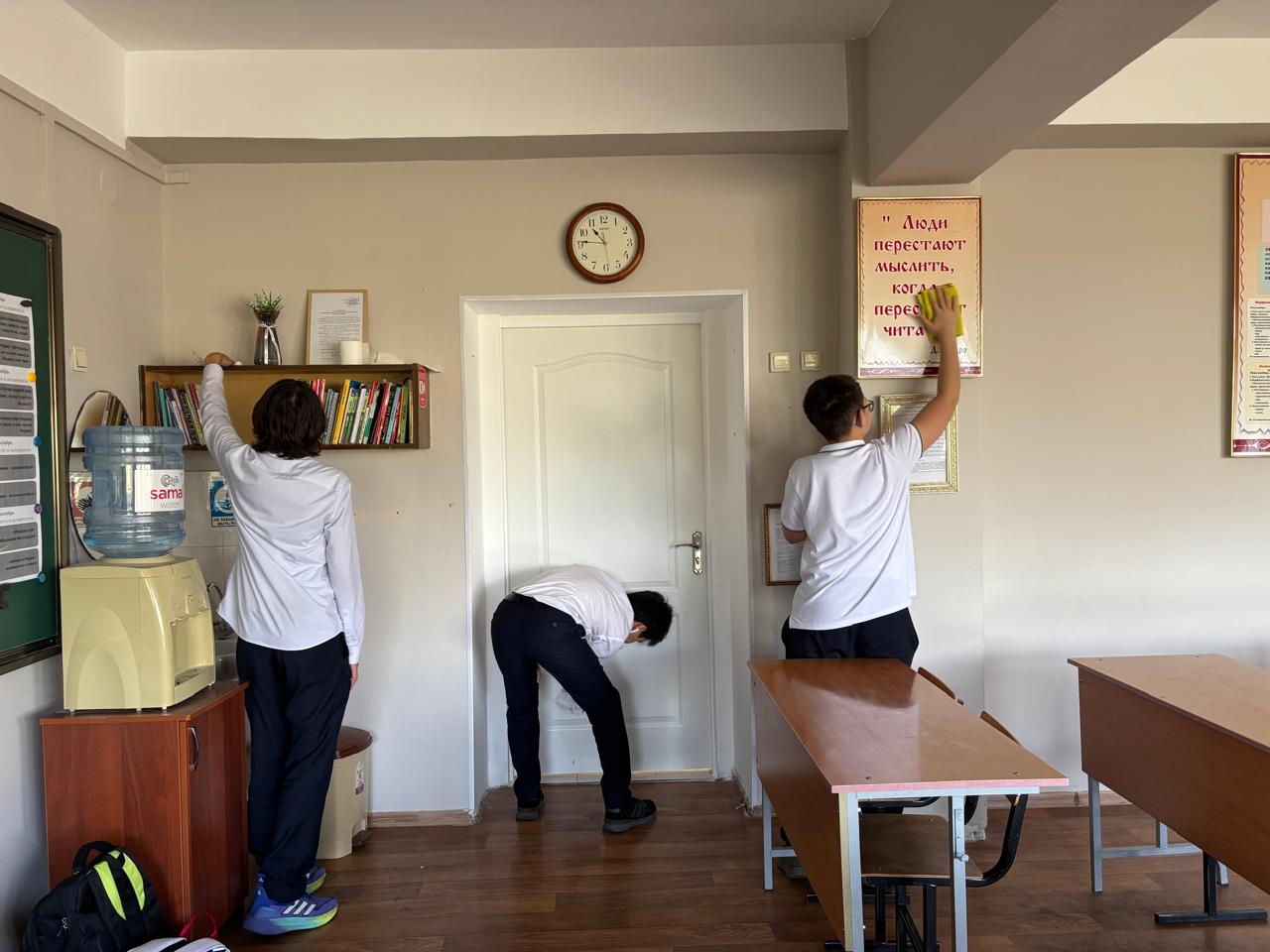 Бүгін оқушылар «Тазалық бейсенбісі» акциясына қатысып, оқу кабинеттерінде тазалық жұмыстарын жүргізді. Олар парта мен тақталарды сүртіп, оқу материалдарын ретке келтіріп, сыныптарды безендірді.