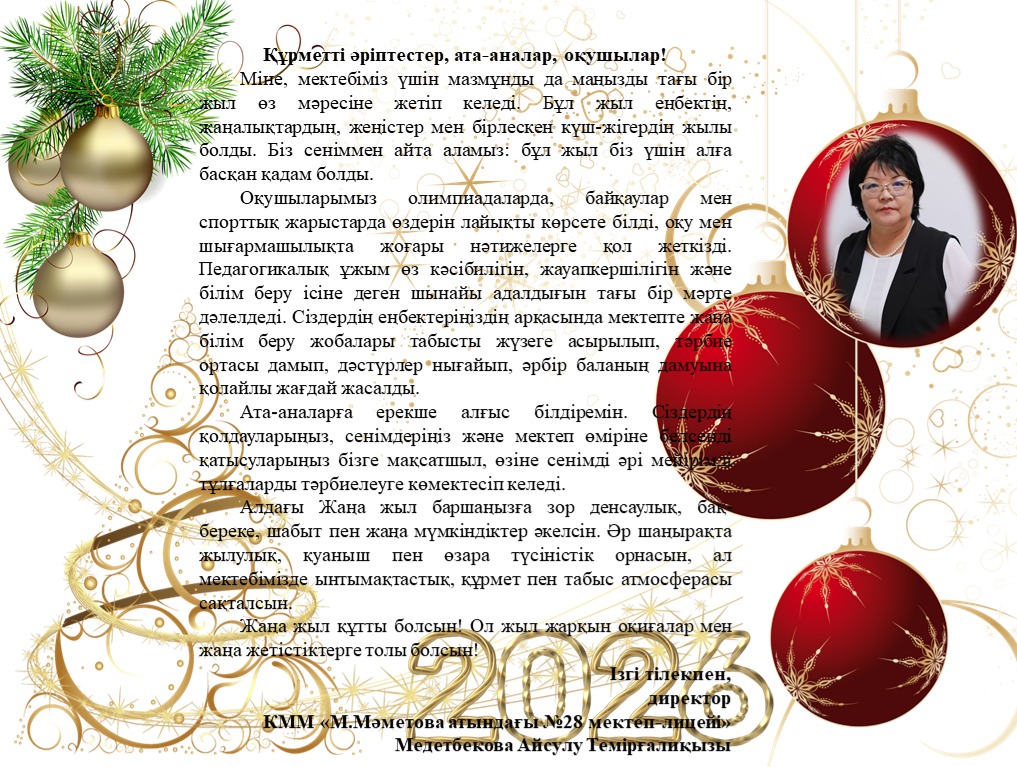 Жаңа жыл қуаныш, мықты денсаулық, жаңа мақсаттар мен мүмкіндіктер әкелсін. Әр күніміз жылылыққа, күлімсіреуге және жақсылыққа сенімге толы болсын, ал мектебіміз әрі қарай өсу, достық және табыс мекені болып қала берсін 🌟.