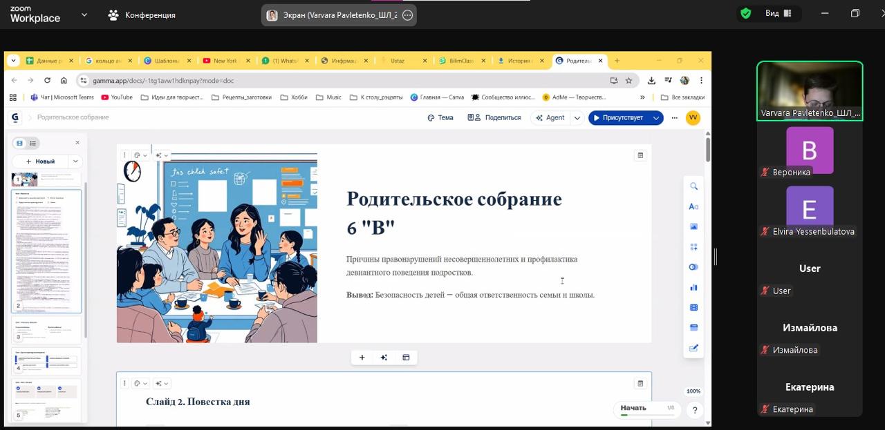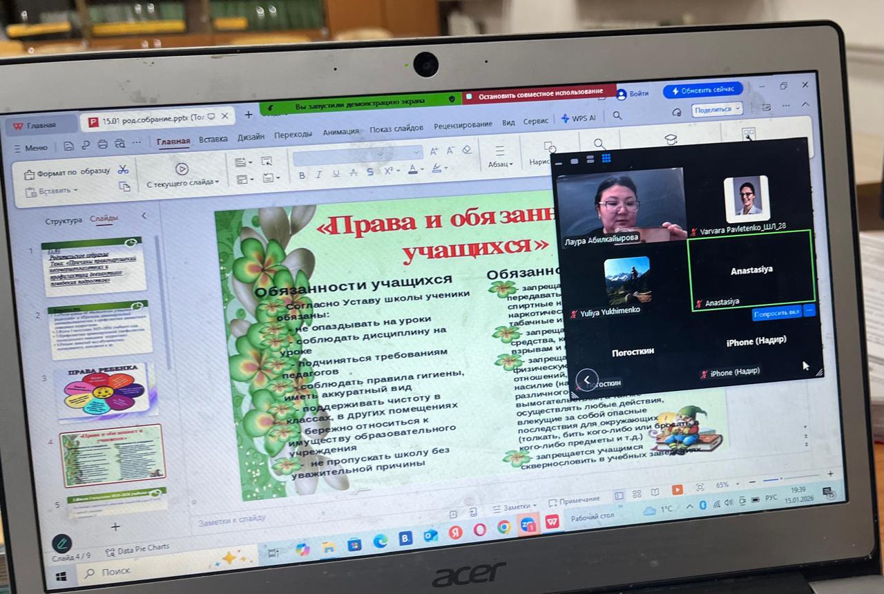 Собрание прошло в онлайн и офлайн форматах. Были рассмотрены вопросы школьного устава об обязанностях учащихся и родителей, причины правонарушений несовершеннолетних, подведены итоги I полугодия 2025–2026 учебного года, а также подготовка к PISA, ГИА и ЕНТ (10–11 классы). Особое внимание уделено профилактике суицидального поведения, наркомании и табакокурения, религиозного экстремизма, интернет-зависимости, ВИЧ-инфекции, а также пропаганде ЗОЖ.