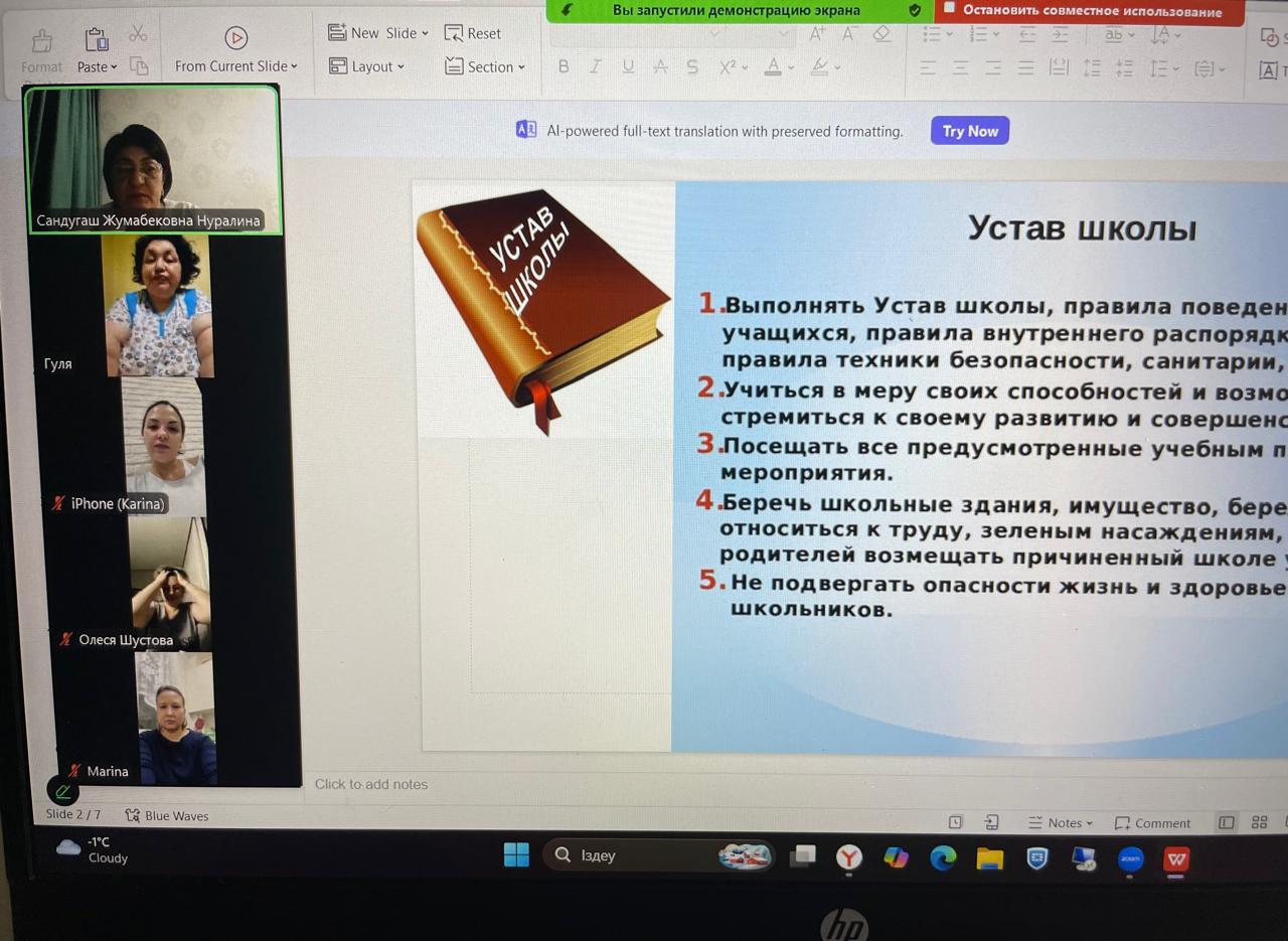 Жиналыс онлайн және офлайн форматта өтіп, мектеп уставы, оқу-тәрбие үдерісіндегі маңызды мәселелер, сондай-ақ жасөспірімдердің құқық бұзушылық себептері және девиантты мінез-құлықты алдын алу жолдары талқыланды.