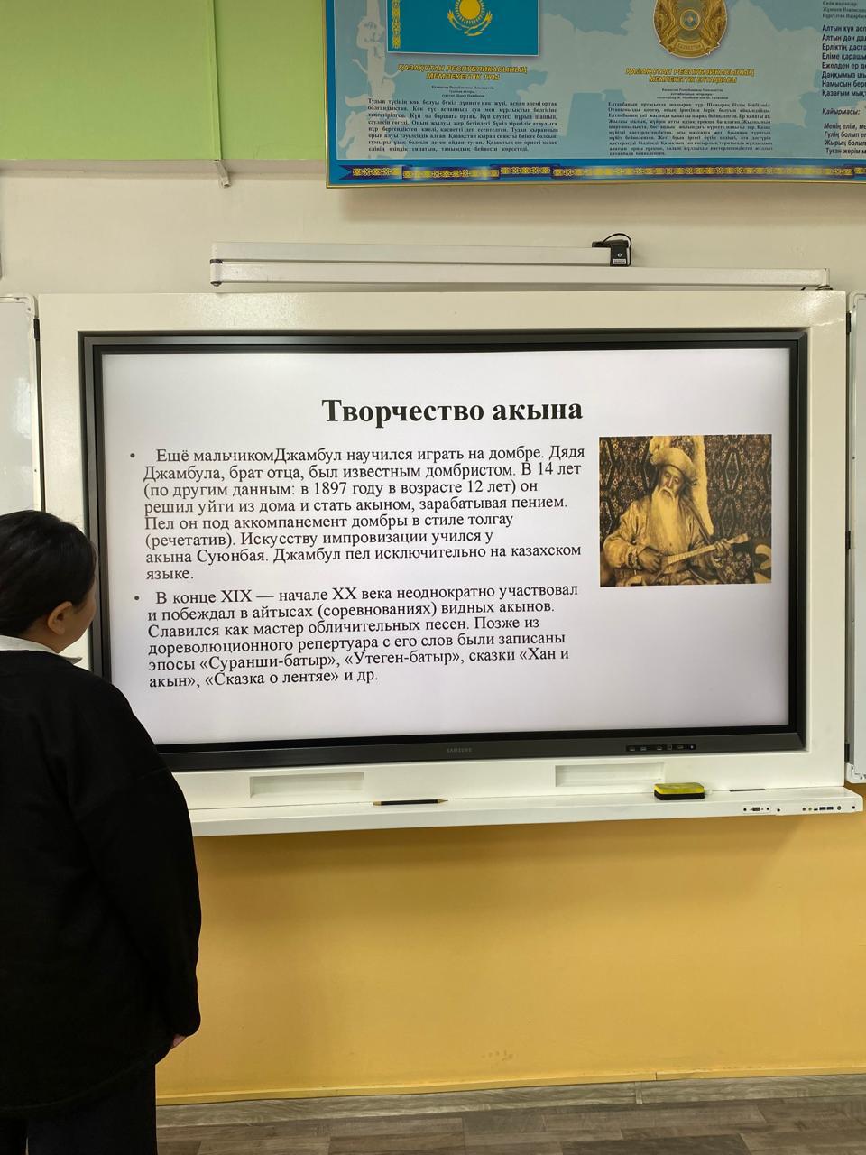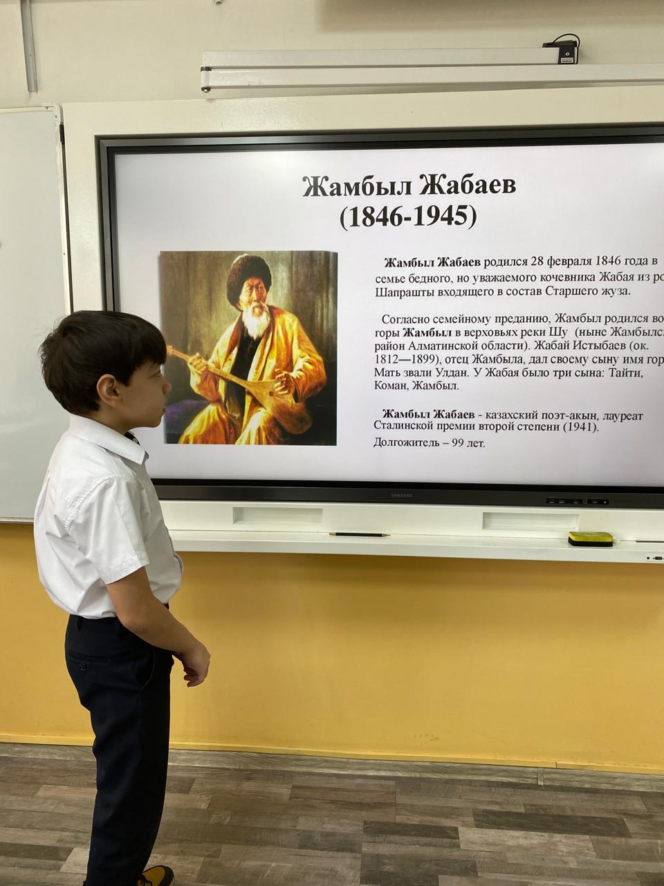 В КГУ «Школа-лицей №28 имени М. Маметовой» 28 февраля был проведён классный час, посвящённый 180-летию со дня рождения великого поэта, народного певца и классика казахской поэзии Жамбыла Жабаева (1846–1945). В ходе классного часа учащиеся познакомились с жизнью и творчеством поэта, обсудили значение его произведений, проникнутых духом патриотизма, мудрости и любви к родному народу.