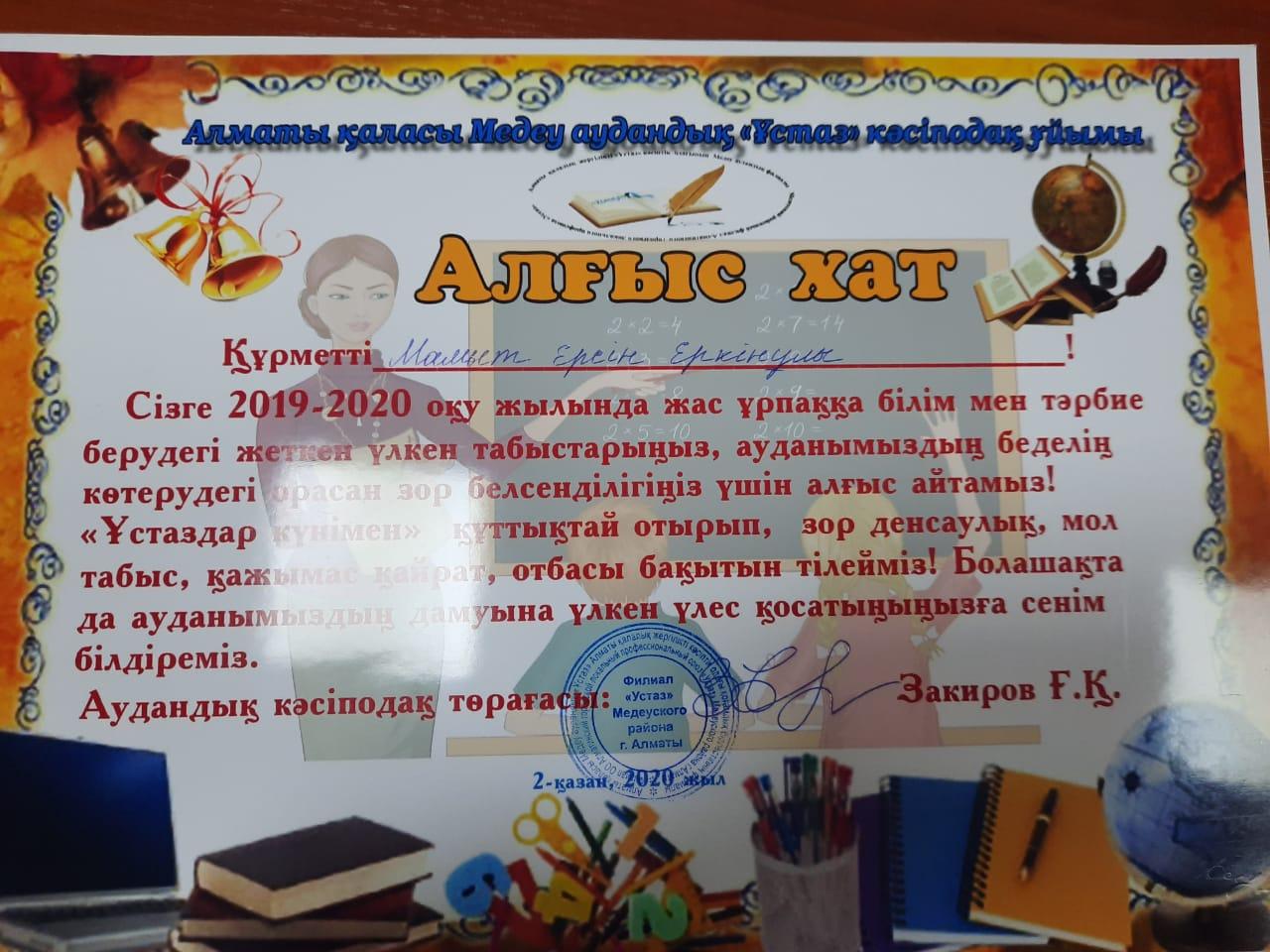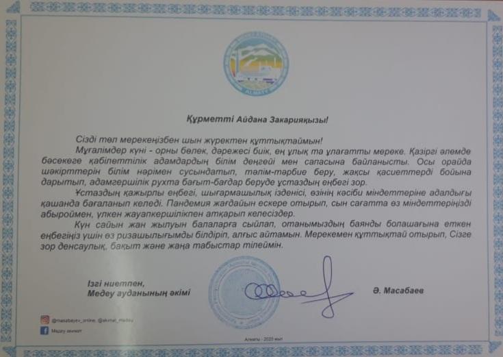 В преддверии профессионального праздника Дня учителя, наши учителя КГУ «Школы-лицей №28 им.М.Маметовой» получили заслуженные благодарности и грамоты за свой труд, творчество и самоотдачу. Медетбекова Айсулу Темиргалиевна – директор, учитель истории, Болатхан Адана Закарияқызы – учитель казахского языка и литературы - благодарственные письма от Акима Медеуского района, Джунь Наталья Вячеславовна – Почетную грамоту от Общественного объединения «Аматинский городской локальный профессиональный союз «Устаз»», Мамыт Ерсін Еркінұлы – учитель физической культуры, Христофориди Константин Харламович – учитель физической культуры - благодарственные письма от филиала профсоюзного союза «Устаз» Медеуского района. От всей души поздравляем наших учителей с профессиональным праздником и желаем вам легкого профессионального пути. Пусть все надежды оправдываются, замыслы – станут реальностью, а работа приносит только удовлетворение и хорошие новости о ваших подопечных. С Днем учителя!