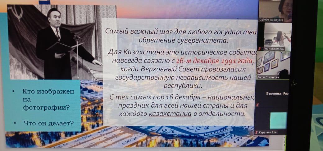 15.12.2020 в КГУ "Школа-лицей №28 им. М. Маметовой" состоялся Единый классный час на тему: «Казахстан - Земля мира и согласия» в преддверии «Дня независимости Республики Казахстан».
