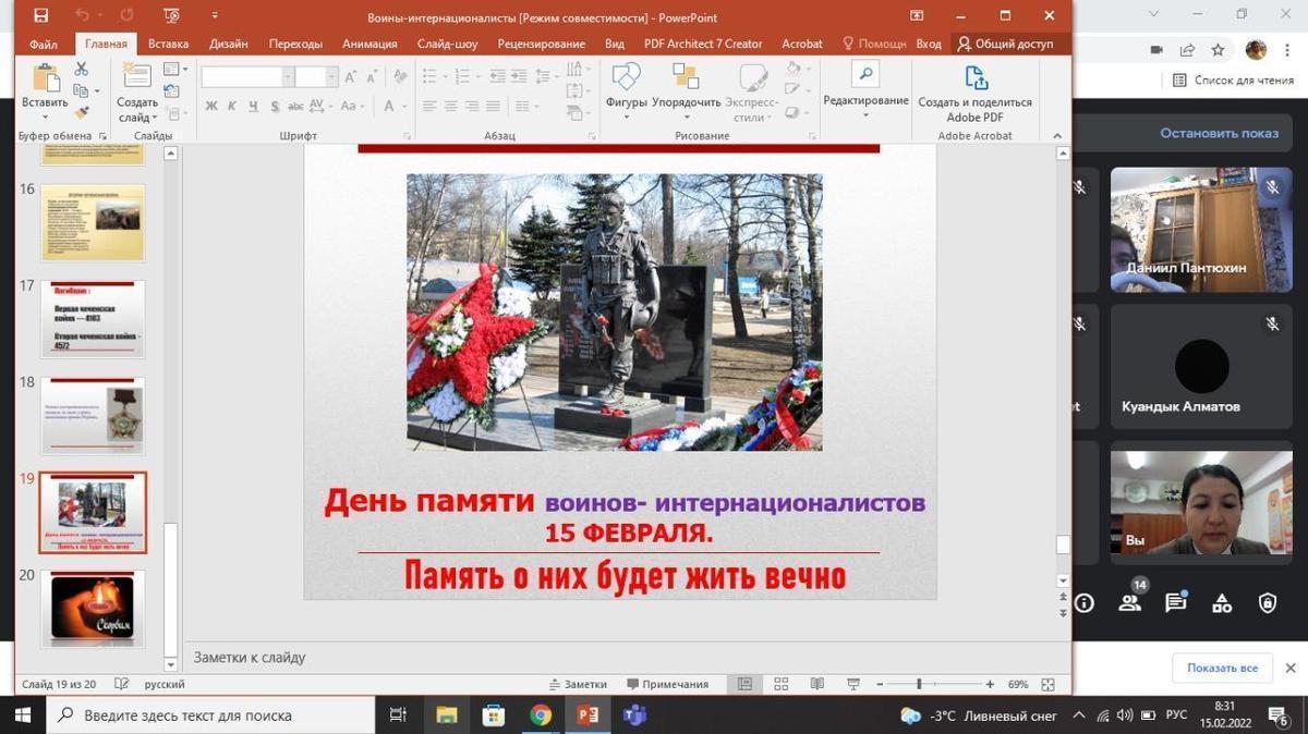 15.02 в школе-лицей №28 им. М.Маметовой среди 1-11 классов прошли классные часы на тему: «День памяти воинов-интернационалистов». 15 февраля особая дата в новейшей истории. В этот день мы отмечаем «День памяти воинов-интернационалистов», исполнявших интернациональный долг за пределами границ своей Родины.