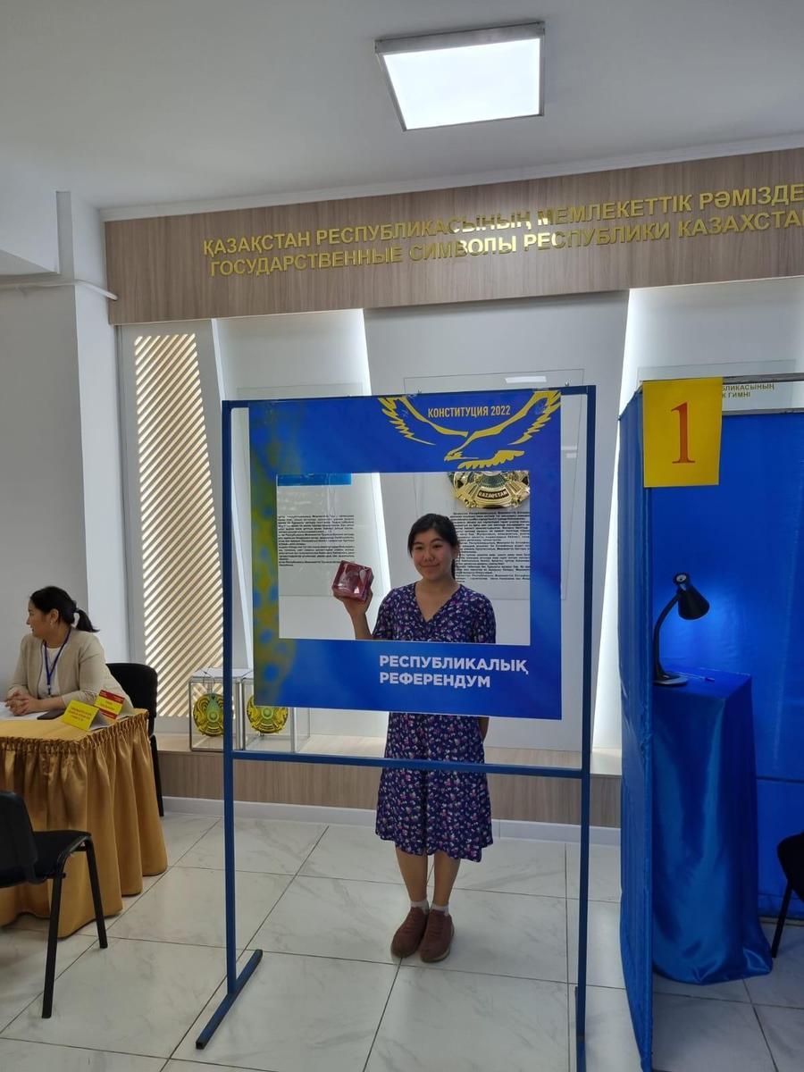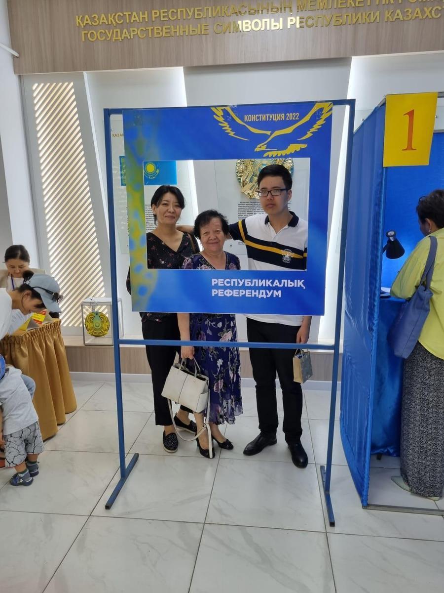 В Казахстане 5 июня 2022 года стартовал референдум по изменению Конституции. Традиционно на каждом избирательном участке есть впервые голосующие молодые люди, избирательный участок №358 в КГУ «Школа-лицей №28 им.М.Маметовой» не стал исключением, одной из первых проголосовала со своей семьей Даулетбакова Софья, выпускница школы-лицея 2020-2021 года. «Сегодня со мной свой на участке побывали моя семья. Считаю, что своим голосом вложила собственный вклад в процветание нашей страны.» Так же выпускник этого учебного года Таласбаев Алишер, пришел с мамой и бабушкой.