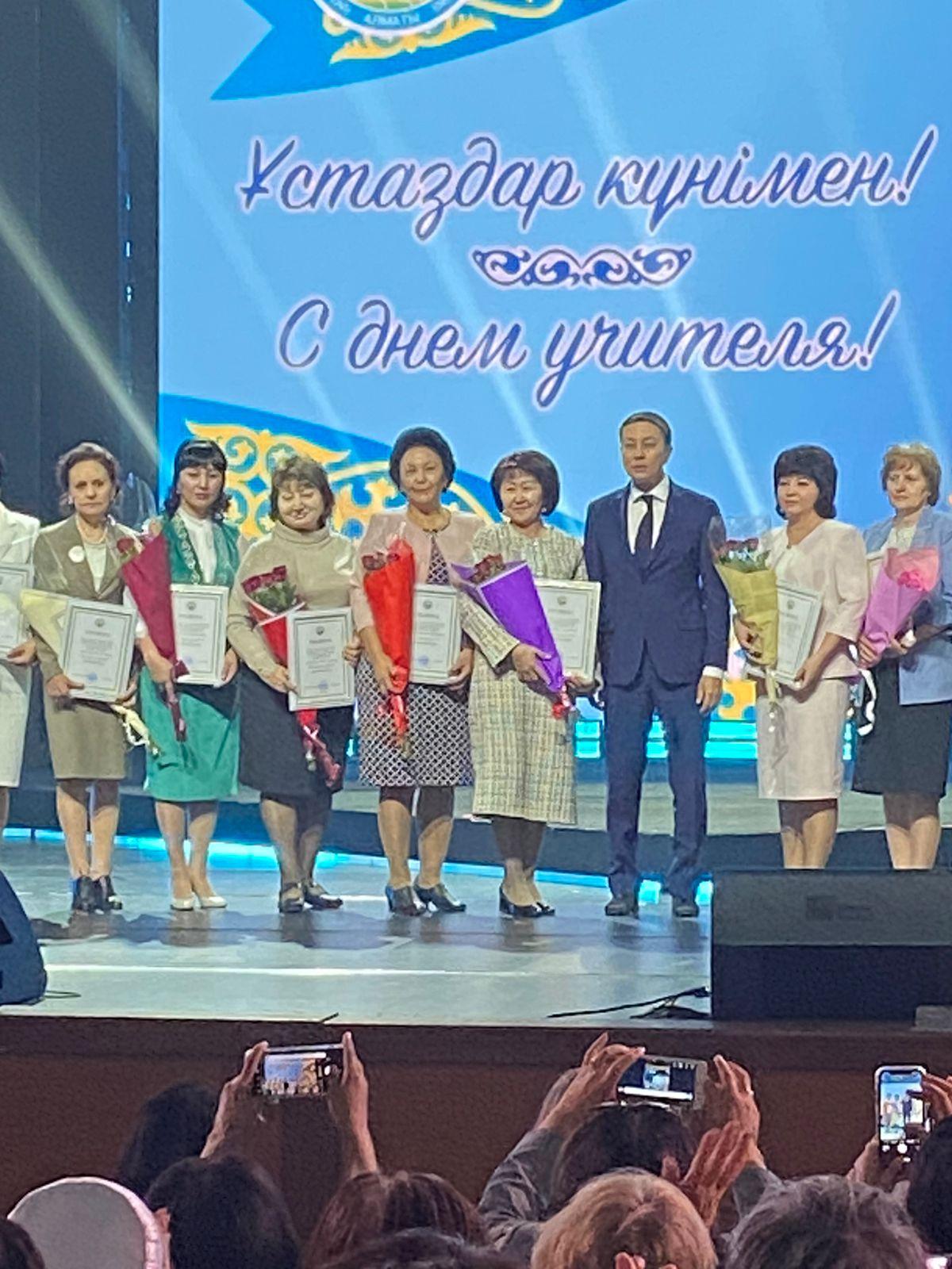 Сегодня во Дворце Республики состоялся торжественный концерт в честь Дня учителя. С поздравительной речью выступил аким Медеуского района Оразалин Е.Н., после этого прошло награждение ветеранов педагогического труда, где учитель художественного труда нашего лицея Курманалиева К.Ж. была награждена Благодарственным письмом. Специально для учителей выступали звезды казахстанской эстрады.