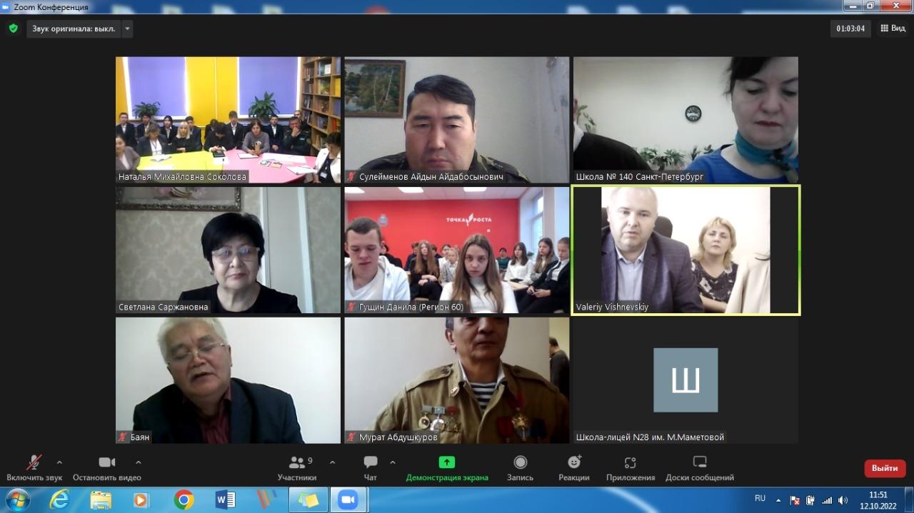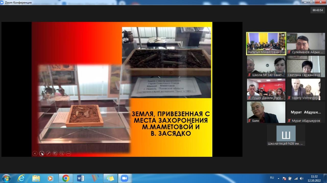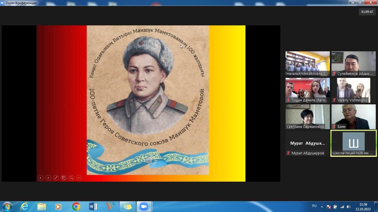 Сегодня, 12 октября, в рамках празднования 100-летия Героя Советского союза Маншук Маметовой прошла Международная онлайн-конференция «И подвиг твой, и память о тебе…». Организаторы Международной конференции: директор школы-лицея №28 им. М.Маметовой - Медетбекова А.Т., администрация лицея, руководитель Музея Боевой Славы Соколова Н.М., учитель казахского языка и литературы Епекова Л.Д.