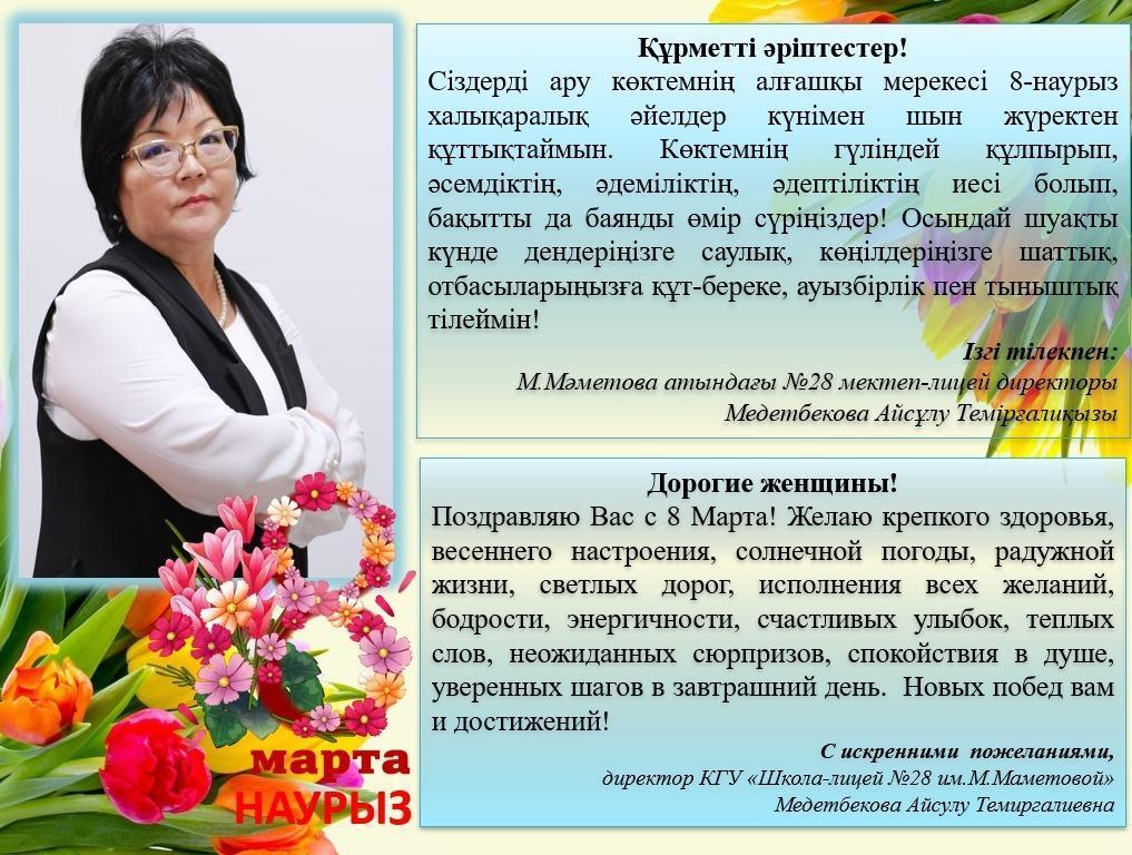 Нәзіктік пен сұлулықты паш ететін, шұғылалы көктемнің алғашқы мерекесі- 8 наурыз, Аналар мерекесі құтты болсын! Әйелдер қауымы - тіршіліктің тірегі, отбасының берекесі, жақсылықтың бастауы,Береке- бірліктің шырақшысы! Деніңізге саулық, отбасыңызға амандық, еңбегіңізге толағай табыстілеймін!