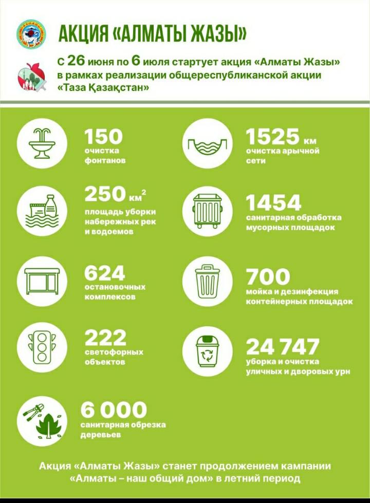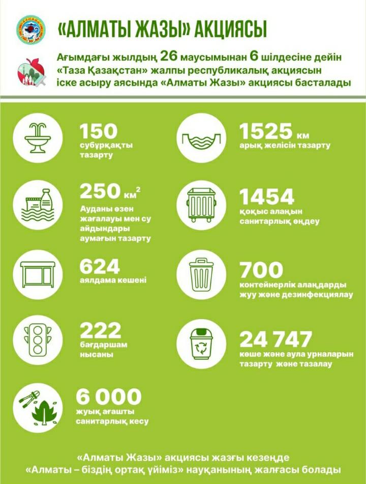 С 26 июня по 6 июля 2024 года в г.Алматы проводится акция "Алматы Жазы" в рамках общереспубликанской акции "Таза Казахстан" и является продолжением кампании "Алматы – наш общий дом" в летний период. Ее главная цель – сформировать бережное отношение к городской инфраструктуре и общественному имуществу, а также поддержка частных экологических инициатив и создание условий для их реализации.