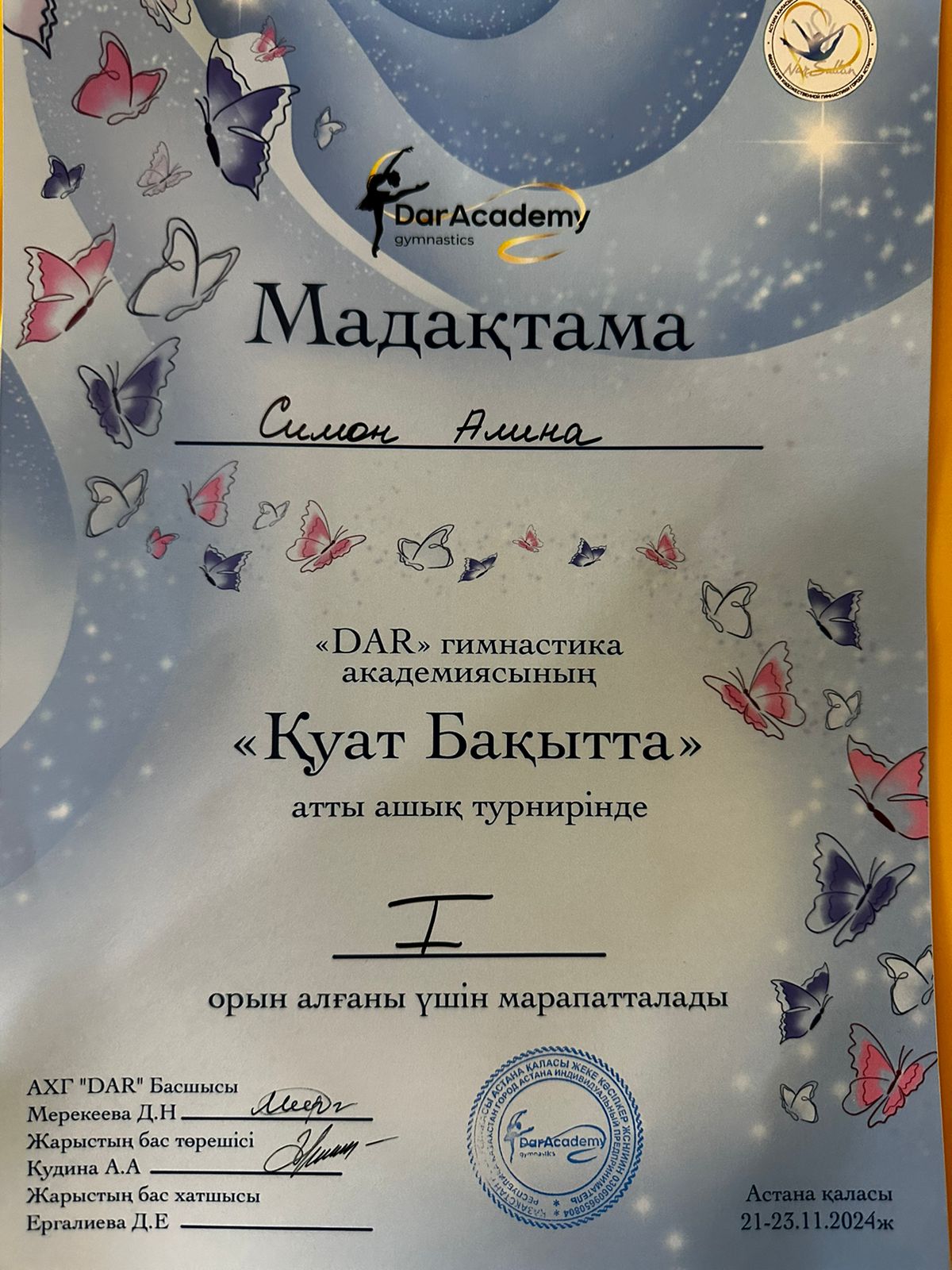 Арнайы атап өту керек – КГУ «М.Маметова атындағы №28 мектеп-лицейінің» 2 «Б» сынып оқушысы Симон Алина бірінші орынға ие болып, тамаша нәтижелер көрсетті. Бұл жеңіс Алиның ұзақ жаттығулардың, табандылық пен мақсаттылықтың нәтижесі. Оның турнирдегі өнер көрсетуі жаттығуларды орындаудың жоғары деңгейі, мінсіз техникасы және икемділігімен ерекшеленіп, қарсыластарын озып шығып, лайықты бірінші орынға қол жеткізді.