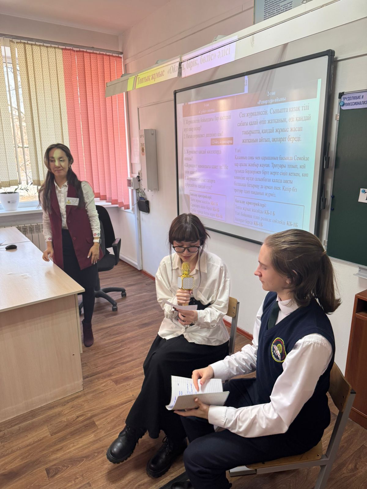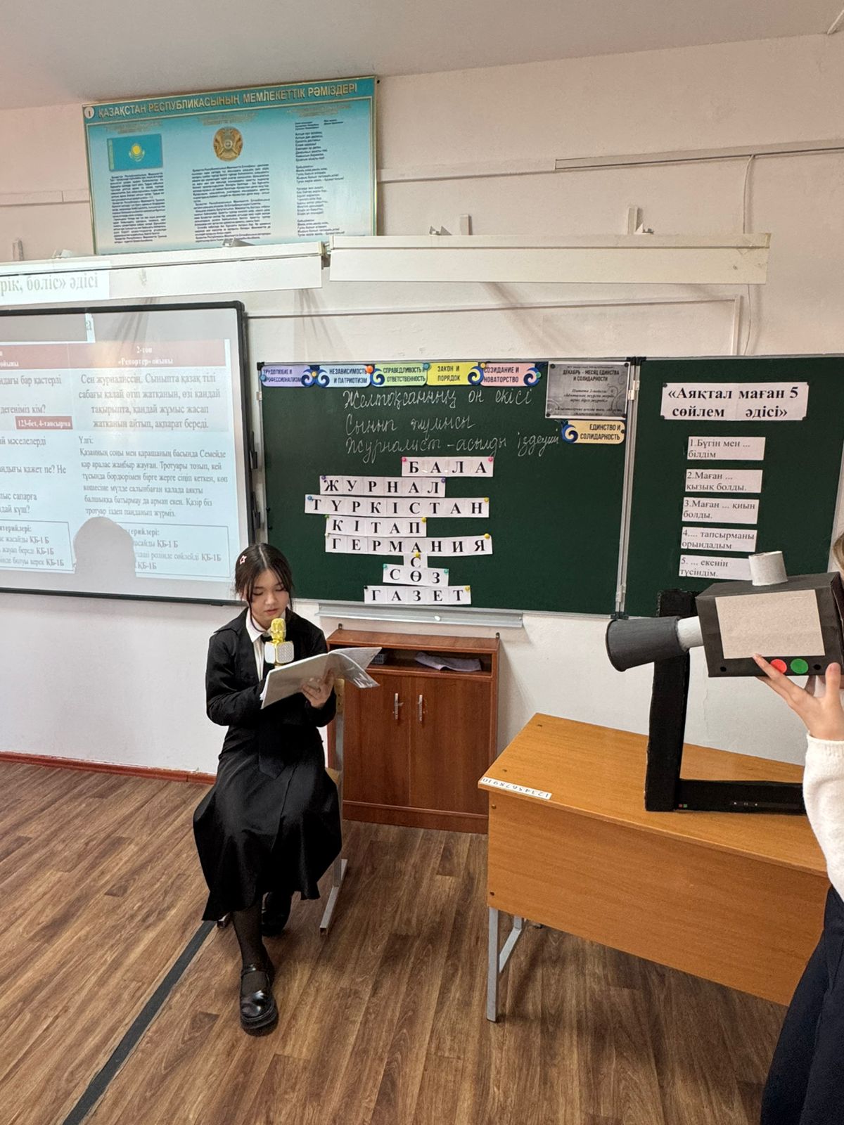 2024 жылдың 12 желтоқсанында Қазақ тілі және әдебиеті бірлестігі онкүндігінің жоспарына сәйкес, Даулеткелдинова Галия Аглановна 9 «Б» сынып оқушыларымен «Журналист-асылды іздеуші» атты ашық сабақ өтті. Сабақта қолданылған әдіс-тәсілдер: «ойлан, жұптас, бөліс» топтық жұмысы, «Аяқталмаған 5 сөйлем» әдісі, «Сұхбат», «Репортер» ойындары. Жасанды интеллекпен жасалған бейнежазба көрсетілді, видеода журналист оқушыларды жаңа сөздермен таныстырды.