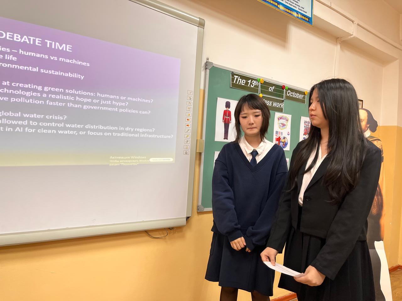 Дебат барысында оқушылар өз пікірлерін белсенді қорғай білді, дәлелді аргументтер келтіріп, тілдік деңгейін және сыни ойлау қабілетін көрсетті. Мұғалімдер Ибраимова К.К. және Сатанова М.М. ынтымақтастық, шығармашылық бастамашылдық және интеллектуалды диалог атмосферасын құра білді.