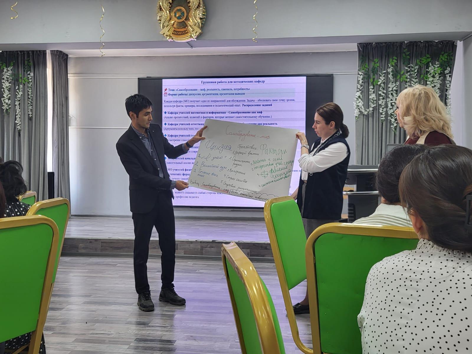 По второму вопросу слушали зам.директора по ПО Ключинскую Э.В. «Самообразование учителя –самоцель или необходимость, миф или реальность?», Два года научно-методической проблемой школы является «Интеграция STEM-подхода в современное образование: развитие компетентностей через личностно-деятельностный подход», главной темой которой стало решение проблемы саморазвития и самообразования учителя как необходимого условия профессиональной деятельности педагога, его самосовершенствования. Сегодня надо понимать, что современный учитель должен знать больше чем его ученики, и его знания не должны ограничиваться предметом и методикой его преподавания. Он должен быть в курсе передовых технологий, ориентироваться в современной политике, экономике, обладать знаниями в различных сферах общественной жизни и т.д. Педагог должен постоянно самосовершенствоваться, потому что его работа связана с постоянным обновлением. Ежегодно к учителям приходят новые ученики, несущие с собой новый этап развития общества. Для более глубокого погружения и раскрытия темы была организована групповая работа по кафедрам и МО по теме «Самообразование – миф, реальность, самоцель, потребность», каждая кафедра (МО) получили одно из направлений для обсуждения. Каждая группа обосновала свою точку зрения, используя факты, примеры, исследования и педагогический опыт. Так же Эльвира Владиславовна рассказала о методах, приемах и технологиях, которые учителя применяют на своих уроках, через мониторинг достижений учащихся и учителей проанализировала работу каждой кафедры.