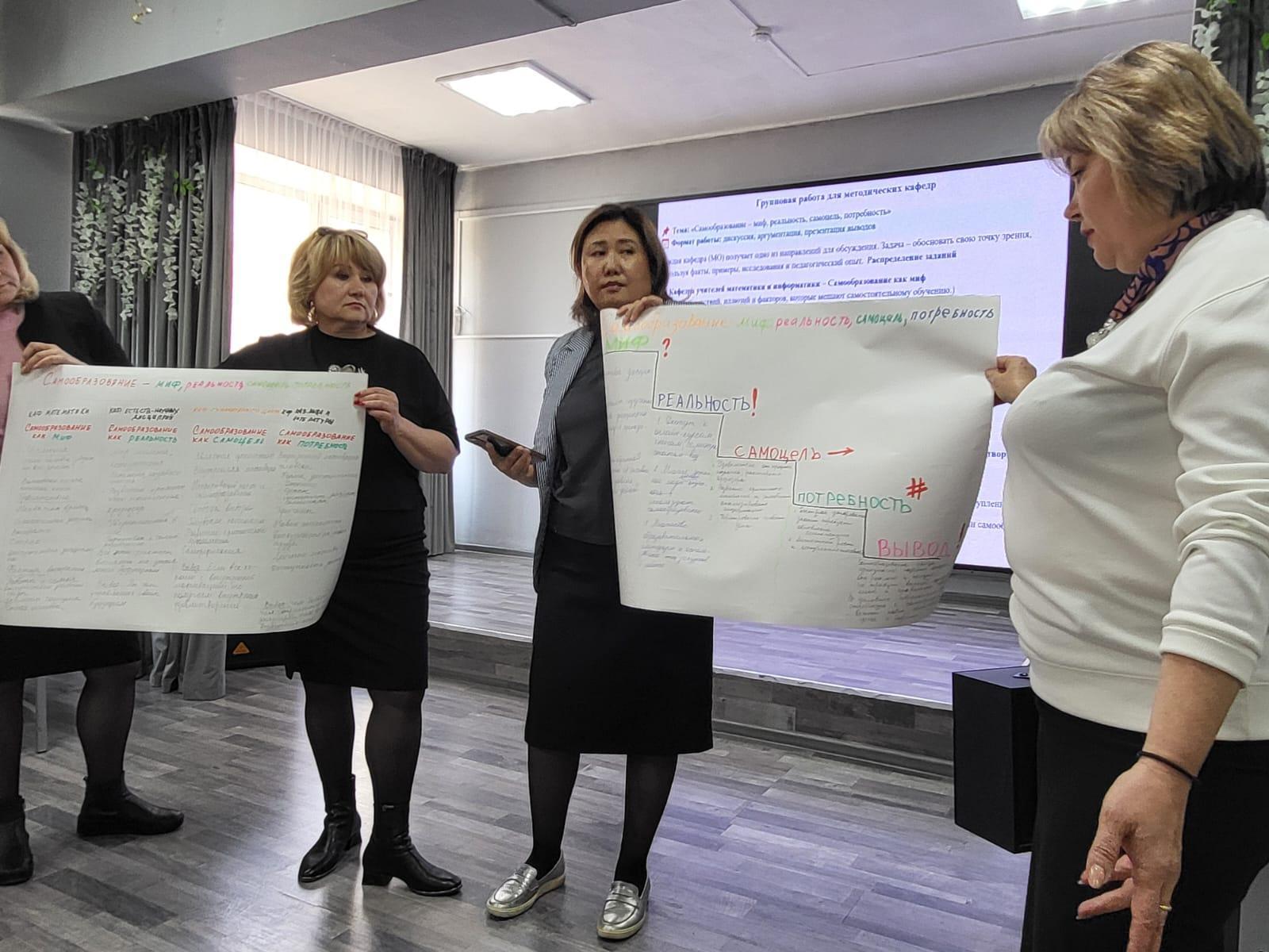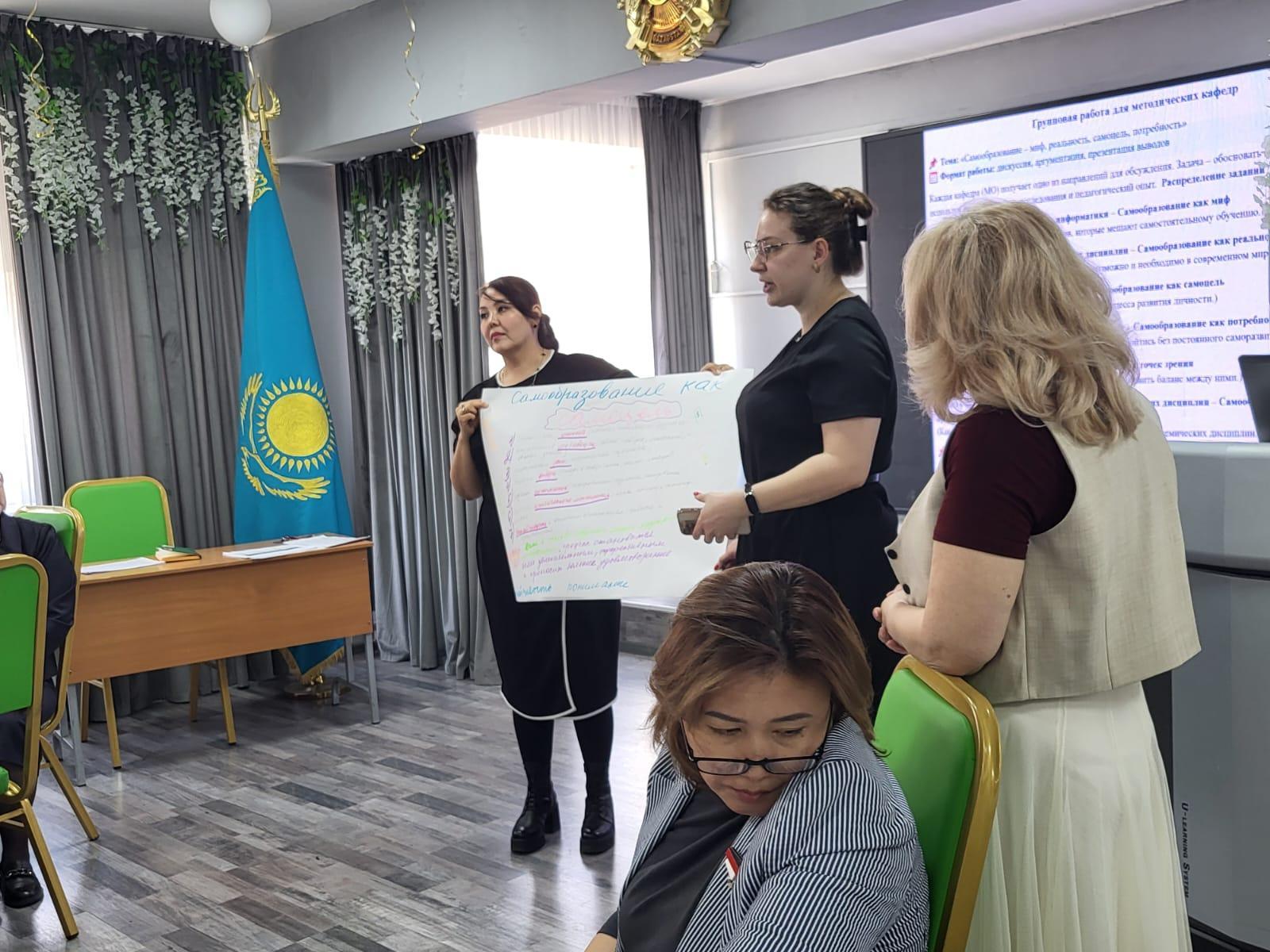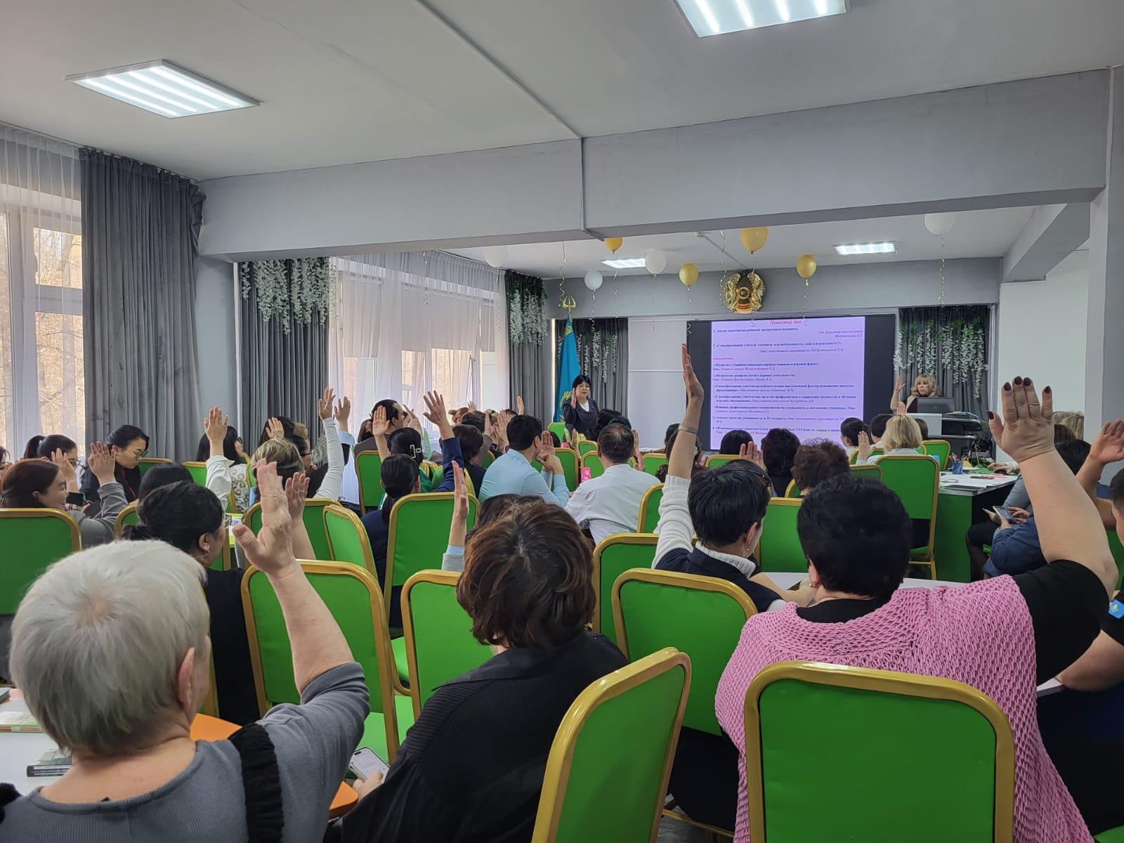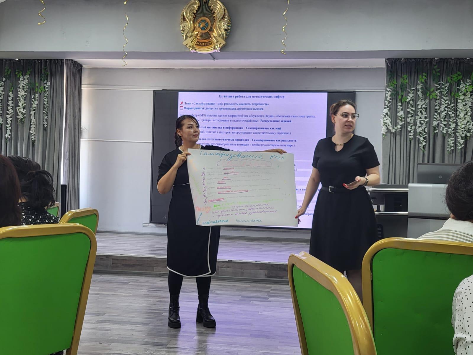 Проводятся Методические и Педагогические советы, предметные декады методических кафедр, проблемные и обучающие семинары, Методические дни, Дни обмена педагогическим опытом, коучинги которые способствуют развитию самообразования, усиливают заинтересованность учителей в повышении уровня квалификации, а также активизируют их рабочую деятельность. В течение 2024-2025г. курсы прошли: