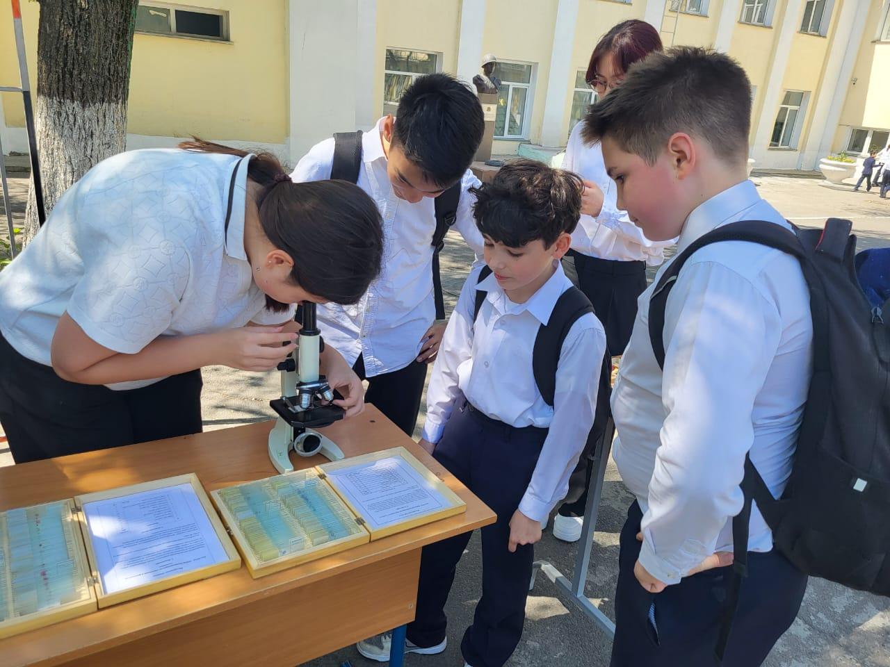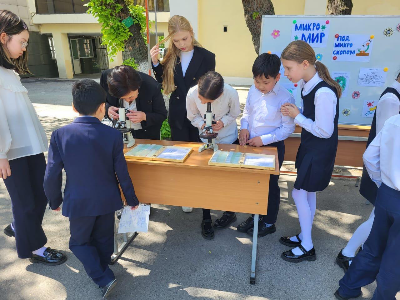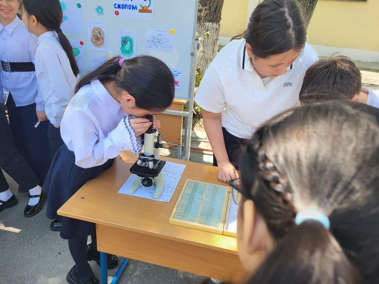 4-5 сынып оқушылары микроағзалардың көрінбейтін әлеміне үңіліп, тірі табиғаттың ең ұсақ бөлшектерінің қалай құрылғанын білді. Микроскоп арқылы түрлі объектілерді қызығушылықпен зерттеп, көптеген сұрақтар қойды.