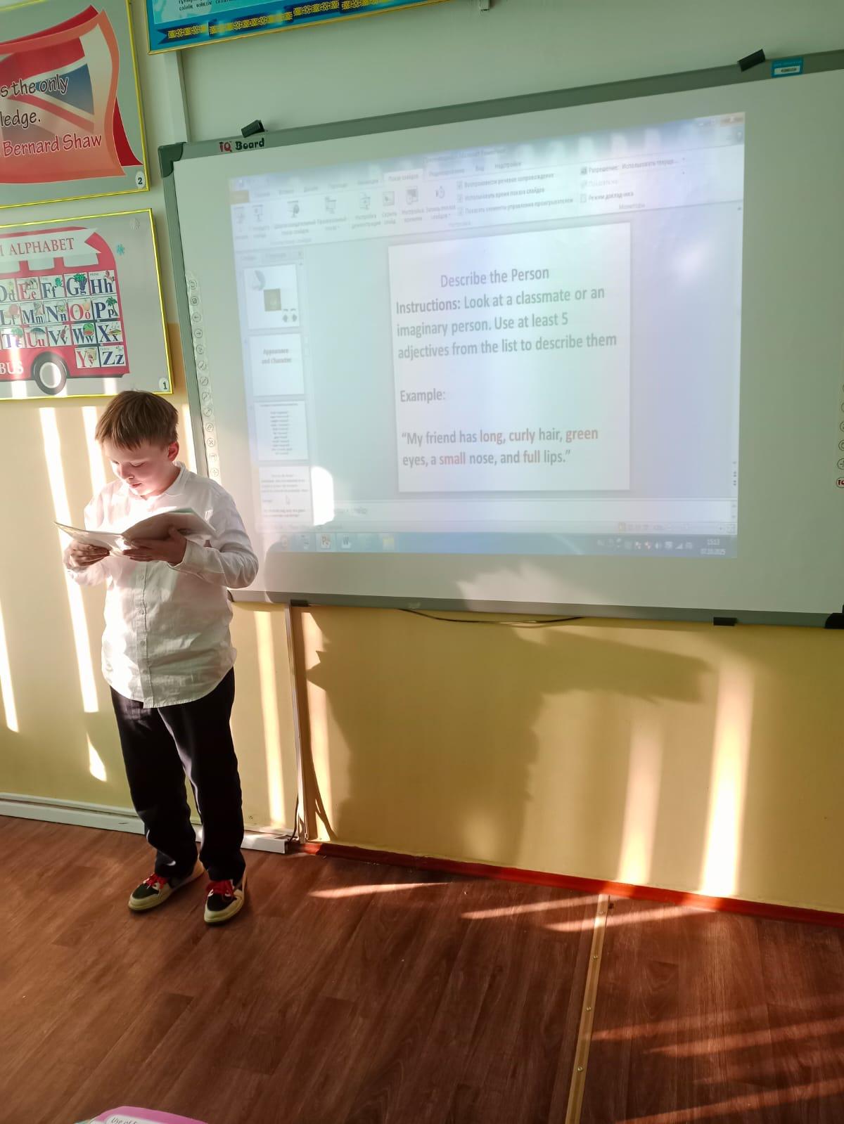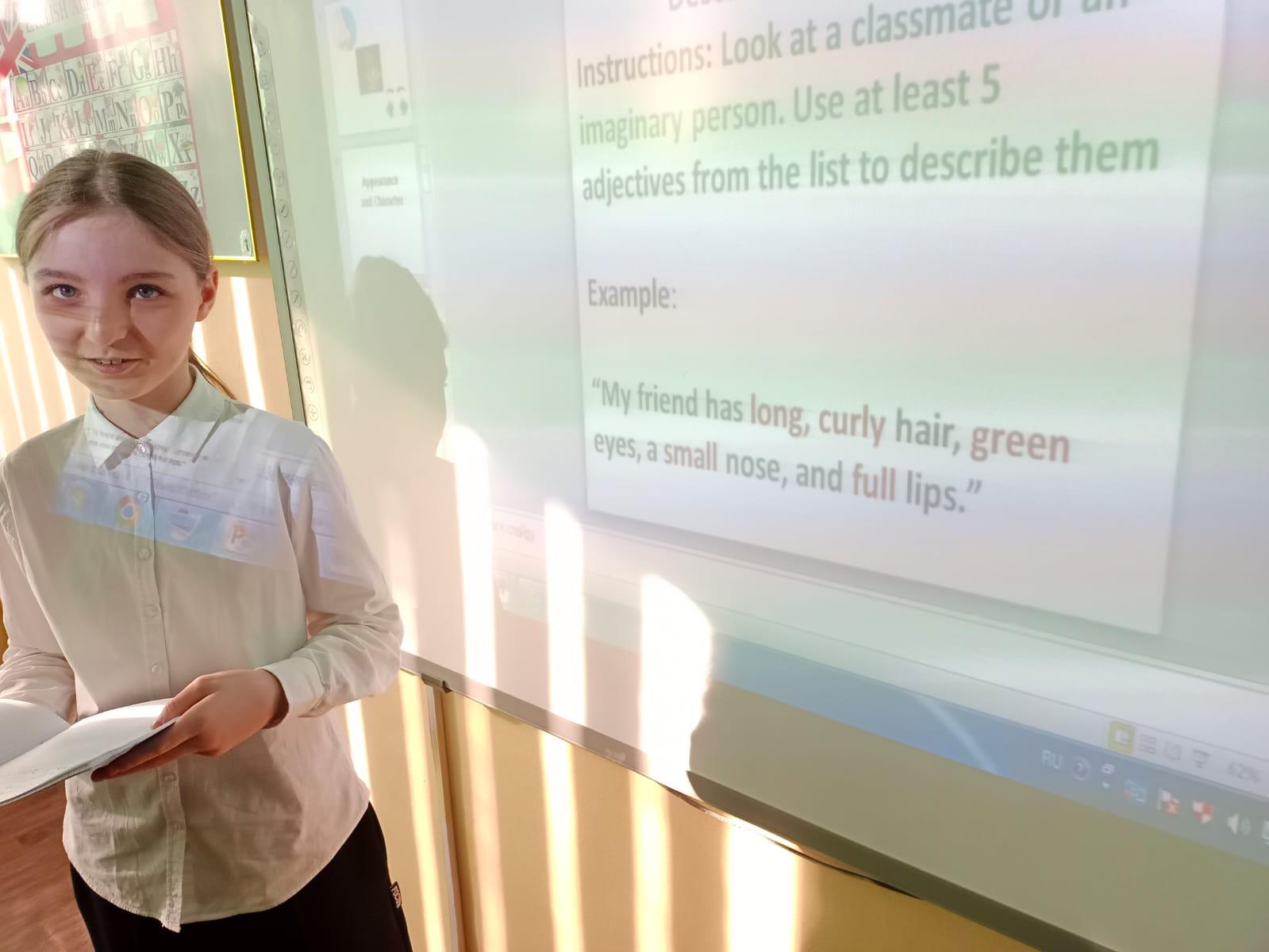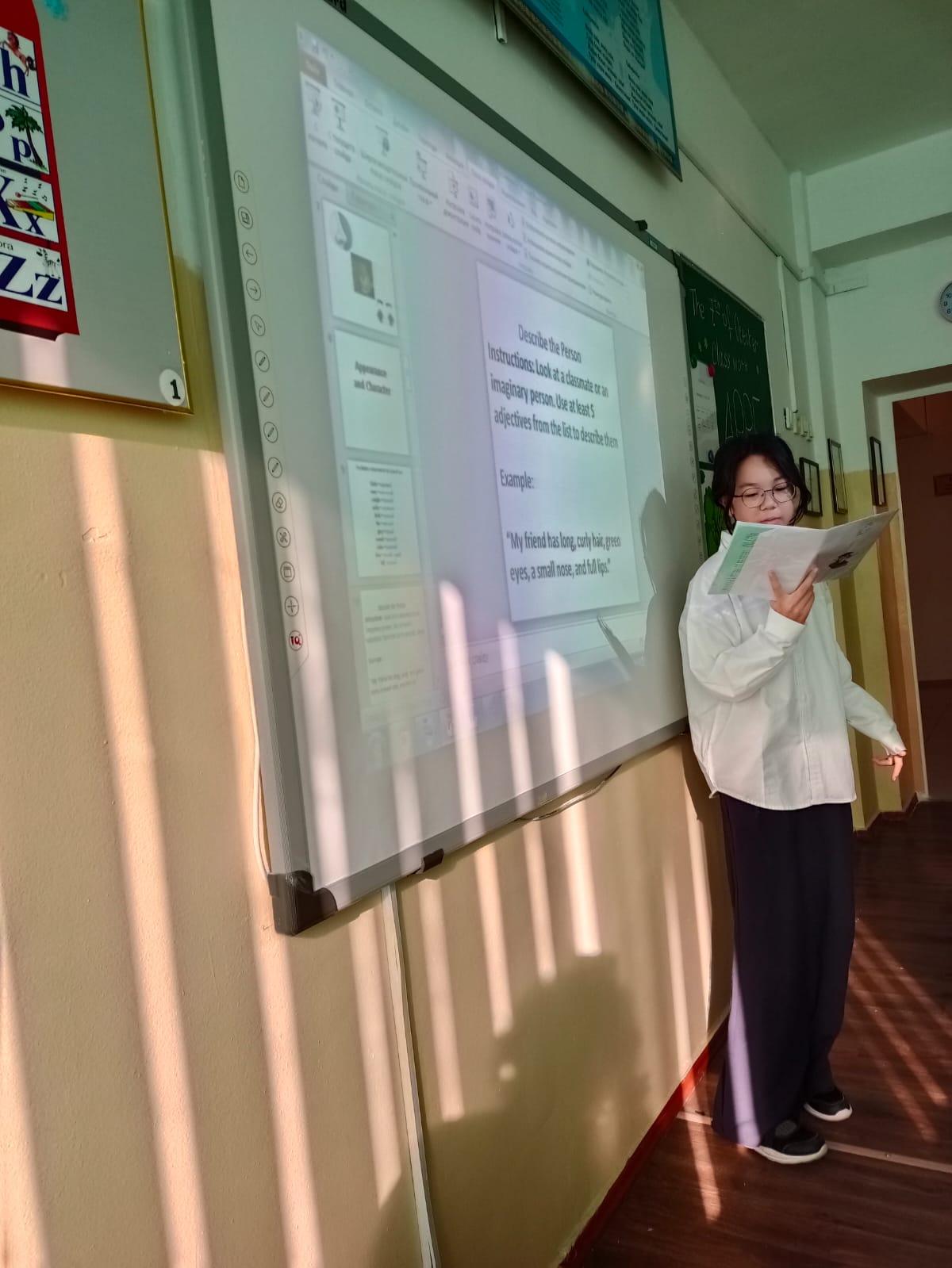 Сабақ барысында оқушылар диалогтарда белсенді қатысып, адамдарды сыртқы белгілері мен мінез-құлық ерекшеліктеріне қарай сипаттады, грамматикалық құрылымдарды бекітуге арналған жаттығулар орындады. Арнайы назар ауызша сөйлеу дағдыларын дамытуға, өз ойын дұрыс жеткізе білуге және жұптық жұмысты үйретуге аударылды.