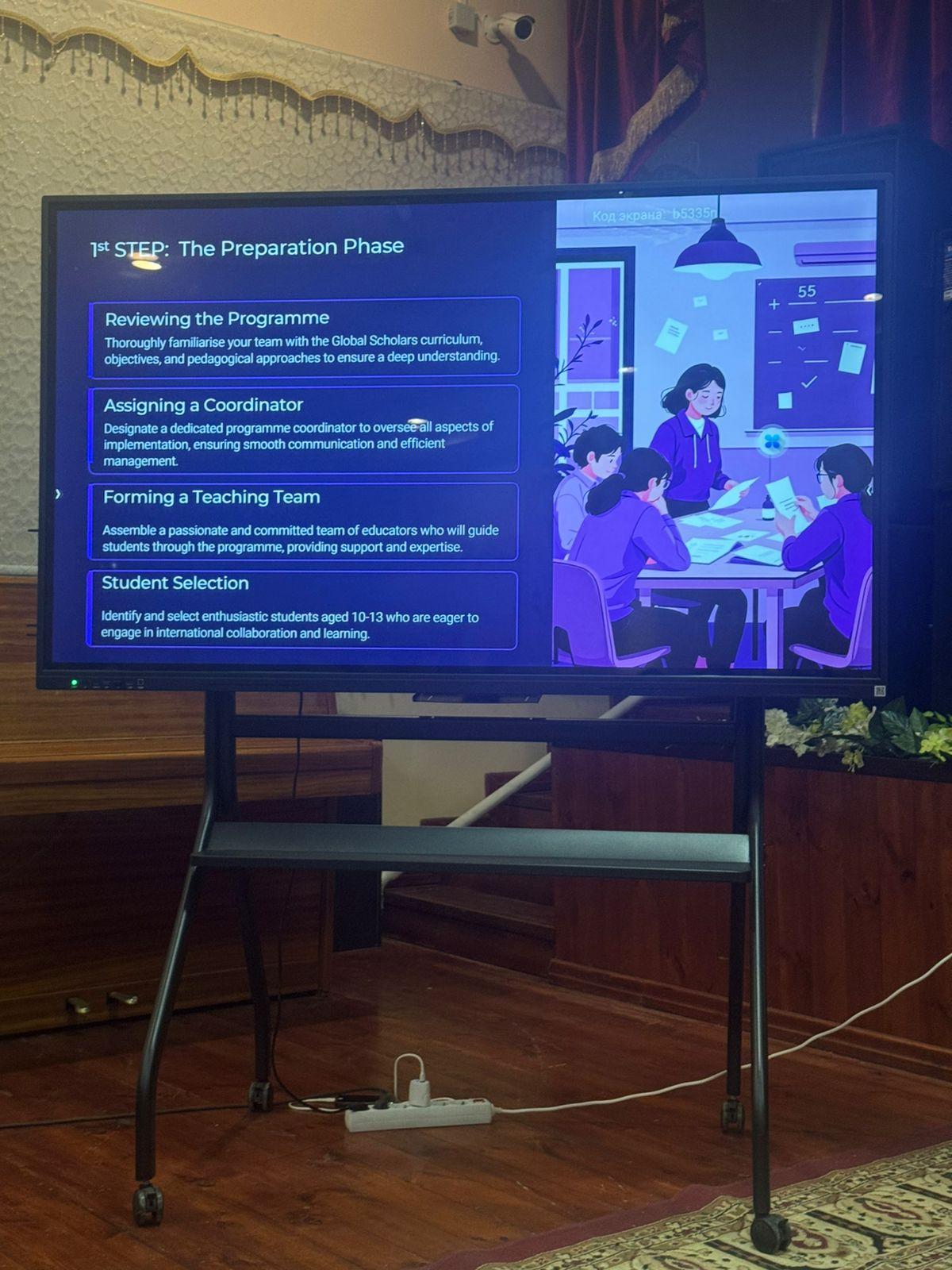 Ол халықаралық Global Scholars бағдарламасындағы мектеп жұмысының кезең-кезеңімен ұйымдастырылуы бойынша практикалық үлгі ұсынды. Бұл модель оқушылардың ғаламдық ойлауын, цифрлық дағдыларын, мәдениетаралық коммуникациясын және зерттеу қабілеттерін дамытуға мүмкіндік береді.