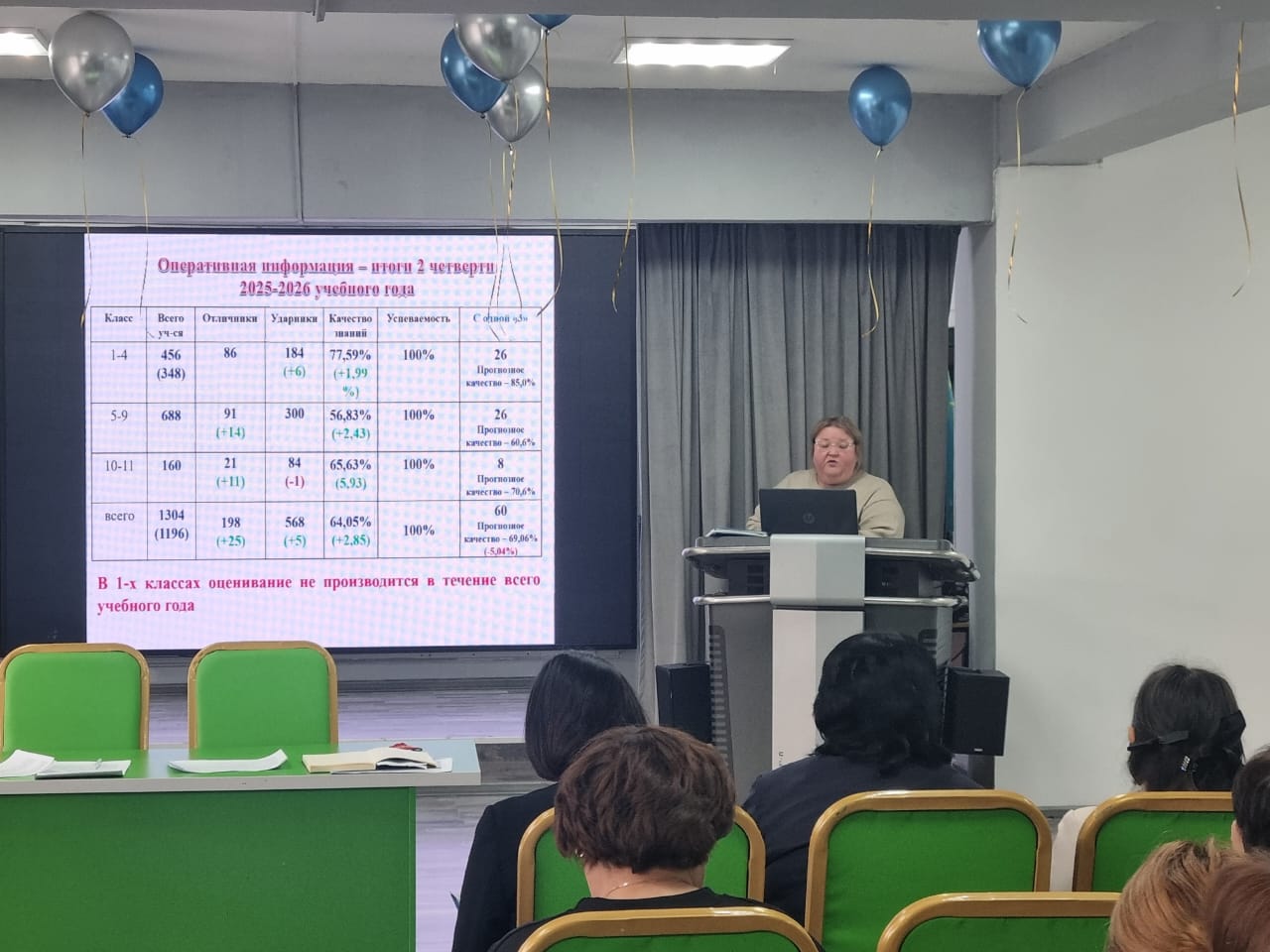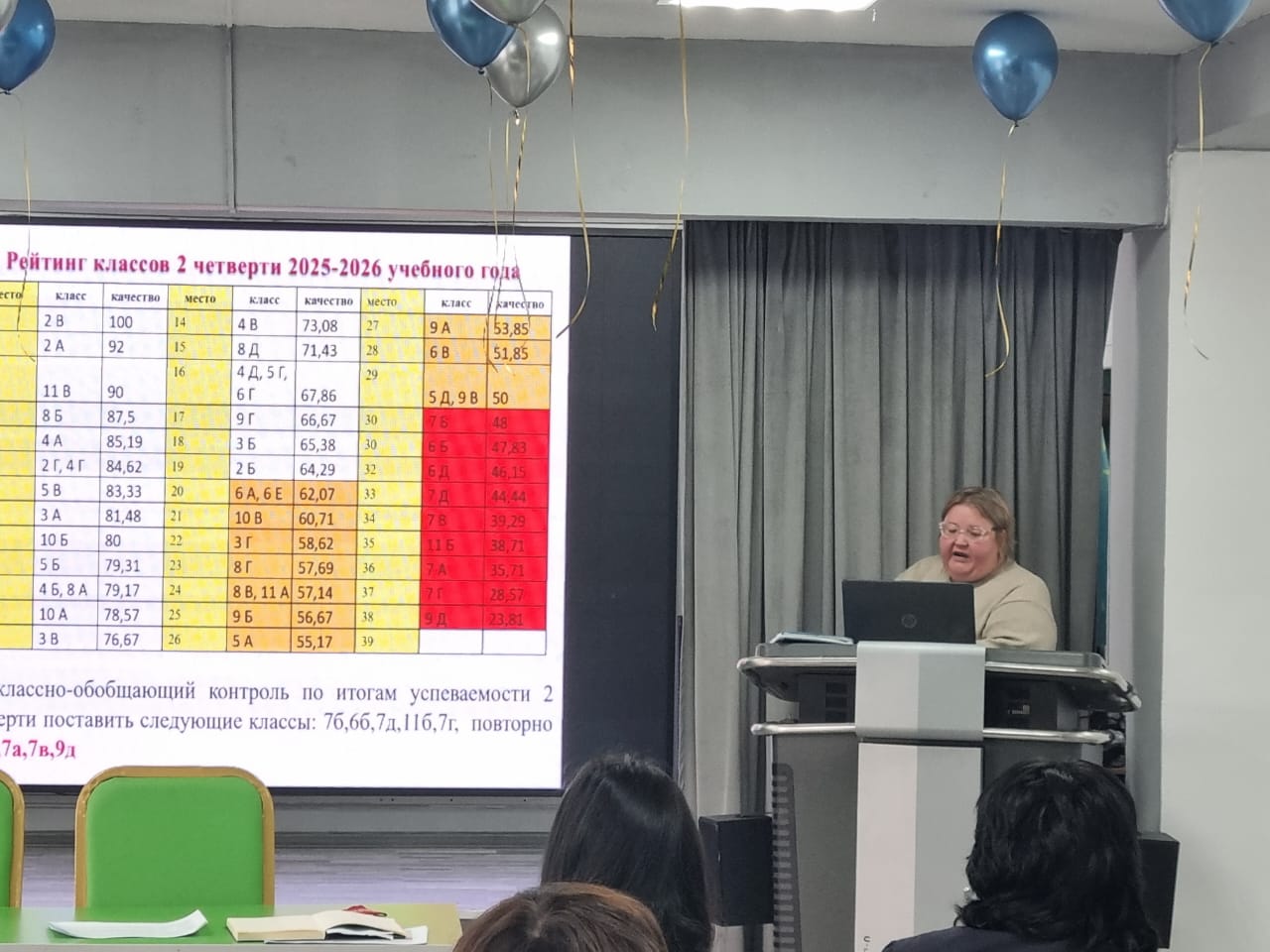 По четвертому вопросу слушали зам.директора по УР – Иванову М.В., которая подвела итоги качества знаний за 2 четверть 2025-2026 учебного года – 64,05%, что выше на 5,75% 2 четверти 2024-2025 учебного года и успеваемости – 100%, что на 0,3% выше, чем успеваемость за 2 четверть 2024-2025 учебного года, отличников – 198 учащихся, хорошистов – 568 учащихся. Мониторинг был предоставлен по параллелям, выведен рейтинг классов, рекомендовано поставить на КОК по итогам 2 четверти: поставить следующие классы: 7б,6б,7д,11б,7г, повторно - 6д,7а,7в,9д. Так же был дан анализ мероприятий ВШК за 2 четверть, охватывающий как учащихся, так и учителей. Администрацией было посещено более 36 уроков. При отсутствии результатов СОР и СОЧ обучающийся является временно не аттестованным. По итогам второй четверти таких учащихся – 3 учащихся, за каникулярный период в течение 10 дней они должны закрыть свои долги.