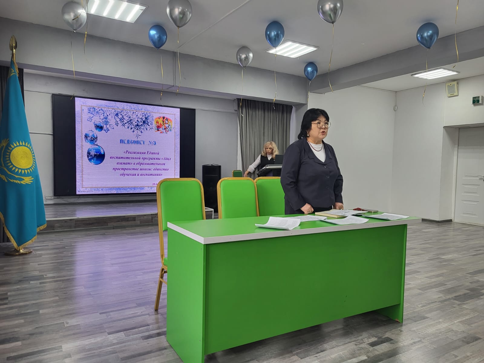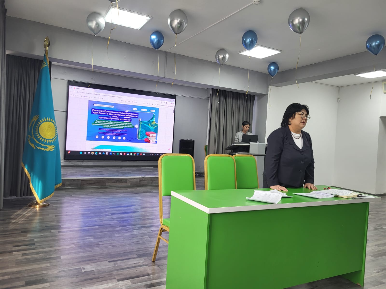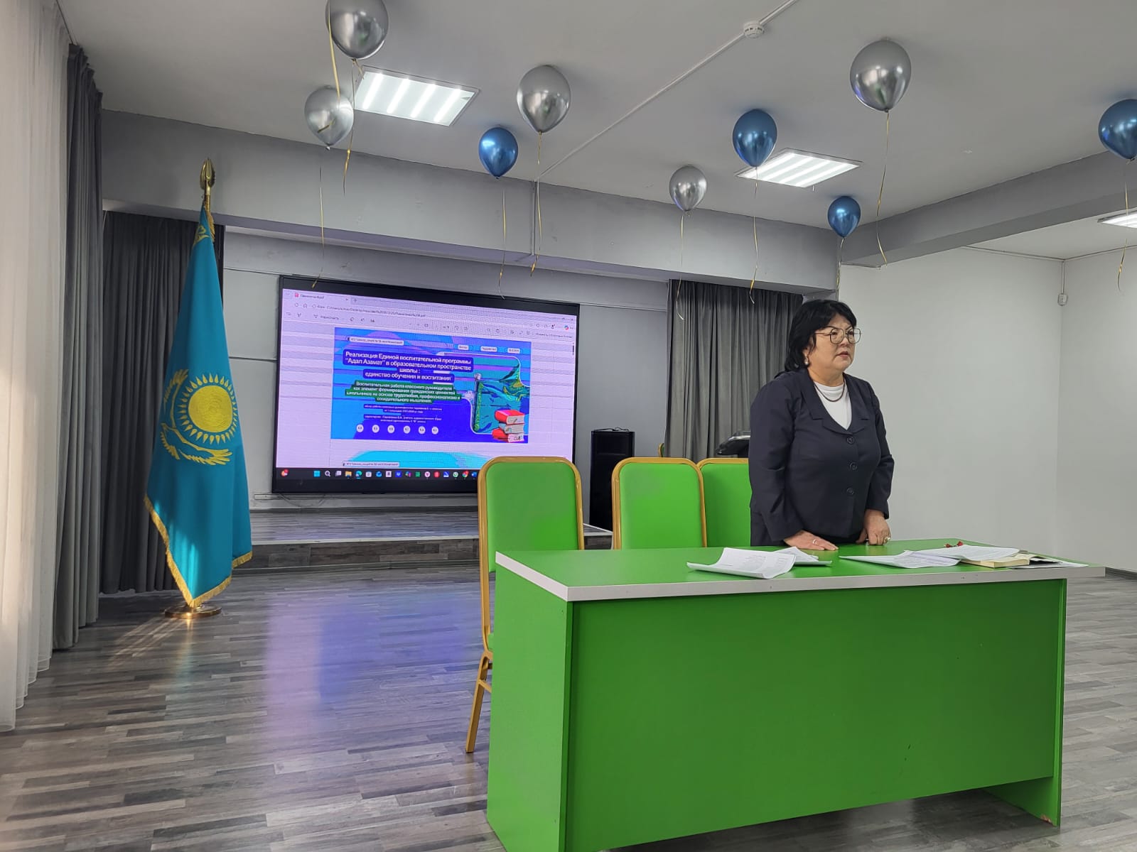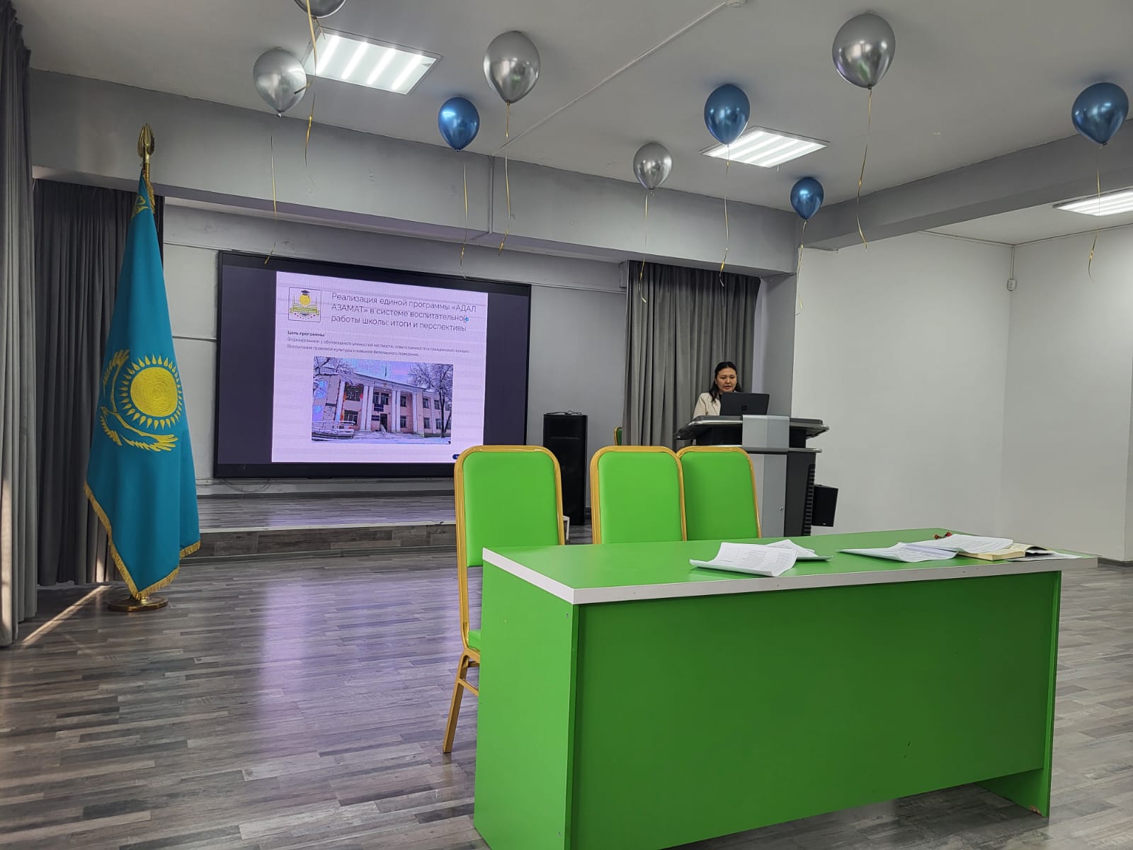 По второму вопросу слушали заместителя директора по воспитательной работе Сұрамаеву Н.С., которая в своём докладе осветила вопросы реализации Единой воспитательной программы «Адал азамат» в образовательном пространстве школы. Основной акцент был сделан на использование современных педагогических и цифровых технологий в воспитательной работе, активное вовлечение обучающихся в проектную и исследовательскую деятельность, интеграцию семейного воспитания и патриотического направления, стимулирование волонтёрской активности школьников, а также развитие школьных традиций и мероприятий, направленных на формирование патриотического сознания.