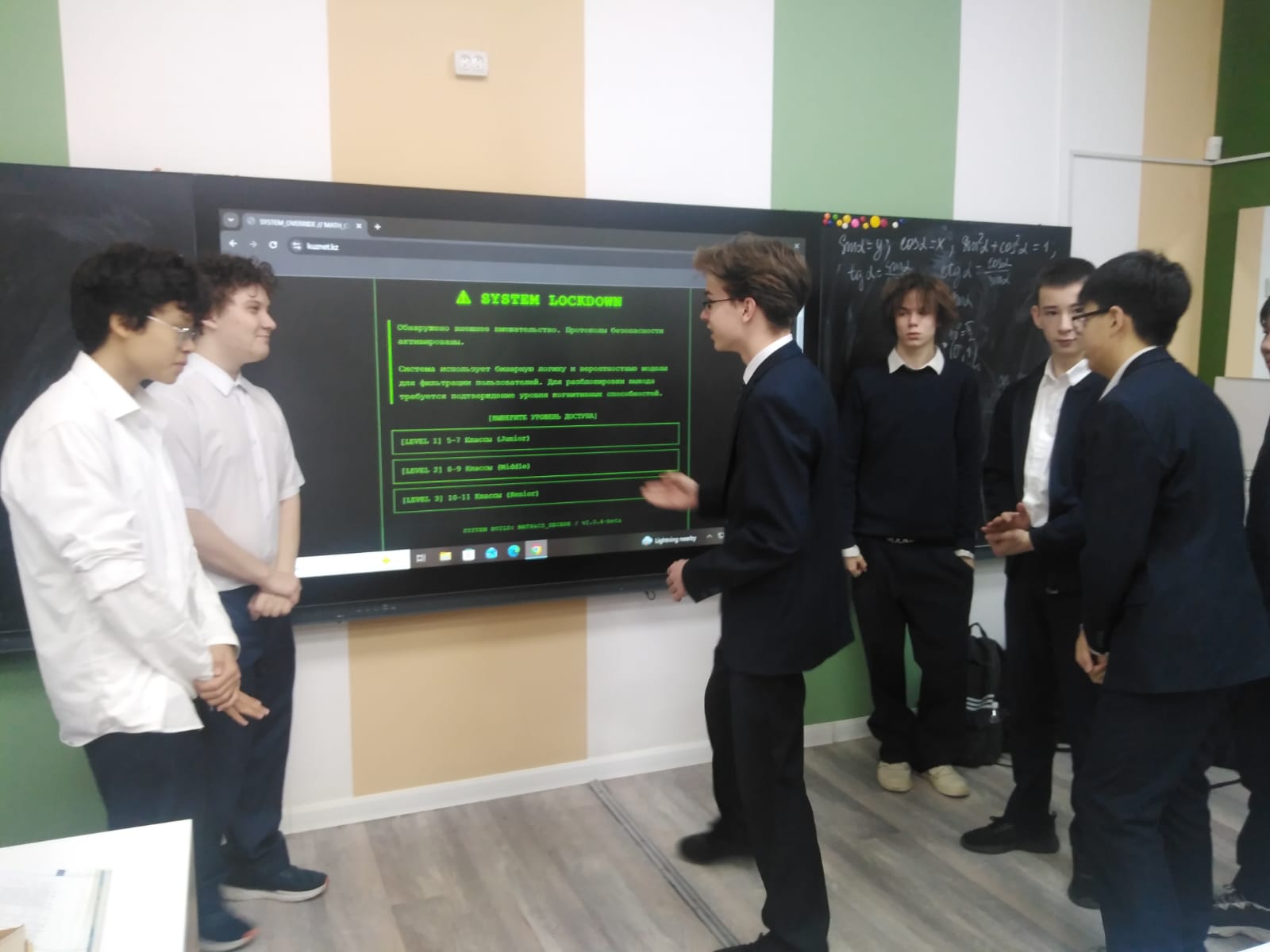 Интерактивті тақтаның мүмкіндіктерін тиімді пайдалану арқылы ұйымдастырушылар қарапайым үзілісті түрлі параллель сыныптардың көптеген оқушыларының назарын аударған серпінді сайысқа айналдырды. Викторина мазмұны әртүрлі сұрақтар топтамасын қамтыды: дәстүрлі логикалық есептер мен ребустардан бастап ақпараттық технологиялар тарихынан алынған қызықты деректер мен ұлы ғалымдардың өмірбаяндарына дейін.