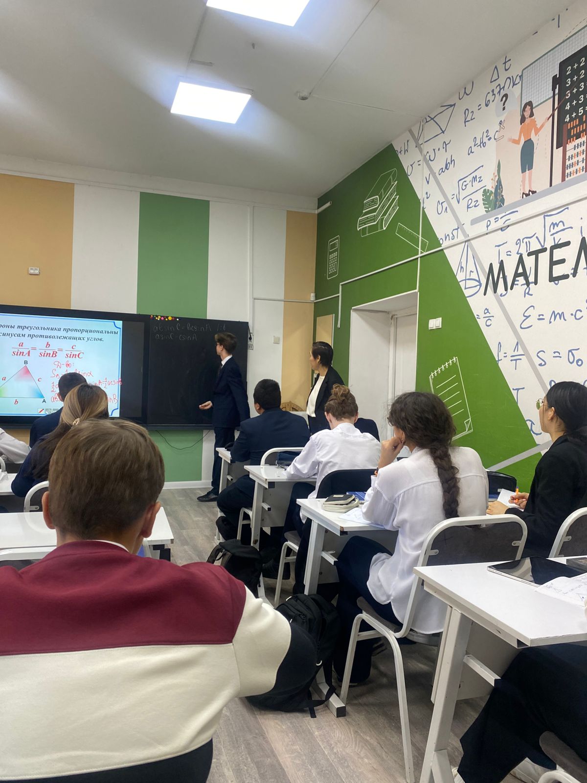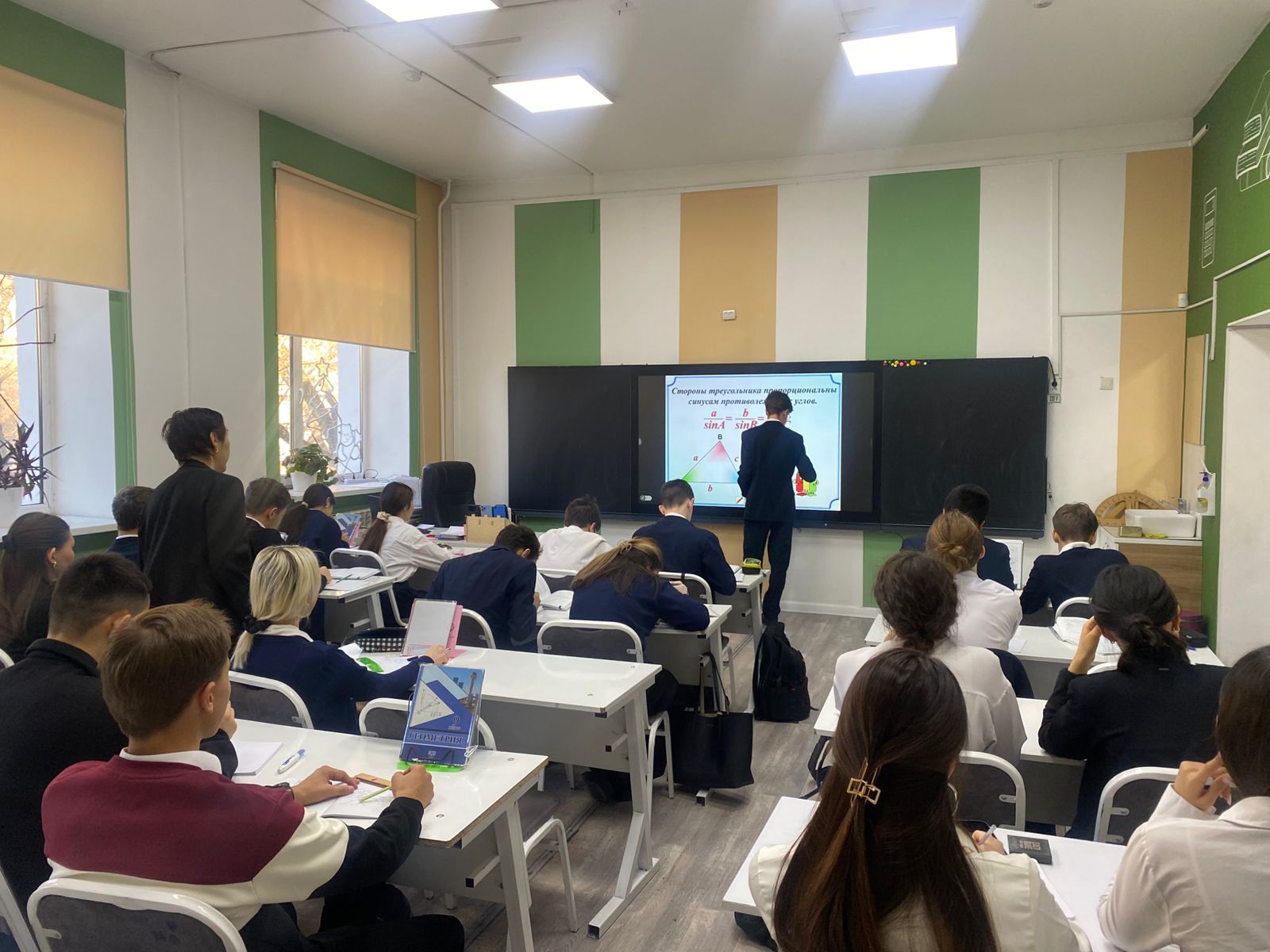 Сабақ күрделі геометриялық ұғымдарды практикалық тапсырмаларды шешу арқылы бекітуге бағытталған белсенді ізденіс атмосферасында өтті. Оқушылар жоғары дайындық деңгейін көрсетіп, есептеулердің әрбір қадамын логикалық тұрғыдан негіздей білді.