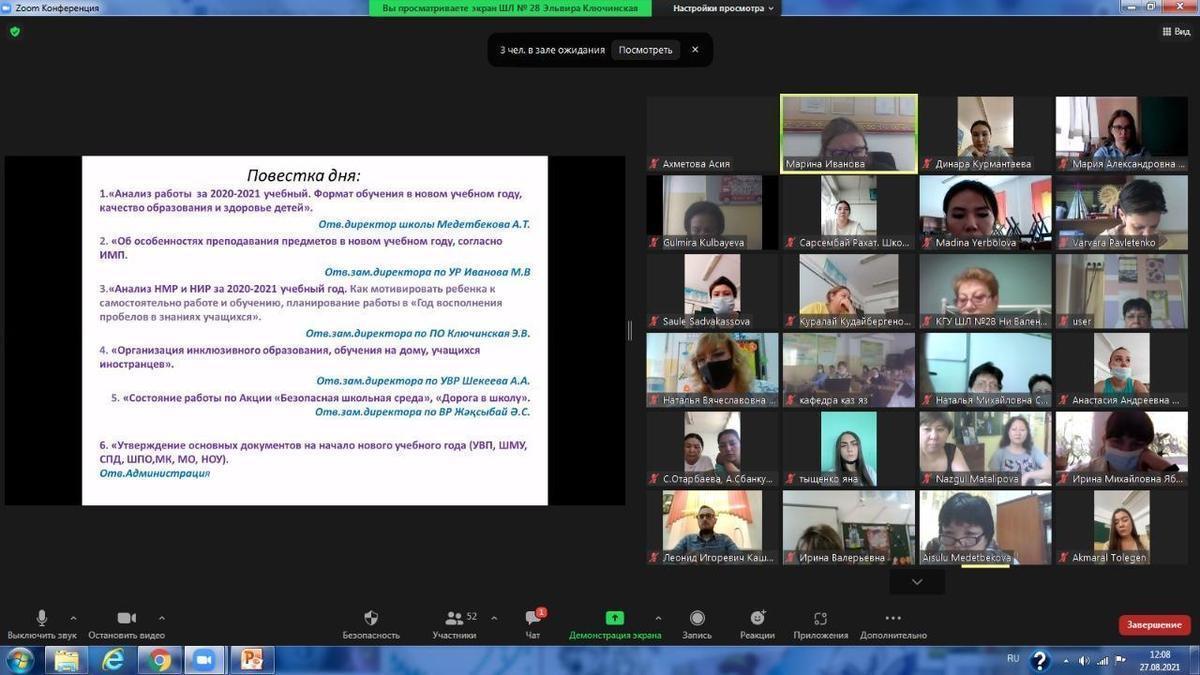 По третьему вопросу слушали зам.директора по ПО Ключинскаую Э.В., .которая предоставила «Анализ НМР и НИР за 2020-2021 учебный год. Как мотивировать ребенка к самостоятельно работе и обучению, планирование работы в «Год восполнения пробелов в знаниях учащихся». Повышение и совершенствование педагогического мастерства через максимальное использование возможности урока как основной формы организации образовательной деятельности, через проведение единых методических дней, предметных декад, взаимопосещение уроков, активное участие в семинарах, конференциях, творческих мастерских. 1.Предметные декады – 9, 2.Методические дни – 3, 3.Семинары, коучинги – 15, 4. Заседания «Исследование в действии lesson Study» - 4, 5. Заседания. Рабочая группа из магистрантов для работы с научными проектами – 2, 5.Посещение уроков администрацией – 720, 6.Международные конференции – 11 учителей, 7.Открыты уроки – 63 учителя, 8. ШПО – 6 заседания, 9.ШМУ - 6 заседания, 10.НМС – 6 заседаний. Во второй части выступления Ключинская Э.В., рассказала, о том как мотивировать учащихся, как вожна мотивация - В мотивации большая роль отводится личному примеру. Дети во всём копируют взрослых. Если педагоги, родители беспрерывно читают книги, продолжают учиться в течение жизни, интересуются культурой и уделяют время своему хобби — ребёнок будет также стремиться к знаниям. Вторая составляющая мотивации – учебные достижения. Школьные отметки не показатель знаний. Дайте понять, что вас интересуют реальные знания, а не цифры в электронном журнале.