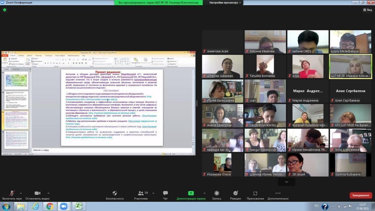 Заслушав и обсудив доклады директора школы Медетбековой А.Т., заместителей директора по УВР Инвановой М.В., Шекеевой А.А., ПО Ключинской Э.В., ВР Жақсыбай Ә.С., педсовет отмечает, что в лицее создана и успешно развивается здоровьесберегающая образовательная среда, обеспечивающая успешное обучение, воспитание и развитие детей, независимо от состояния их физического здоровья и социального положения. На основании вышеизложенного педсовет,