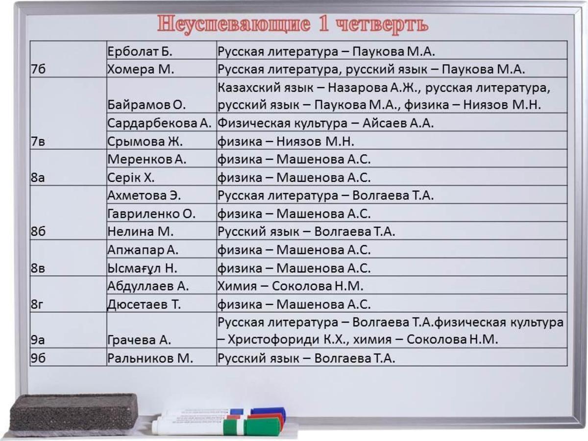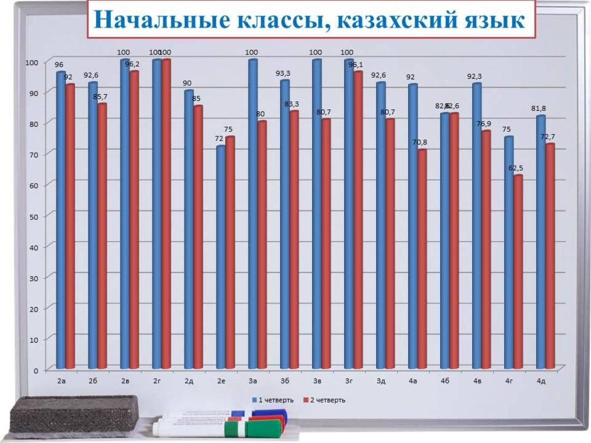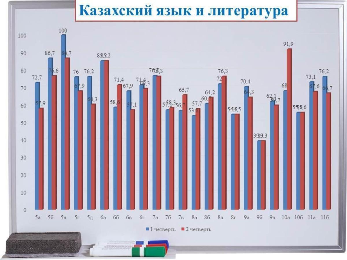 По второму вопросу «Анализ образовательных результатов обучающихся по итогам II четверти» выступила зам директора по УВР, которая подвела итоги качества знаний – 54,6%, что ниже, чем в первой четверти на 3,7% и успеваемости – 98,8%, по сравнению с 1 четвертью выше на +0,3%, отличников – 165 учащихся, ниже чем в 1 четверти на 13 учащихся, хорошистов – 397 учащихся, ниже чем в 1 четверти на 27 учащихся. Неуспевающих по итогам 2 четверти – 12 учащихся, меньше на 4 учащихся по сравнению с 1 четвертью. Всего за 2 четверть аттестовывалось 16 предметов: английский – качество 86,1%, успеваемость 100%, казахский - качество 72,4%, успеваемость 99,9%, математика - качество 74,2%, успеваемость 99,2%, русская литература - качество 86,1%, успеваемость - 99,8%, русский язык - качество 61,5%, успеваемость 99,8%, естествознание – качество 95,3%, успеваемость 100%, география – качество 76,8%, успеваемость 100%, история Казахстана – качество 80,3%, успеваемость 100%, физика – качество 55,1%, успеваемость 100%, химия – качество 57,7%, успеваемость 100%, геометрия – качество 55,8%, успеваемость 98,6%, биология – качество 71,7%, успеваемость 100%, информатика – качество 91,4%, успеваемость 100%., всемирная история – качество 85,2%, успеваемость – 100%, ЧОП – качество 84,2%, успеваемость 100%, познание мира – качество 95,1%, успеваемость 100%. Был показан рейтинг классов и дан анализ проделанной работе по ВШК для достижения образовательных результатов и качества образования как учащихся, так и учителей. Так же были расмотрены результаты двух четвертей претендента на знак «Алтын белгі» - Нурметовой Наргиз, ученицы 11 «А» класса, обсуждены успеваемость, пропуски (не все учителя отмечают, выявить учителей и выяснить причины) и опоздания.