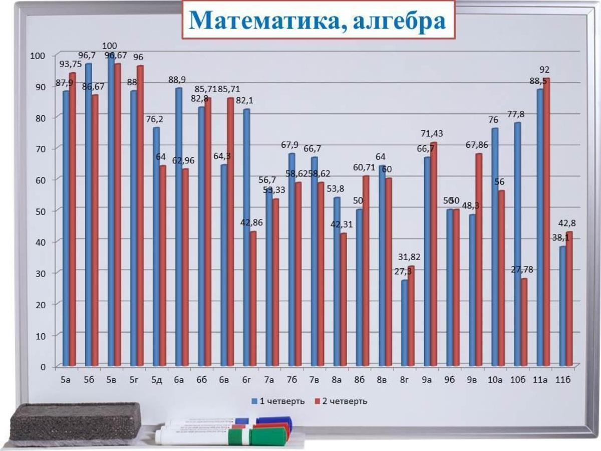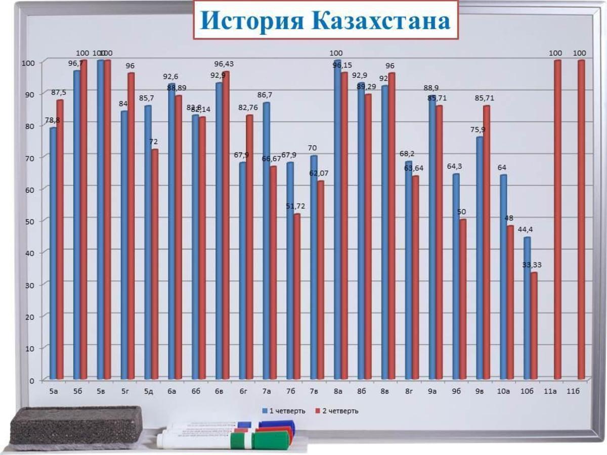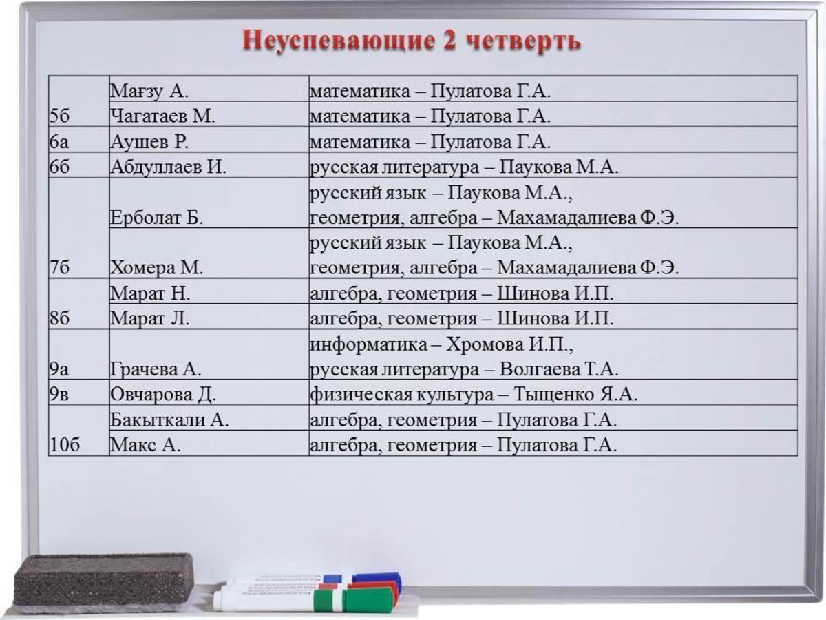 По второму вопросу «Анализ образовательных результатов обучающихся по итогам II четверти» выступила зам директора по УВР, которая подвела итоги качества знаний – 54,6%, что ниже, чем в первой четверти на 3,7% и успеваемости – 98,8%, по сравнению с 1 четвертью выше на +0,3%, отличников – 165 учащихся, ниже чем в 1 четверти на 13 учащихся, хорошистов – 397 учащихся, ниже чем в 1 четверти на 27 учащихся. Неуспевающих по итогам 2 четверти – 12 учащихся, меньше на 4 учащихся по сравнению с 1 четвертью. Всего за 2 четверть аттестовывалось 16 предметов: английский – качество 86,1%, успеваемость 100%, казахский - качество 72,4%, успеваемость 99,9%, математика - качество 74,2%, успеваемость 99,2%, русская литература - качество 86,1%, успеваемость - 99,8%, русский язык - качество 61,5%, успеваемость 99,8%, естествознание – качество 95,3%, успеваемость 100%, география – качество 76,8%, успеваемость 100%, история Казахстана – качество 80,3%, успеваемость 100%, физика – качество 55,1%, успеваемость 100%, химия – качество 57,7%, успеваемость 100%, геометрия – качество 55,8%, успеваемость 98,6%, биология – качество 71,7%, успеваемость 100%, информатика – качество 91,4%, успеваемость 100%., всемирная история – качество 85,2%, успеваемость – 100%, ЧОП – качество 84,2%, успеваемость 100%, познание мира – качество 95,1%, успеваемость 100%. Был показан рейтинг классов и дан анализ проделанной работе по ВШК для достижения образовательных результатов и качества образования как учащихся, так и учителей. Так же были расмотрены результаты двух четвертей претендента на знак «Алтын белгі» - Нурметовой Наргиз, ученицы 11 «А» класса, обсуждены успеваемость, пропуски (не все учителя отмечают, выявить учителей и выяснить причины) и опоздания.