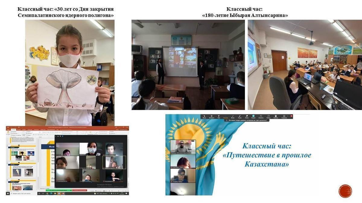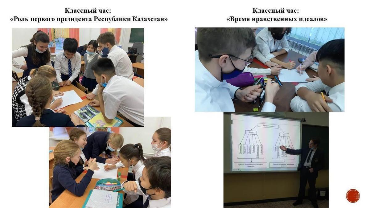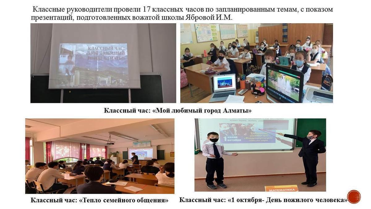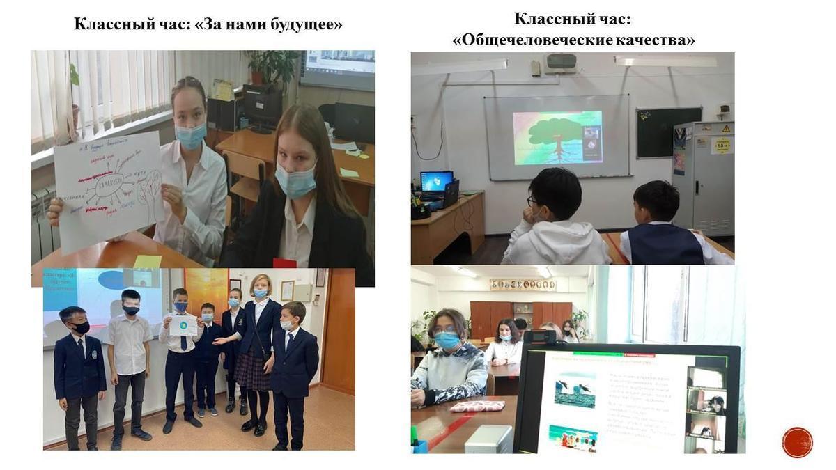 По третьему вопросу слушали зам.директора по ВР – Курманалиеву К.Ж., которая выступила с основным докладом: «Национальные и общечеловеческие ценности – ключевые идеи воспитания учащихся». По плану воспитательной работы были проведены все запланированные мероприятия за I-полугодие этого учебного года. Классные руководители провели 17 классных часов по запланированным темам, с показом презентаций, подготовленных вожатой школы Ябровой И.М., За это время психологами школы: Омилаевой Л.Н. и Олжабай А.С. были проведены анкетирование, беседы, тренинги, консультации. Было проведено 2 родительских собрания в сентябре на тему: “Роль семейных традиций в воспитании подрастающего поколения” и в ноябре “Правомерные способы решения конфликтов в семье”, Принятие в ЕДЮО «Жас Ұлан», учащихся 5-6-х классов. Руководитель школьного музея “Боевой славы” Соколова Н.М. с новым составом экскурсоводов провела экскурсии, для учащихся 1 и 2 классов. 5 “Б” класс посетил школьную комнату О. Сулейменова.