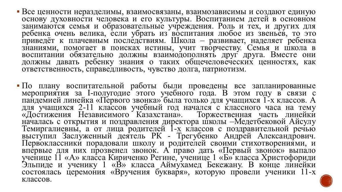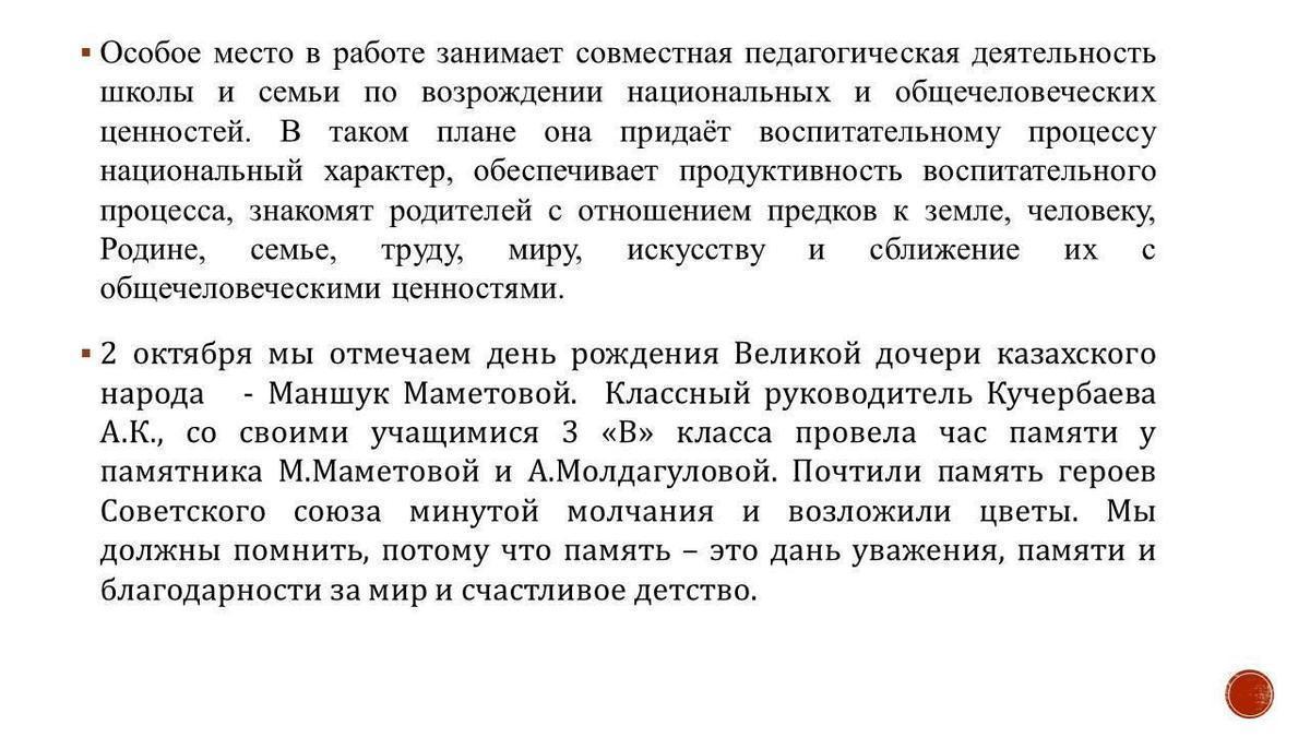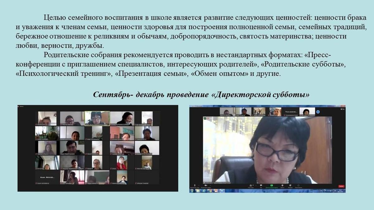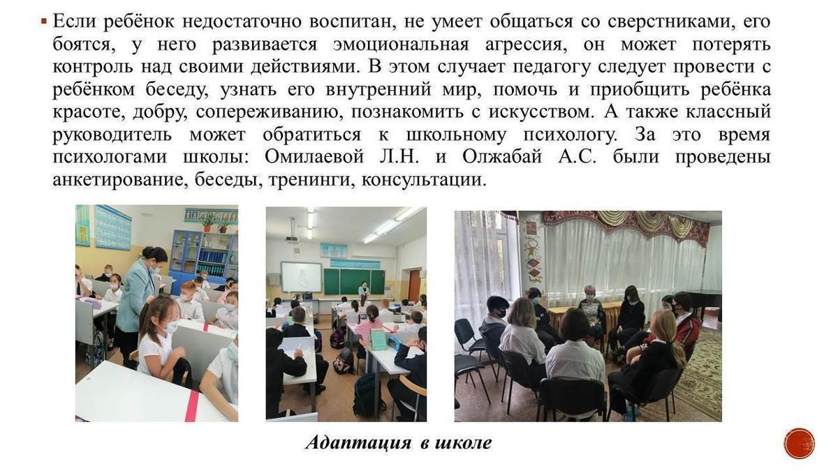 По третьему вопросу слушали зам.директора по ВР – Курманалиеву К.Ж., которая выступила с основным докладом: «Национальные и общечеловеческие ценности – ключевые идеи воспитания учащихся». По плану воспитательной работы были проведены все запланированные мероприятия за I-полугодие этого учебного года. Классные руководители провели 17 классных часов по запланированным темам, с показом презентаций, подготовленных вожатой школы Ябровой И.М., За это время психологами школы: Омилаевой Л.Н. и Олжабай А.С. были проведены анкетирование, беседы, тренинги, консультации. Было проведено 2 родительских собрания в сентябре на тему: “Роль семейных традиций в воспитании подрастающего поколения” и в ноябре “Правомерные способы решения конфликтов в семье”, Принятие в ЕДЮО «Жас Ұлан», учащихся 5-6-х классов. Руководитель школьного музея “Боевой славы” Соколова Н.М. с новым составом экскурсоводов провела экскурсии, для учащихся 1 и 2 классов. 5 “Б” класс посетил школьную комнату О. Сулейменова.