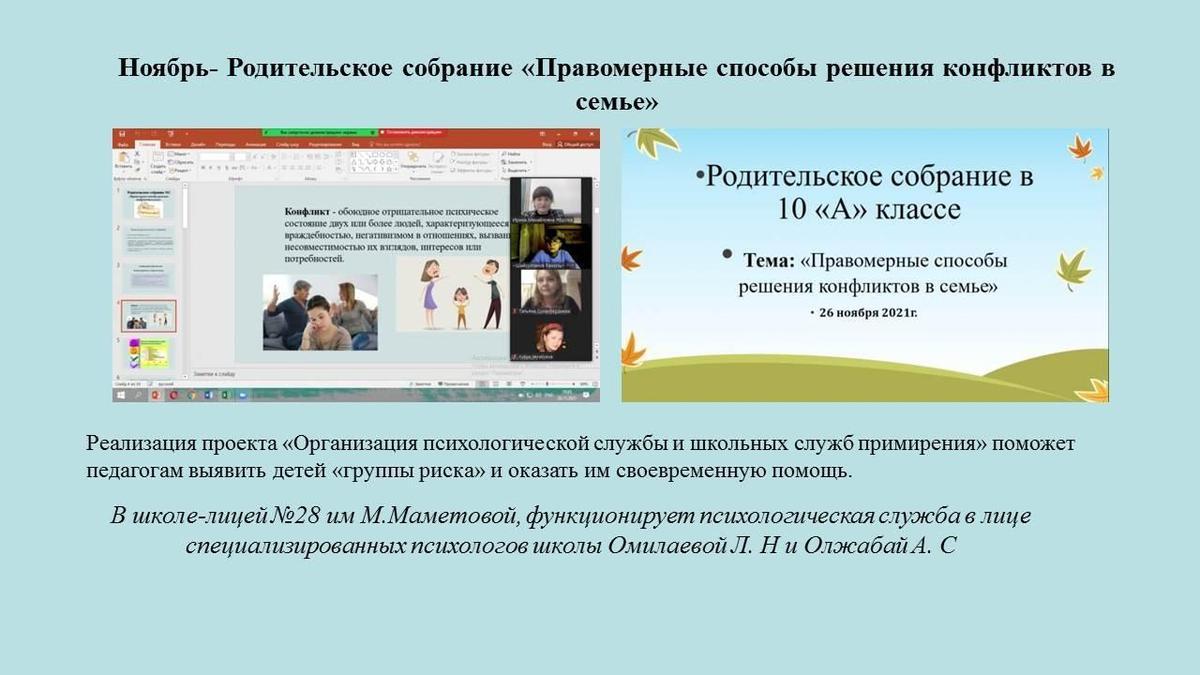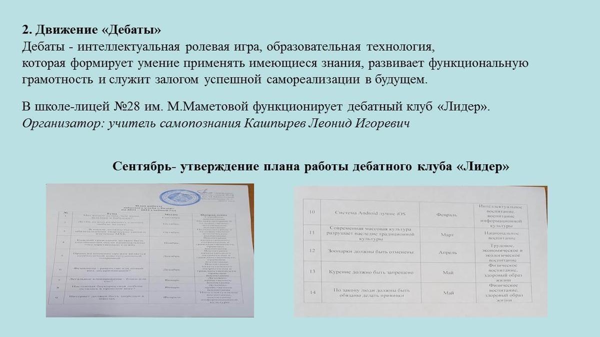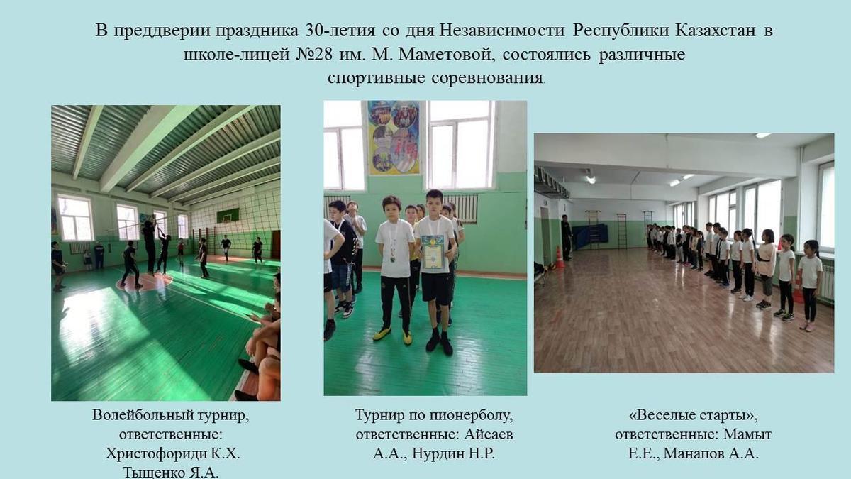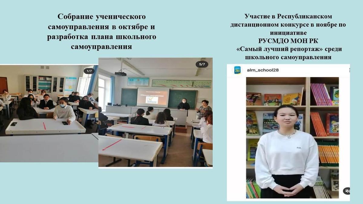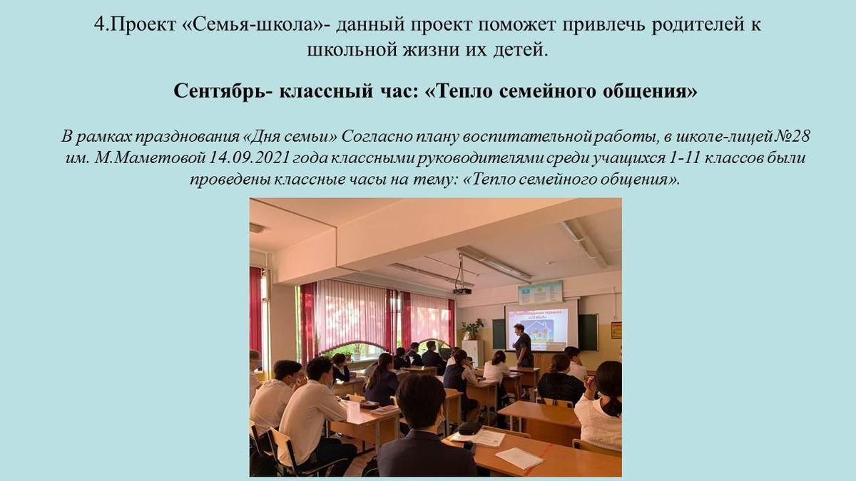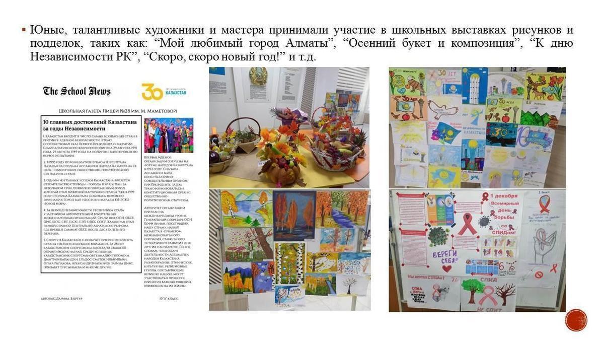 В нашей школе на сегодняшний день активно реализуются: «Школьное самоуправление» - в октябре прошли выборы Президента школы – Ильяс Амина 10 «А» класс; Движение «Дебаты» - В школе-лицей №28 им. М.Маметовой функционирует дебатный клуб «Лидер». Организатор: учитель самопознания Кашпырев Леонид Игоревич, 2 место на районом конкурсе дебатов, посвященных 30-летию независимости, учащиеся 8-х классов прошли курсы по проведению дебатов, Проект «Читающая школа» направлен на решение главной проблемы современного кризиса детского чтения – слабой читательской среды: ребёнок растет в окружении не читающих взрослых. Поэтому решение проблемы лежит в совместных усилиях библиотеки, семьи и школы, в этом году школьная библиотека – модернизировалась, в ней проходят уроки, подготовка к олимпиадам, экскурсии, увеличилась читательская аудитория среди учащихся. Проект «Семья – школа», проходят различные мероприятия к «Дню семьи», родительские гостиные, директорские субботы, родительские собрания, спортивные мероприятия, Реализация проекта «Организация психологической службы и школьных служб примирения» поможет педагогам выявить детей «группы риска» и оказать им своевременную помощь. Проект «Құқықтық сана – қауымға пана» направлен на повышение правовой грамотности, правового сознания и правовой культуры обучающихся. Реализуется в школе через уроки ЧОП, школу Добропорядочности, клуб «Адал ұрпак», организация деятельности военно-патриотических клубов, детско-юношеских движений: «Жас қыран» (1-4 классы), «Жас Ұлан» (5-10 классы). Работа остальных проектов ведется на недостаточном уровне, слабо освещается на сайте и в СМИ.