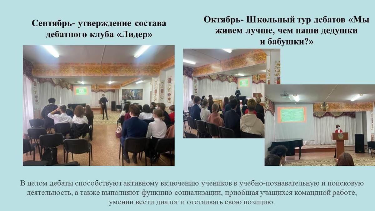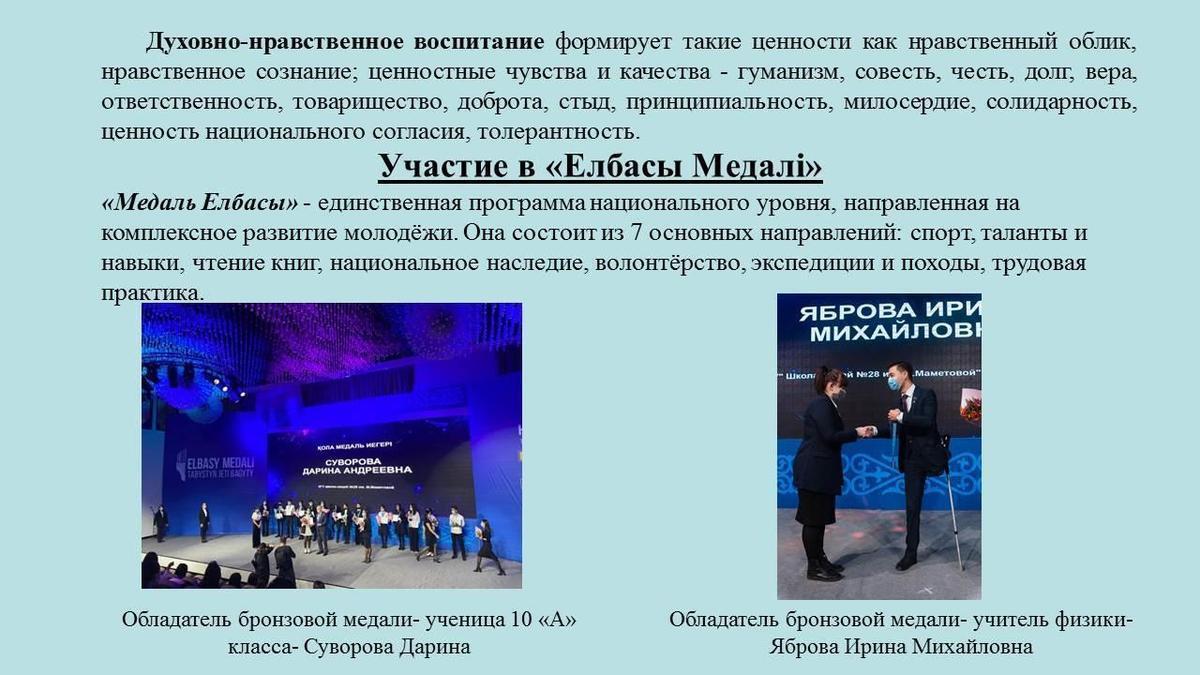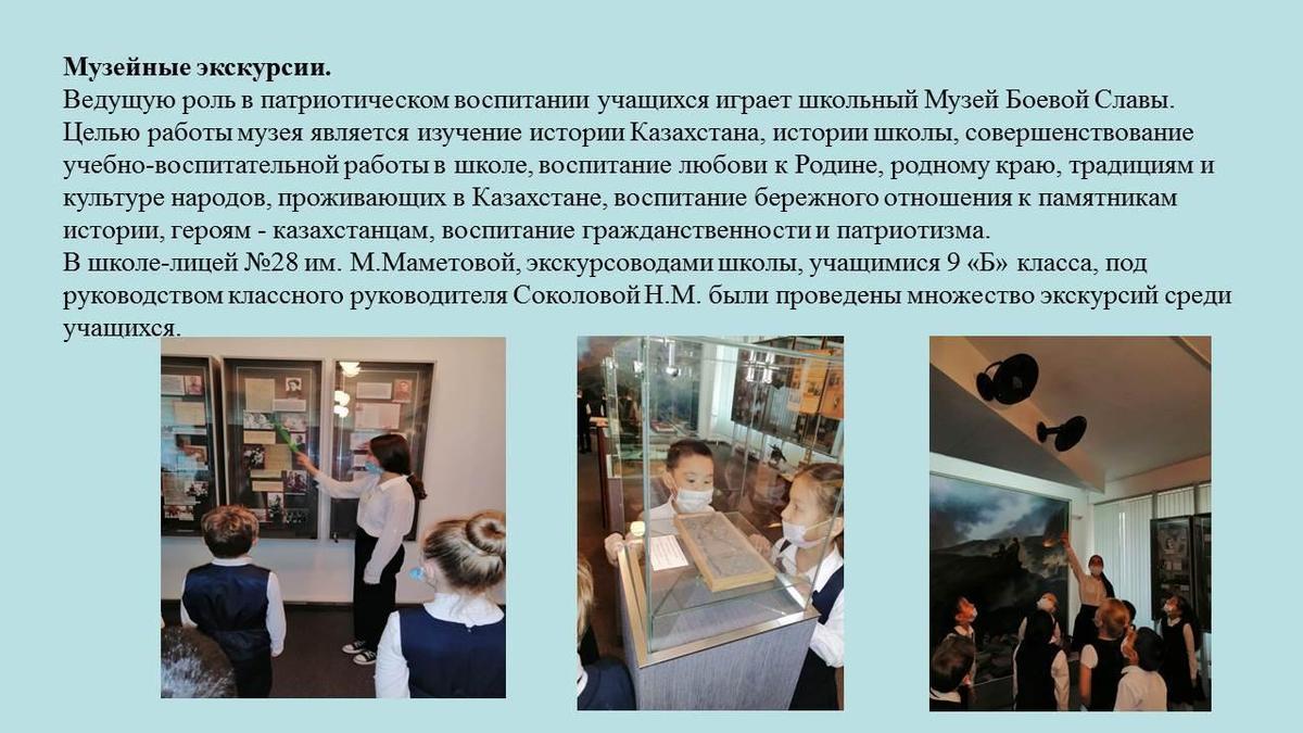Заслушав и обсудив выступление директора школы Медетбековой А.Т., заместителя директора по УВР Ивановой М.В., заместителей директора по ВР Курманалиевой К.Ж., вожатой - Ябровой И.М., педагогический коллектив лицея отметил, что 2021 год для школы стал важным этапом формирования духовно-нравственного воспитания учащихся, определил приоритетные направления работы в соответствии с задачами по обновлению стандартов школьного обучения и воспитания В целях формирования у учащихся лицея гражданственности, патриотизма, духовно-нравственных ценностей, в школе были проведены внеклассные мероприятия, классные часы, круглые столы, открытые уроки. В школьном музее Боевой Славы, Совет Музея во главе с активом учащихся и руководителем Соколовой Н.М., систематически проводят экскурсии для наших учащихся и учащихся города. В музее проводятся классные часы, «Уроки мужества», встречи с ветеранами ВОВ, ВТФ и однополчанами М.Маметовой. Ежегодно члены ВПК «Улан» принимают участие в различных мероприятиях районного, городского, Республиканского значения, конкурсах - смотрах разного уровня, занимая призовые места.