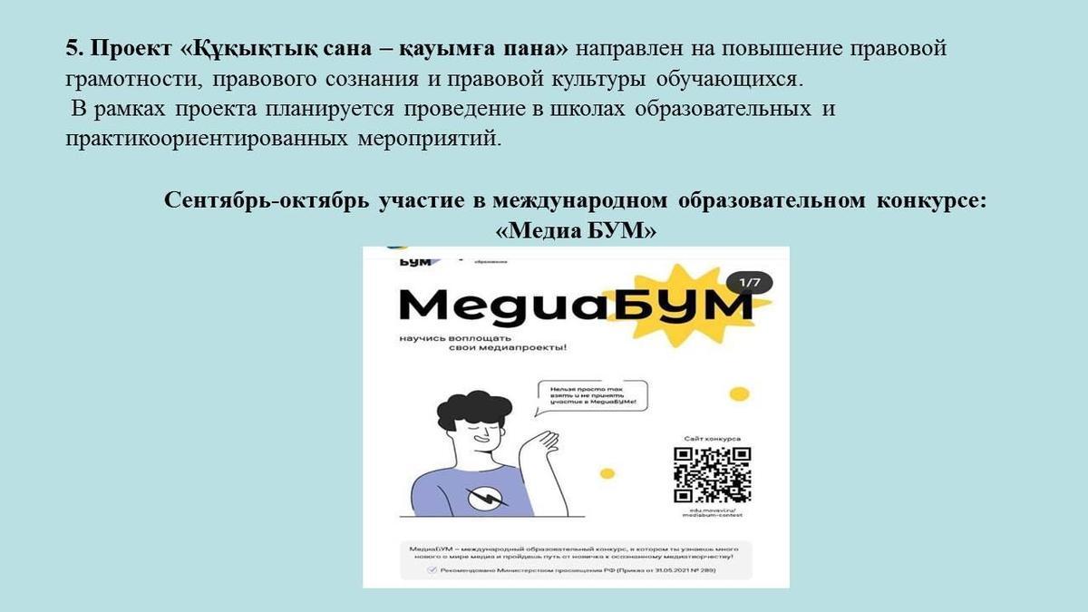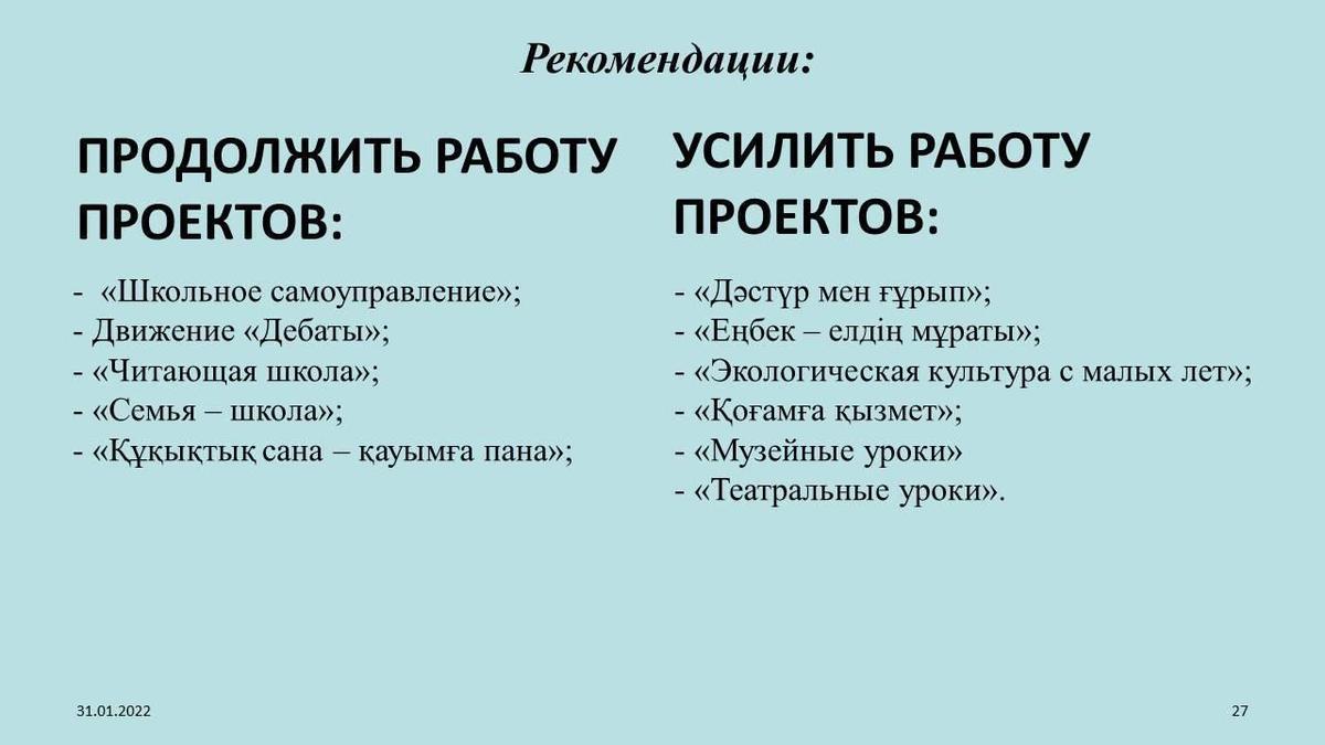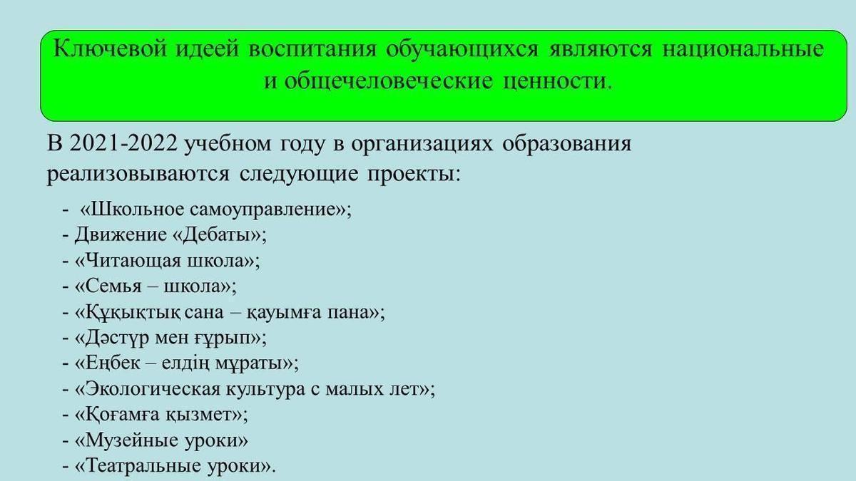 11.Продолжить внедрение в образовательный процесс проектов, рекомендованных МОН РК («Читающая школа», «Дебаты», «День самоуправления», «Школьный театр», «Семья- школа», «Экологическая культура с малых лет», «Музейные уроки», «Құқықтық сана – қауымға пана», «Дәстүр мен ғұрып», «Еңбек – елдің мұраты», «Қоғамға қызмет»).