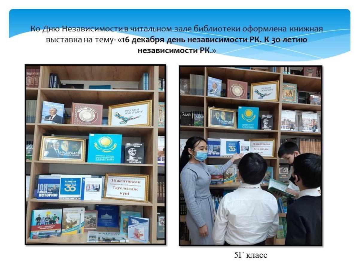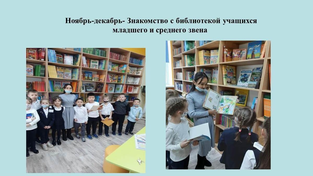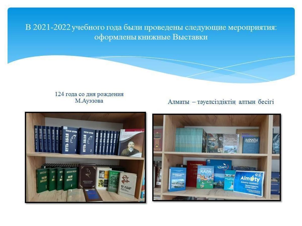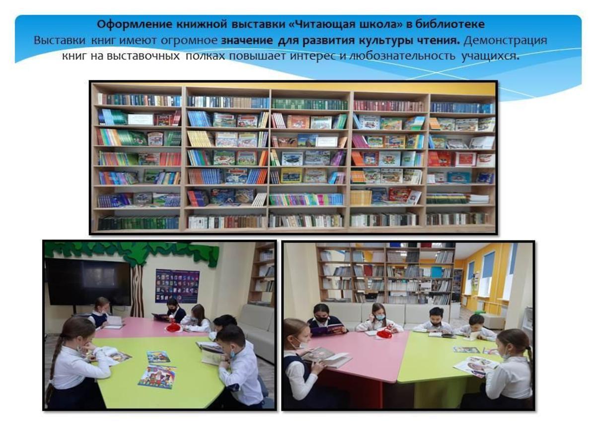 По пятому вопросу слушали зав.библиотекой Акбердинову А.Е., которая дала анализ деятельности библиотеки за 1 полугодие: Общий фонд библиотеки: насчитывает 35 164 экземпляра, 1. художественная литература и энциклопедические словари и справочники – 11934 экземпляров, 2. Учебники- 23230 зкз, 3. Оформлена подписка на периодические издания – 23 наименований журналов и газет. В библиотеке проходят следующие мероприятия: книжные выставки к знаменательным датам, День знаний, Знакомство с библиотекой учащимися 1-х классов, день языков народов Казахстана «Два языка-два крыла», Международный день словарей и энциклопедий «Мои помощники словари», экскурсия с учащимися 5а, 5б-классов под руководством учителя казахского языка Жайлыбаева Ботагоз Утеповна. Книжная выставка «Читающая школа» в библиотеке Выставки книг имеют огромное значение для развития культуры чтения.