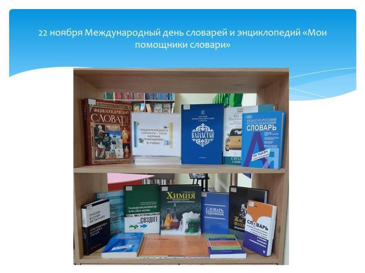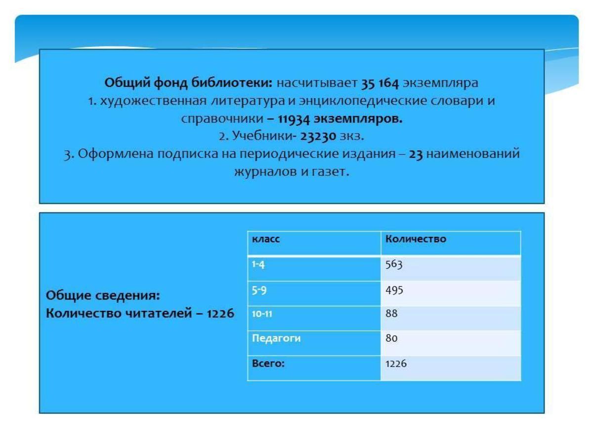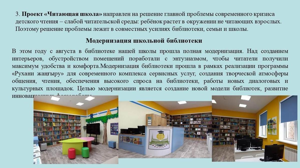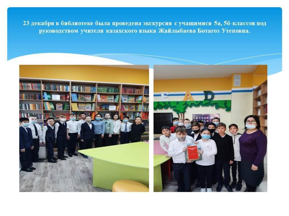 По пятому вопросу слушали зав.библиотекой Акбердинову А.Е., которая дала анализ деятельности библиотеки за 1 полугодие: Общий фонд библиотеки: насчитывает 35 164 экземпляра, 1. художественная литература и энциклопедические словари и справочники – 11934 экземпляров, 2. Учебники- 23230 зкз, 3. Оформлена подписка на периодические издания – 23 наименований журналов и газет. В библиотеке проходят следующие мероприятия: книжные выставки к знаменательным датам, День знаний, Знакомство с библиотекой учащимися 1-х классов, день языков народов Казахстана «Два языка-два крыла», Международный день словарей и энциклопедий «Мои помощники словари», экскурсия с учащимися 5а, 5б-классов под руководством учителя казахского языка Жайлыбаева Ботагоз Утеповна. Книжная выставка «Читающая школа» в библиотеке Выставки книг имеют огромное значение для развития культуры чтения.
