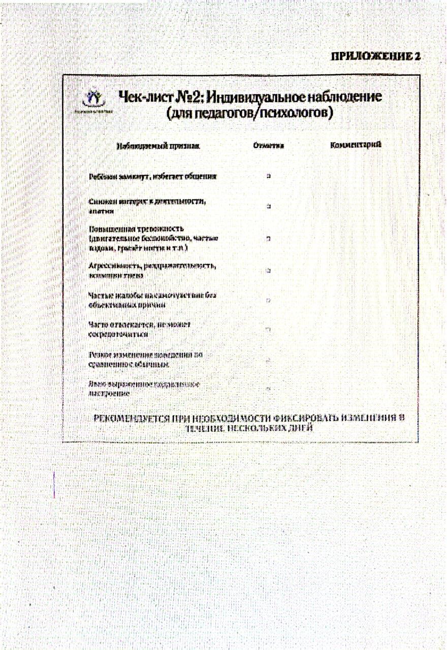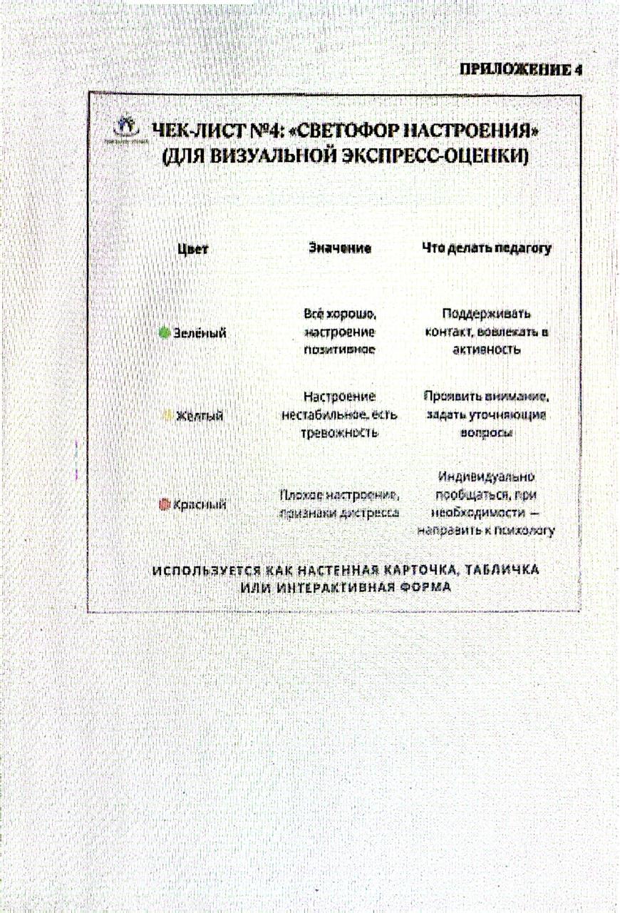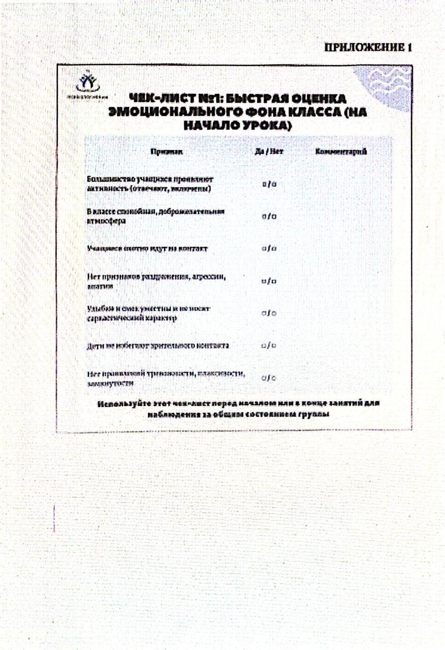 11 қараша 2025 0 1 2 3 4 5 Тексеру тізімдері/Чек-листы Мен Алматы қалалық білім беру басқармасының «Психологиялық қолдау орталығы» мемлекеттік мекемесінің (бұдан әрі – ПҚО) хатына келісемін, қауіпсіз білім беру ортасын қамтамасыз ету және оқушылардың эмоционалдық күйзелісін уақтылы анықтау мақсатында ақпараттық және әдістемелік материалдар ұйымның сынып жетекшілеріне, мұғалімдеріне және психологтарына жеткізілді.Согласна письма КГУ "Центр психологической поддержки" Управления образования г.Алматы (далее ЦПП) в целях обеспечения безопасной образовательной среды и своевременного выявления эмоционального неблагополучия обучающихся, информация и методические материалы доведены до сведения классных руководителей, педагогов, психологов организации
