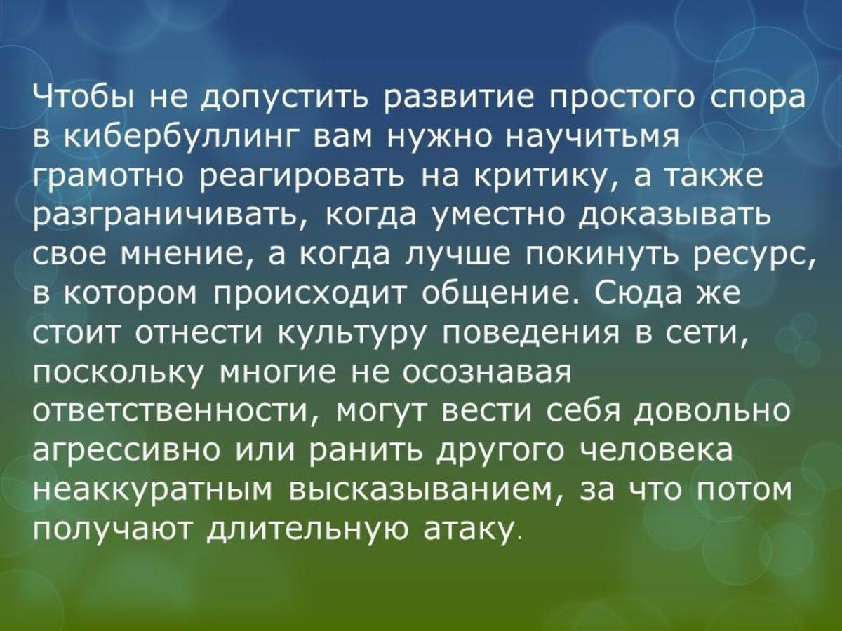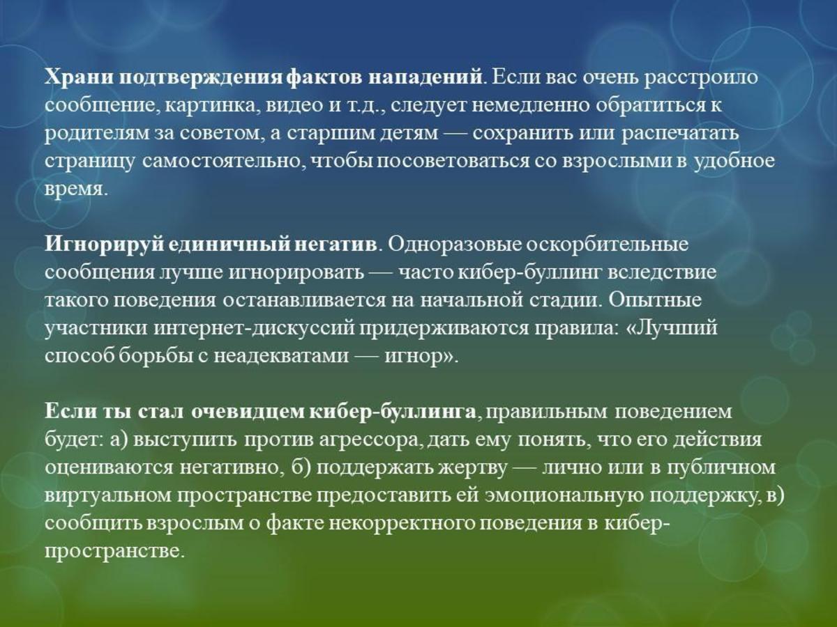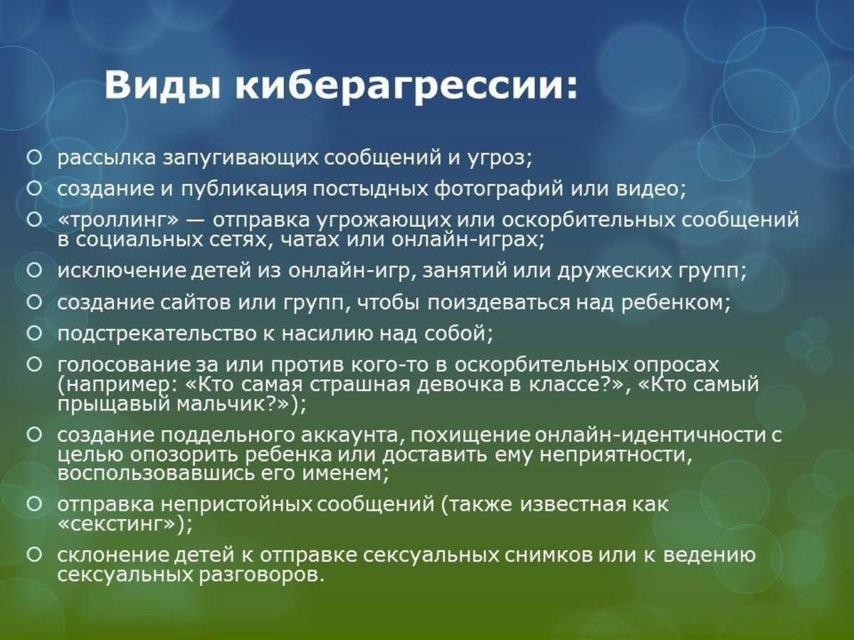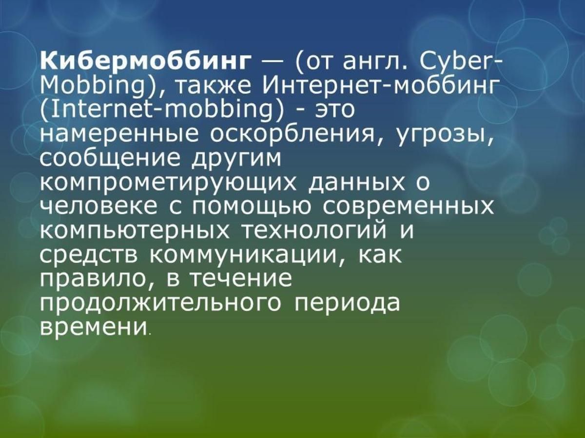 Кибербуллинг — общее название для разных способов психологического давления, агрессии или издевательств в интернете. Он может происходить на сайтах, в социальных сетях, чатах и форумах, в мессенджерах, по почте и даже СМС.