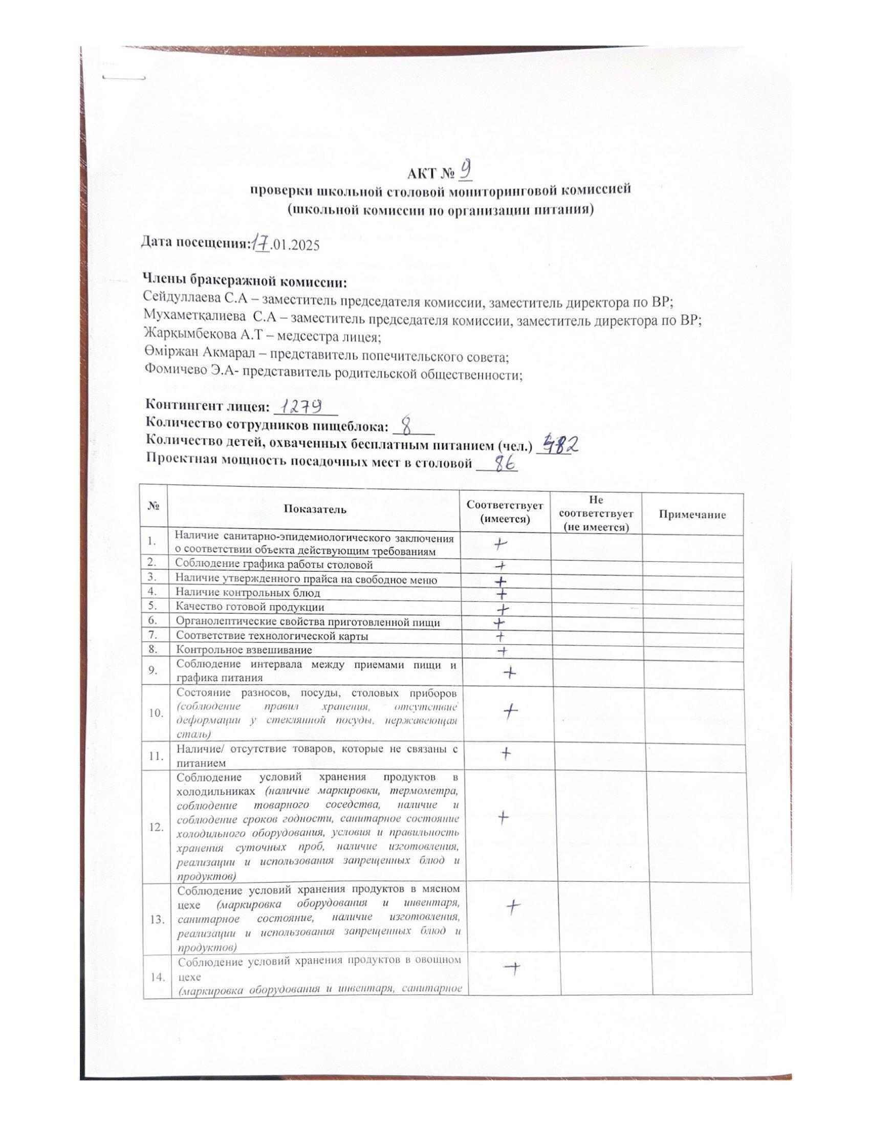 17 қаңтар 2025 0 1 2 3 4 5 № 9 Мектеп асханасын тексеру актісі /Акт №9 проверки школьной столовой мониторинговой комиссией
