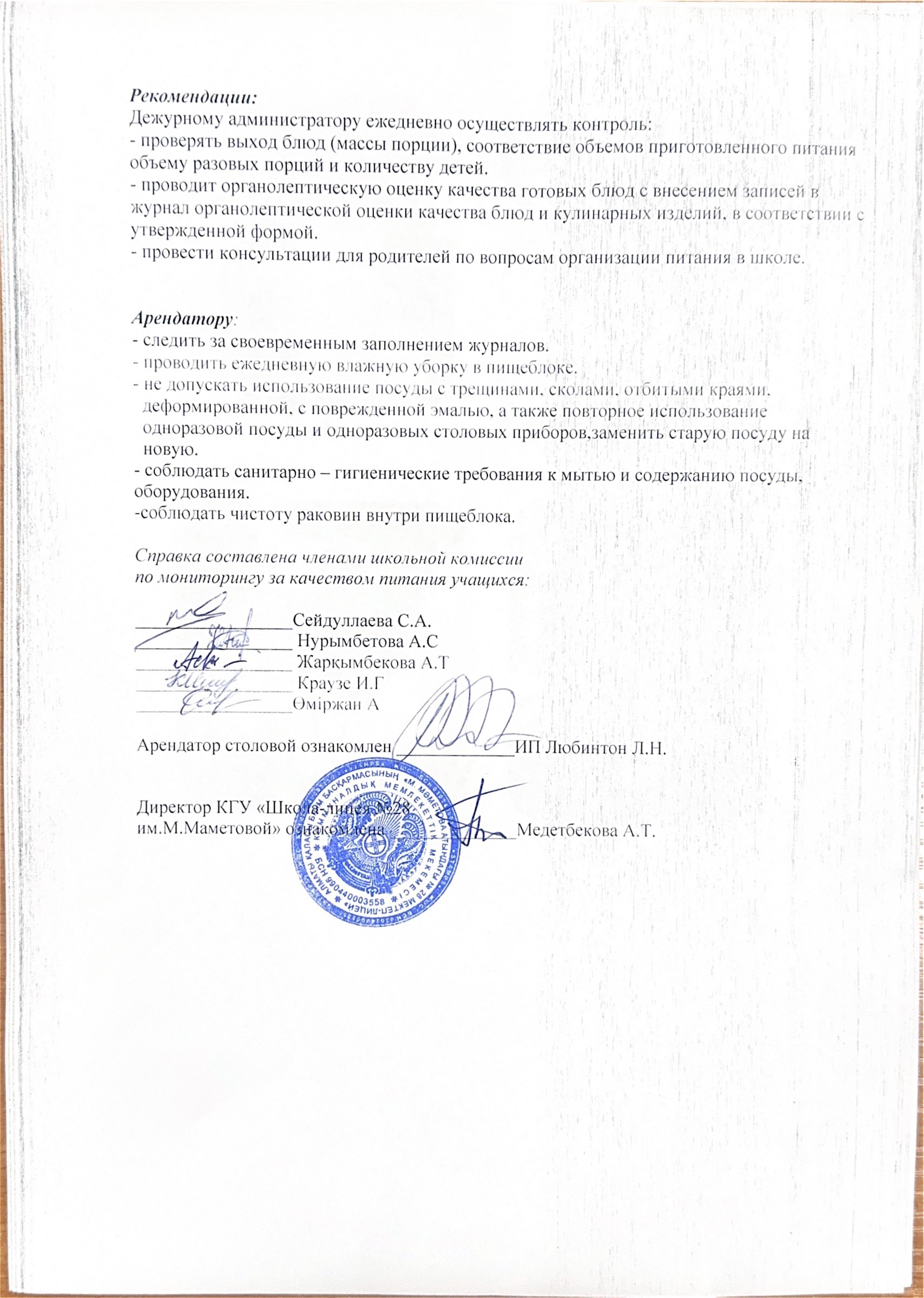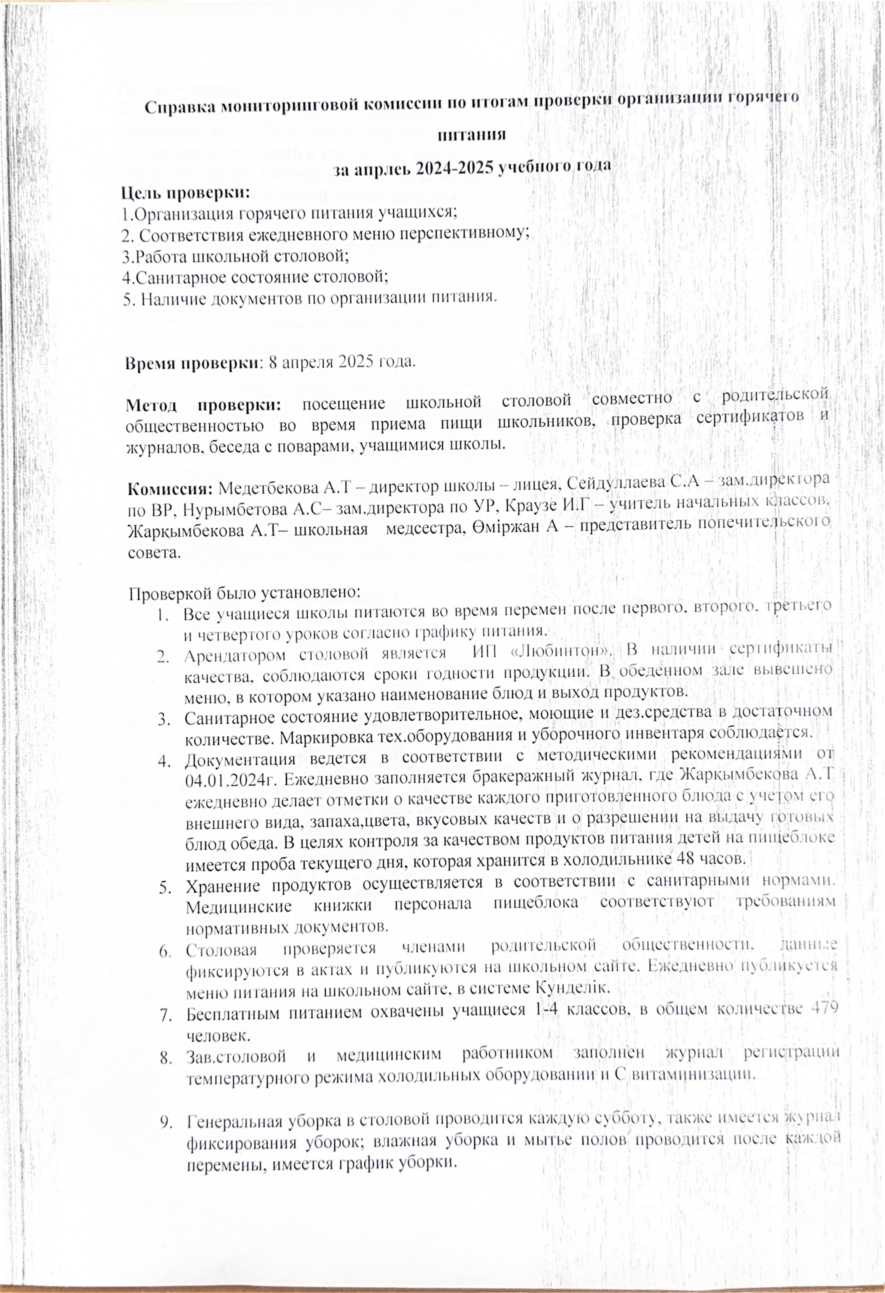 КГУ «Школа-лицей №28 им.М.Маметовой» » Тамақтандыру » Сауір айындағы ыстық тамақтандыру бойынша мониторинг комиссиясының анықтамасы/ Справка мониторинговой комиссии по организации горячего питания за апрель