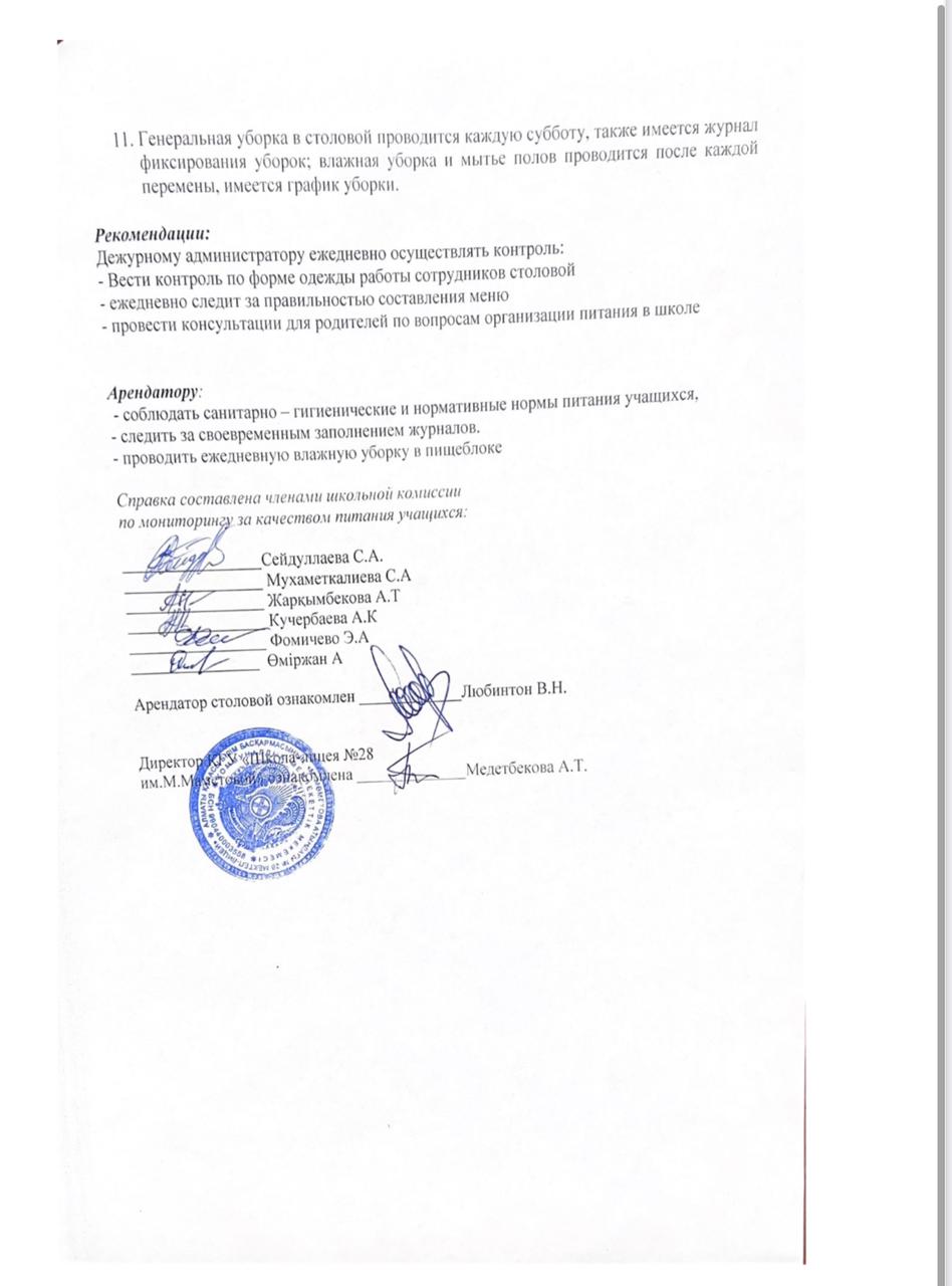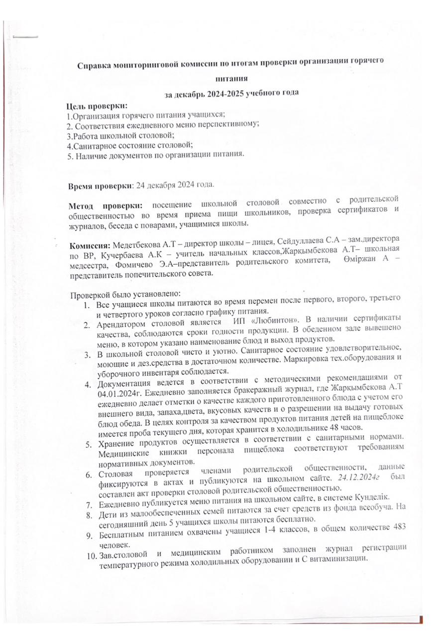 КГУ «Школа-лицей №28 им.М.Маметовой» » Тамақтандыру » Желтоқстан айындағы ыстық тамақтандыру бойынша мониторинг комиссиясының анықтамасы/ Справка мониторинговой комиссии по организации горячего питания за декабрь