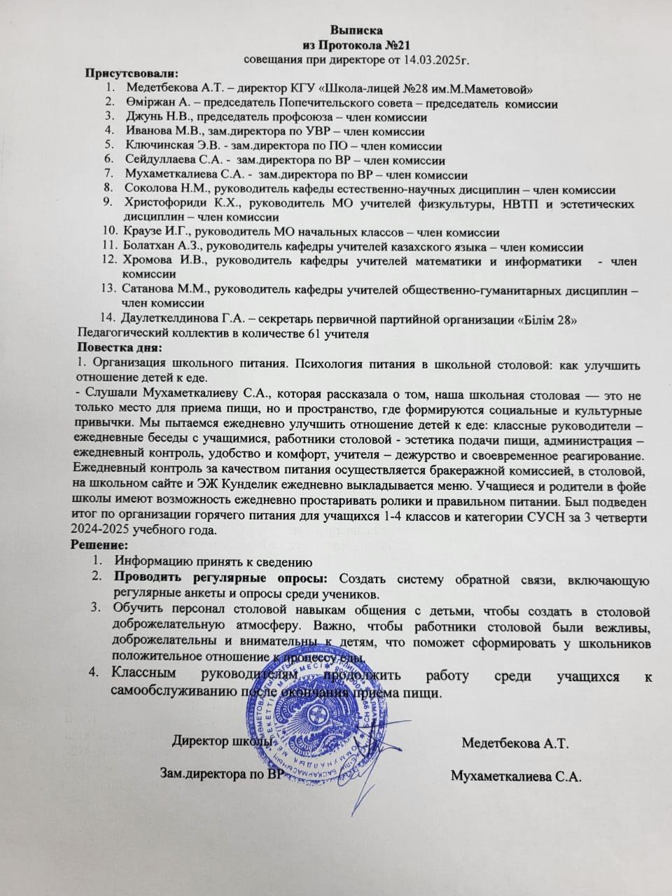 14 наурыз 2025 0 1 2 3 4 5 № 21 хаттамадан үзінді директормен кездесу 14.03.2025 ж. "Мектептегі тамақтануды ұйымдастыру. Мектеп асханасында тамақтану психологиясы: балалардың тағамға деген көзқарасын қалай жақсартуға болады".