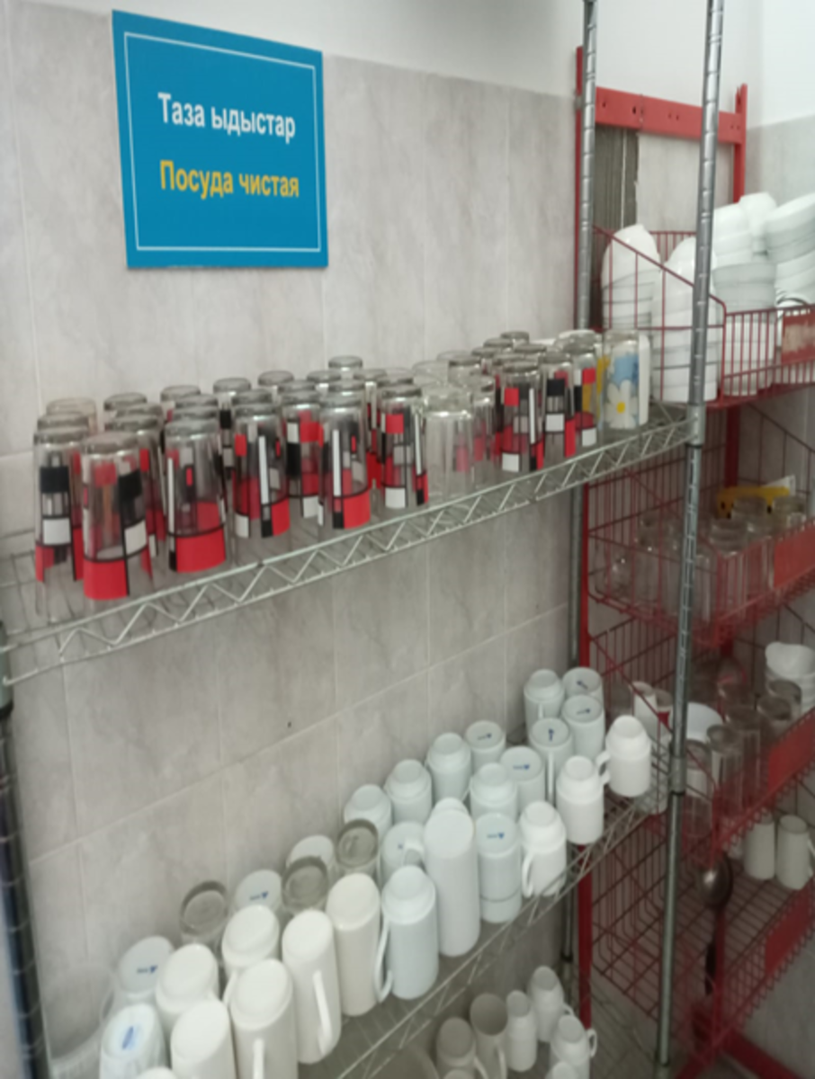 Столовая обеспечена достаточным количеством столовой посуды и приборами. При организации питания используется посуда, отвечающей требованиям безопасности для материалов, контактирующих с пищевыми продуктами. Столовые приборы (ложки, вилки), посуда для приготовления и хранения готовых блюд изготовлены из нержавеющей стали. Уборка обеденных залов проводится после каждого приема пищи. Обеденные столы моют горячей водой с добавлением моющих средств, используя специально выделенную ветошь и промаркированную тару для чистой и использованной ветоши. Моющие и дезинфицирующие средства хранят в таре изготовителя в специально отведенных местах, недоступных для обучающихся, отдельно от пищевых продуктов.