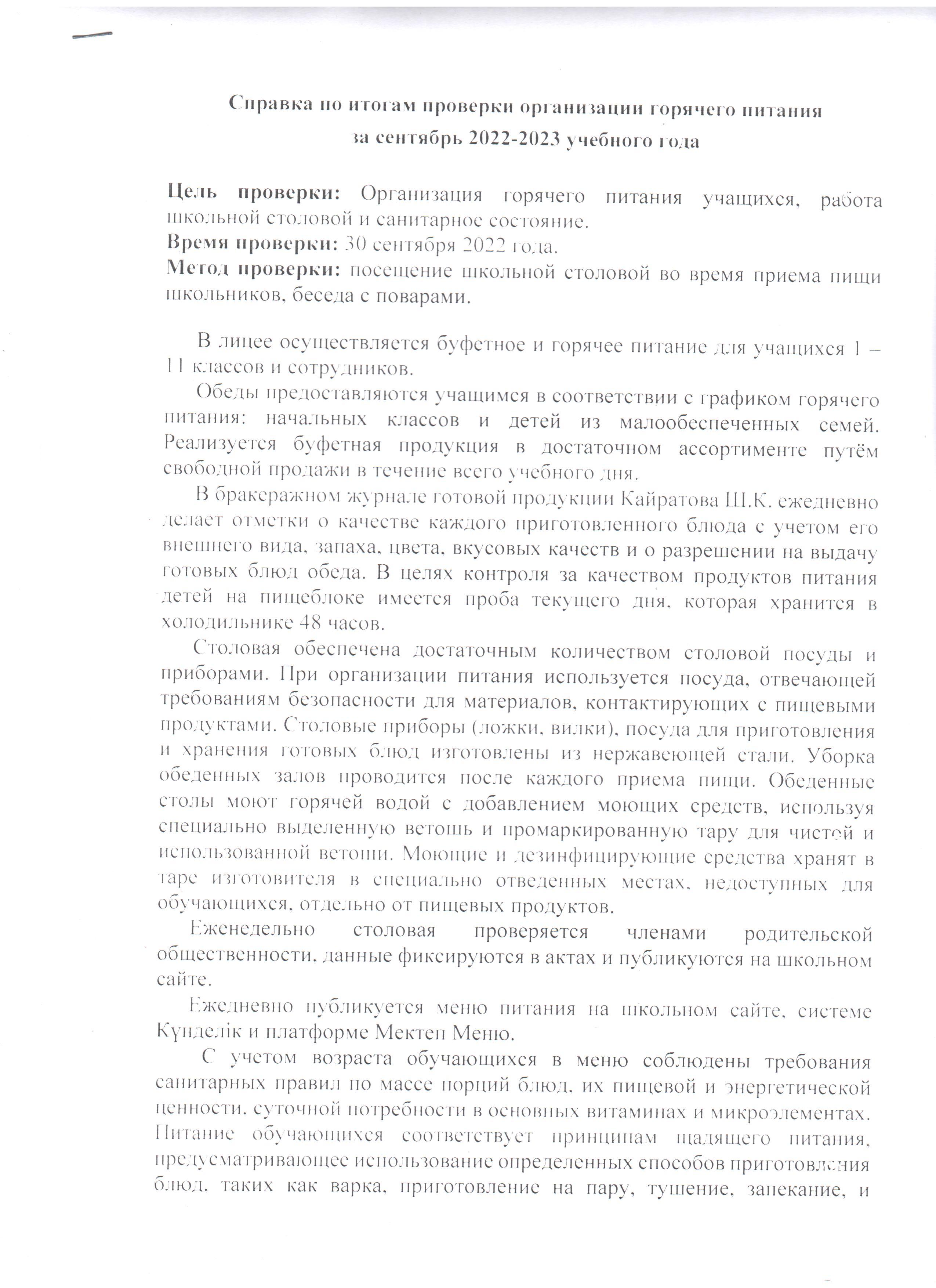 30 қыркүйек 2022 0 1 2 3 4 5 2022-2023 оқу жылына қыркүйек айындағы ыстық тамақтандыру бойынша анықтама/Справка по итогам проверки организации горячего питания за сентябрь 2022-2023 учебного года